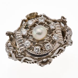 212/877 Gr. Uhren-Ring m. Perle u. Brillanten, 2. Hälfte 20. Jh.
