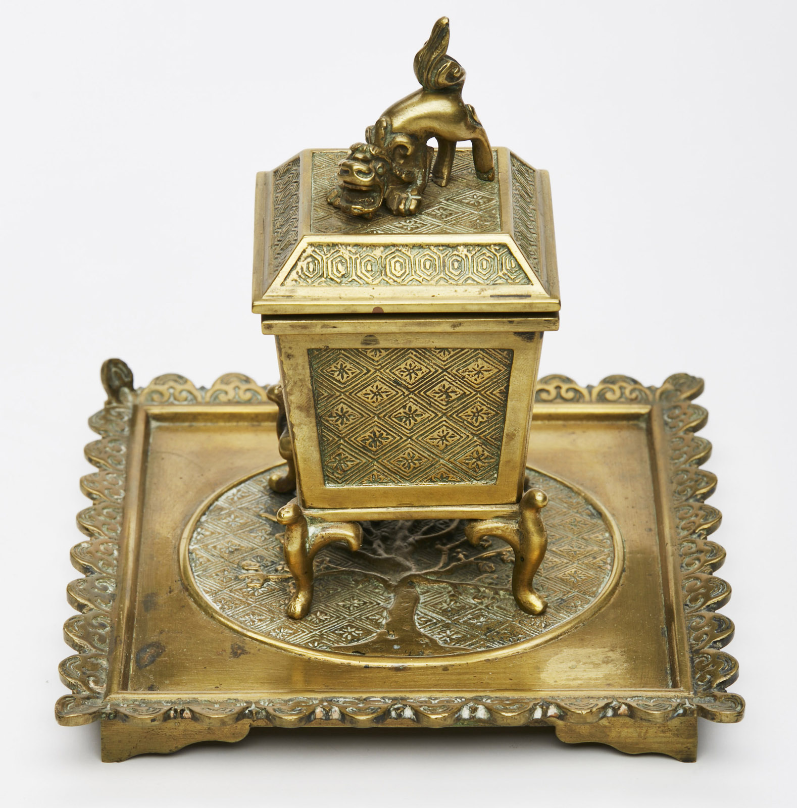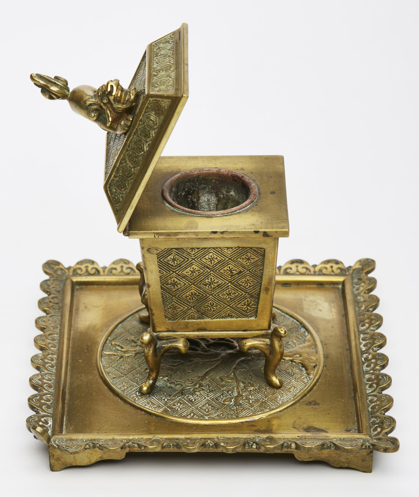Bronze. Quadrat. Tableau m. gewelltem Rand, darauf mittig über Medaillon m. Baum-Motiv quadrat. Behälter in leicht kon. Form auf hohen, geschwungenen Beinchen. Klappdeckel m. gr. Drachen-Knauf. Wandung u. Medaillon-Hintergrund jew. m. feinem Rauten-Relief. Innen Einsatz f. Tinte. Am Tableau-Boden quadrat. Reliefmarke m. 6 Zeichen. Oberfläche berieben, 1 Tableau-Ecke verbogen, Deckel leicht klaffend, Tinten-Einsatz leicht korrodiert. H 15,2 cm