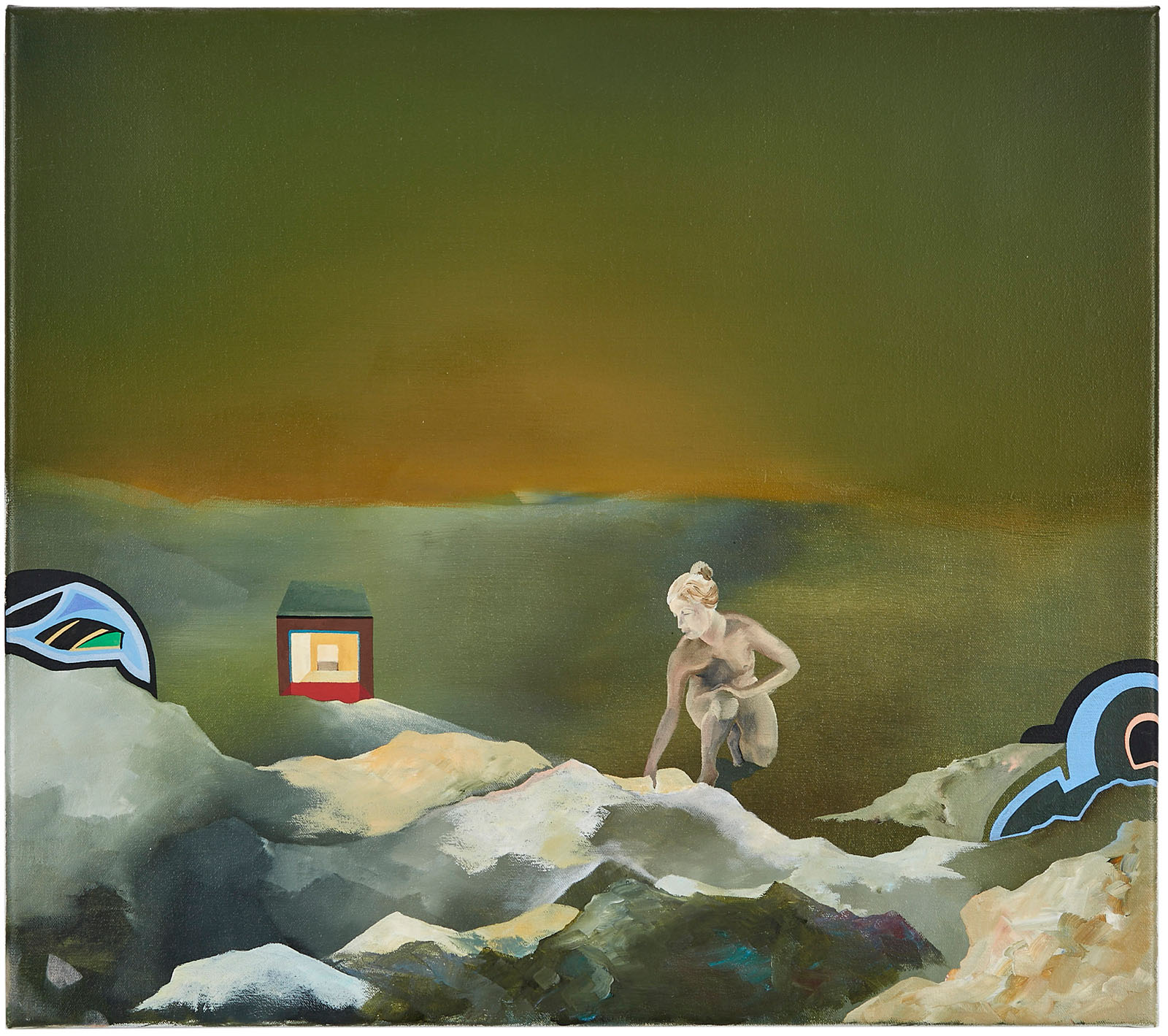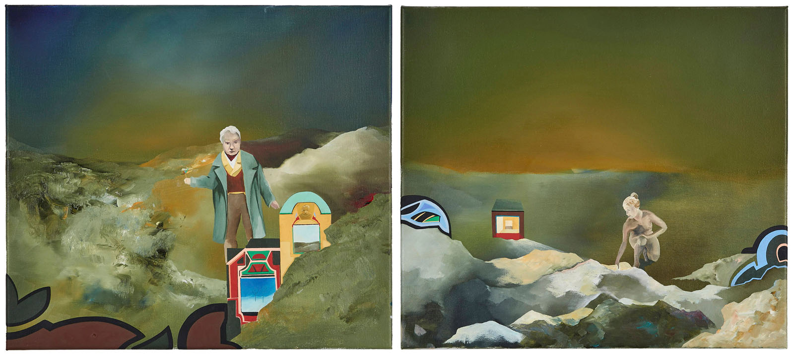 geb. 1979 Kristianstad/Schweden „Man in green jacket & Naked woman on mountain“ 2012 je verso monogr. u. dat. HM 12 Öl/Lwd., je 40 x 40 cm, o. R.
