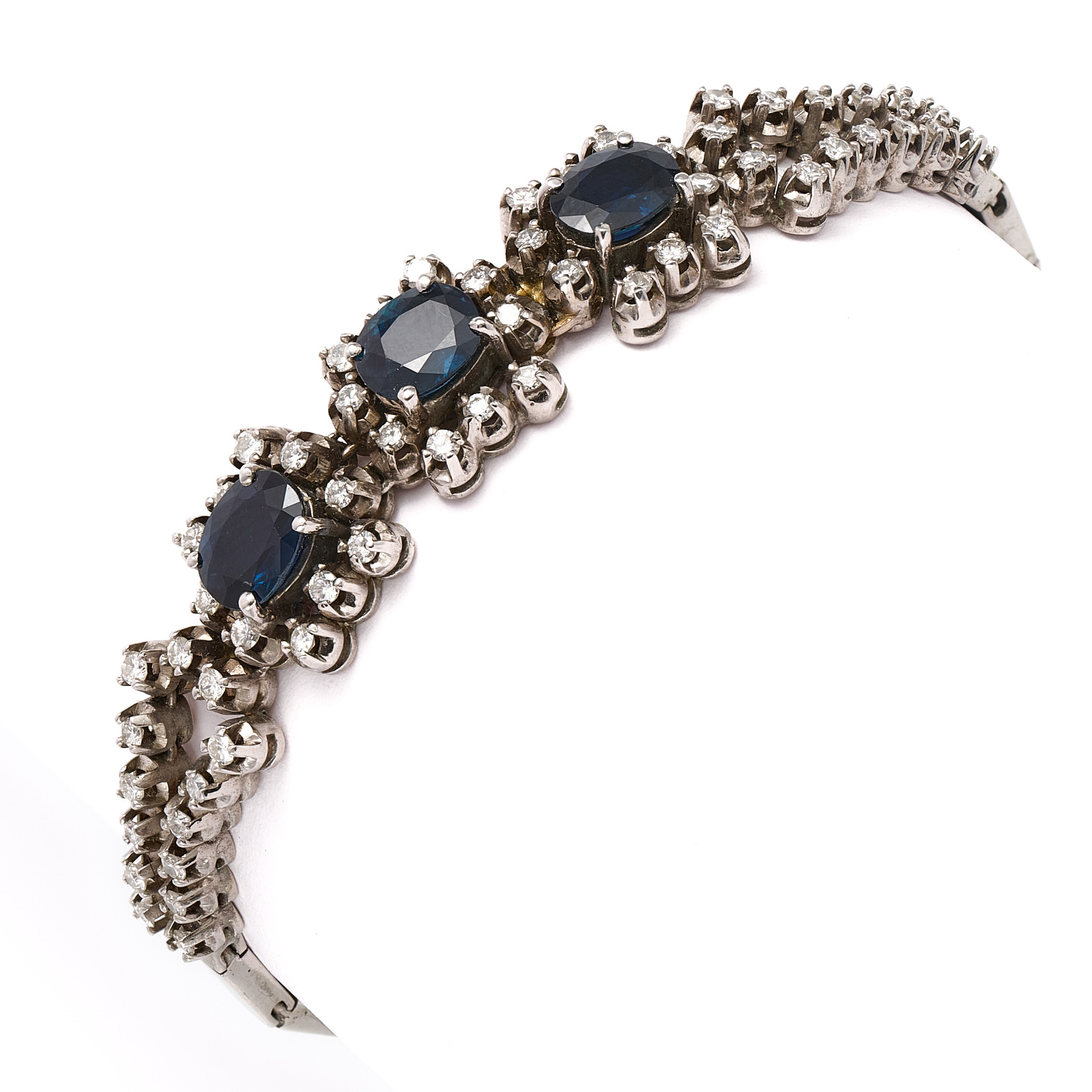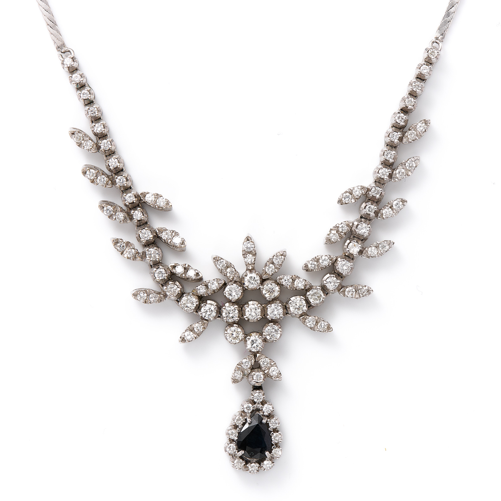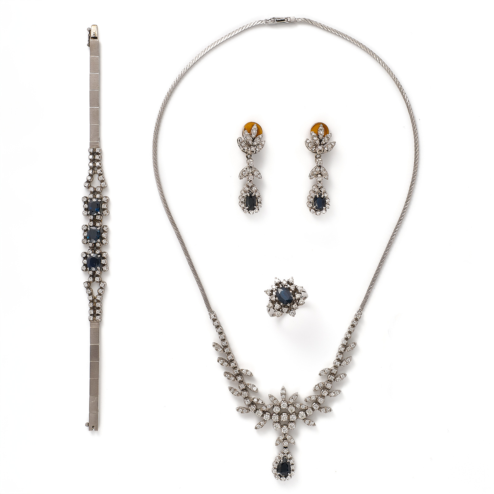 14 kt WG, insg. besetzt m. 7 Saphiren v. zus. ca. 5,10 ct u. 250 kl. Brillanten v. zus. ca. 4,50 ct. Bestehend aus 1 Collier, 1 Ring, 1 Armband u. 1 Paar Ohrhängern als Clips. Collier: floraler Mittelteil m. 1 tropfenförm. facettierten Saphir v. ca. 0,66 ct u. 104 Brillanten v. zus. ca. 2 ct. Satiniertes Collier in Kordeloptik. Kastenschloss m. Sicherheitsverschluss. L 43,5 cm. Ring: mittig m. 1 oval facettierten Saphir v. ca. 1,25 ct umgeben v. 16 Brillanten v. zus. ca. 0,50 ct. Florale Ausarbeitung. Schmale polierte Ringschiene. RG 50. Armband: floraler Mittelteil m. 3 oval facettierten Saphiren v. zus. ca. 2,25 ct u. 58 Brillanten v. zus. ca. 1 ct. Armband in satinierter Backsteinoptik. Kastenschloss m. Sicherheitsverschluss. L 16,6 cm. Ohrhänger: m. insg. 2 oval facettierten Saphiren v. zus. ca. 1 ct u. 72 Brillanten v. zus. ca. 1 ct. Florale Ausarbeitung. Hängeelemente abnehmbar. L 3,9 cm. Insg. 56,9 g. Orig. Gutachten v. Juw. Carl Theobald, Frankfurt 1985. Gebrauchsspuren.