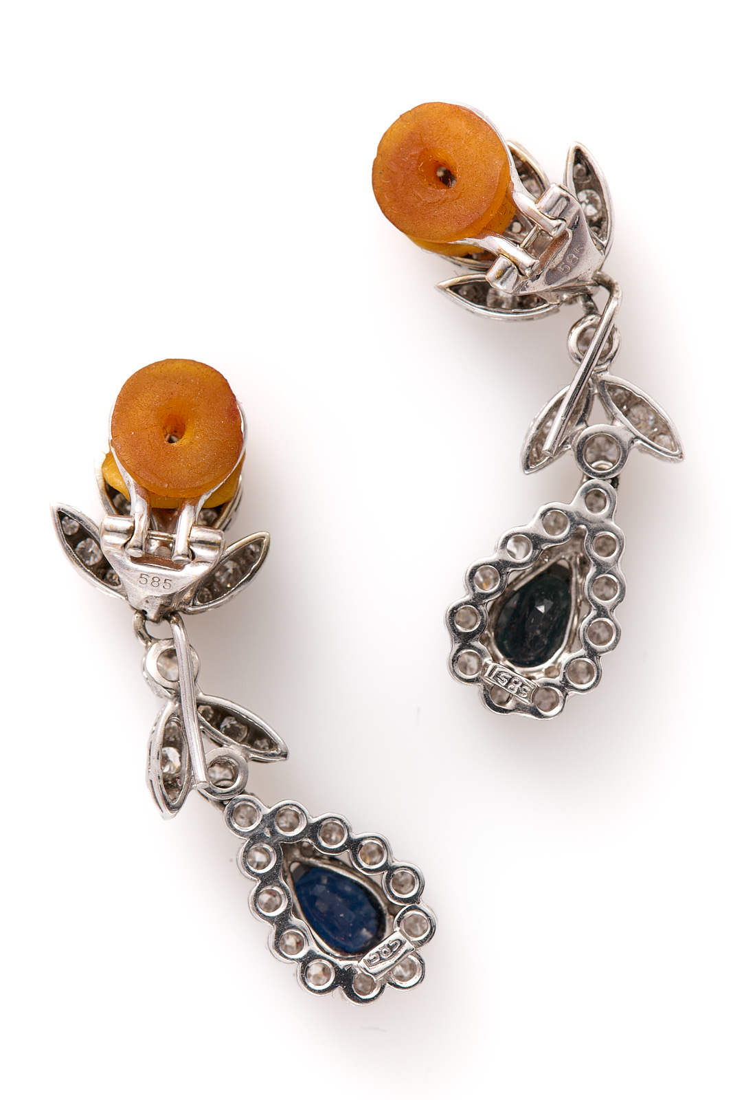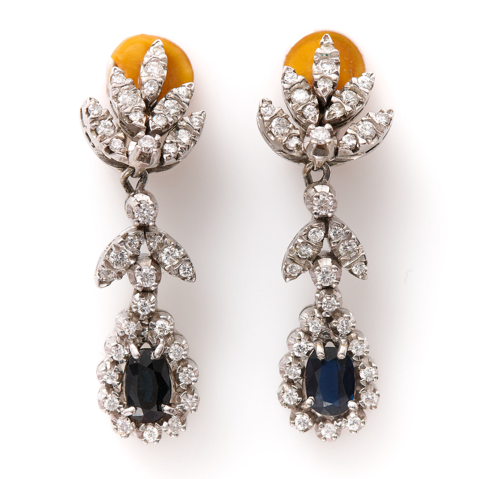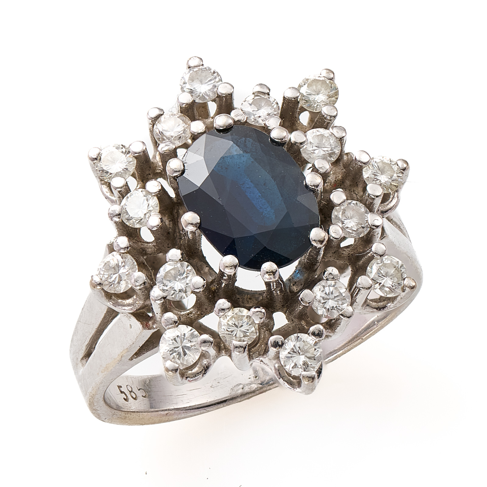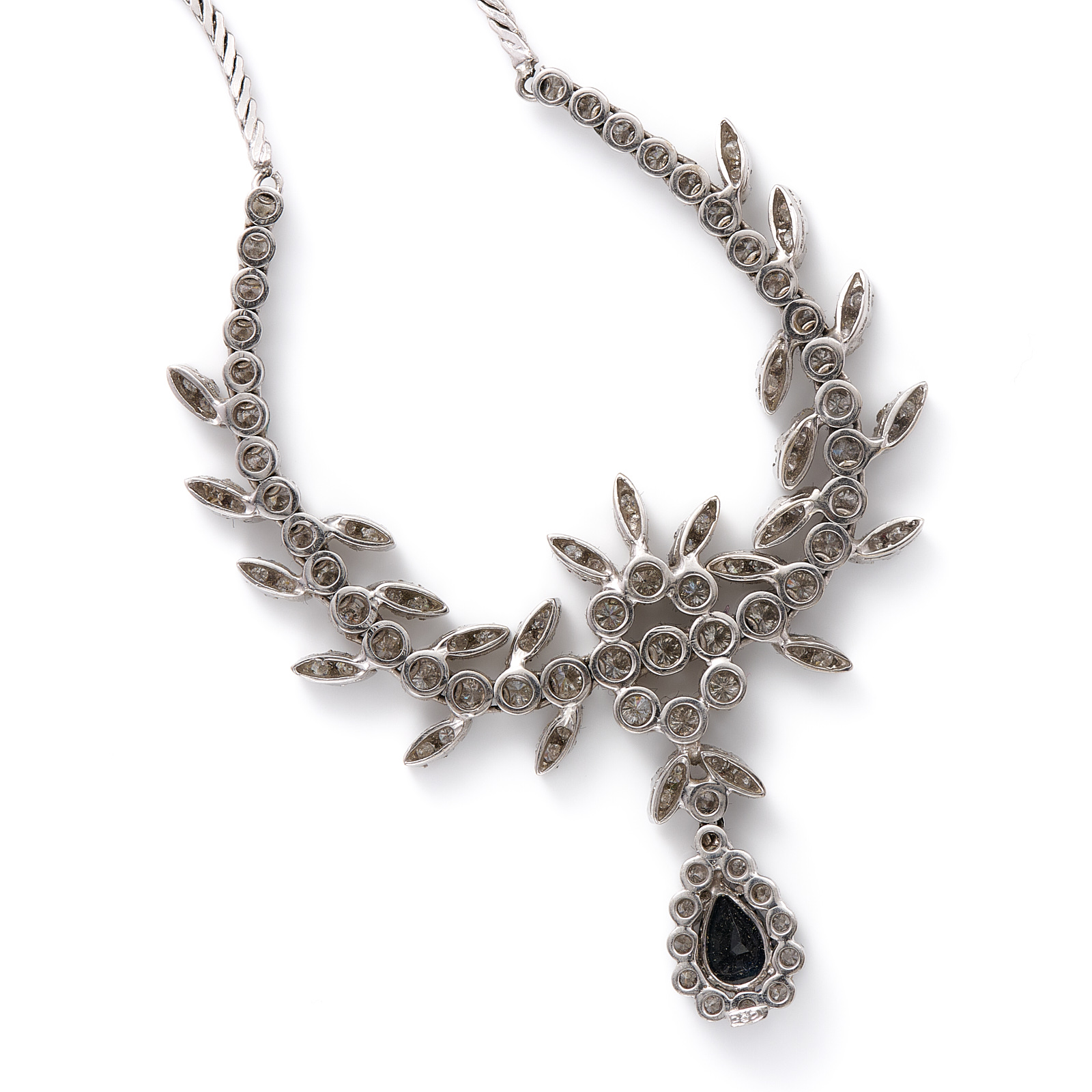 14 kt WG, insg. besetzt m. 7 Saphiren v. zus. ca. 5,10 ct u. 250 kl. Brillanten v. zus. ca. 4,50 ct. Bestehend aus 1 Collier, 1 Ring, 1 Armband u. 1 Paar Ohrhängern als Clips. Collier: floraler Mittelteil m. 1 tropfenförm. facettierten Saphir v. ca. 0,66 ct u. 104 Brillanten v. zus. ca. 2 ct. Satiniertes Collier in Kordeloptik. Kastenschloss m. Sicherheitsverschluss. L 43,5 cm. Ring: mittig m. 1 oval facettierten Saphir v. ca. 1,25 ct umgeben v. 16 Brillanten v. zus. ca. 0,50 ct. Florale Ausarbeitung. Schmale polierte Ringschiene. RG 50. Armband: floraler Mittelteil m. 3 oval facettierten Saphiren v. zus. ca. 2,25 ct u. 58 Brillanten v. zus. ca. 1 ct. Armband in satinierter Backsteinoptik. Kastenschloss m. Sicherheitsverschluss. L 16,6 cm. Ohrhänger: m. insg. 2 oval facettierten Saphiren v. zus. ca. 1 ct u. 72 Brillanten v. zus. ca. 1 ct. Florale Ausarbeitung. Hängeelemente abnehmbar. L 3,9 cm. Insg. 56,9 g. Orig. Gutachten v. Juw. Carl Theobald, Frankfurt 1985. Gebrauchsspuren.
