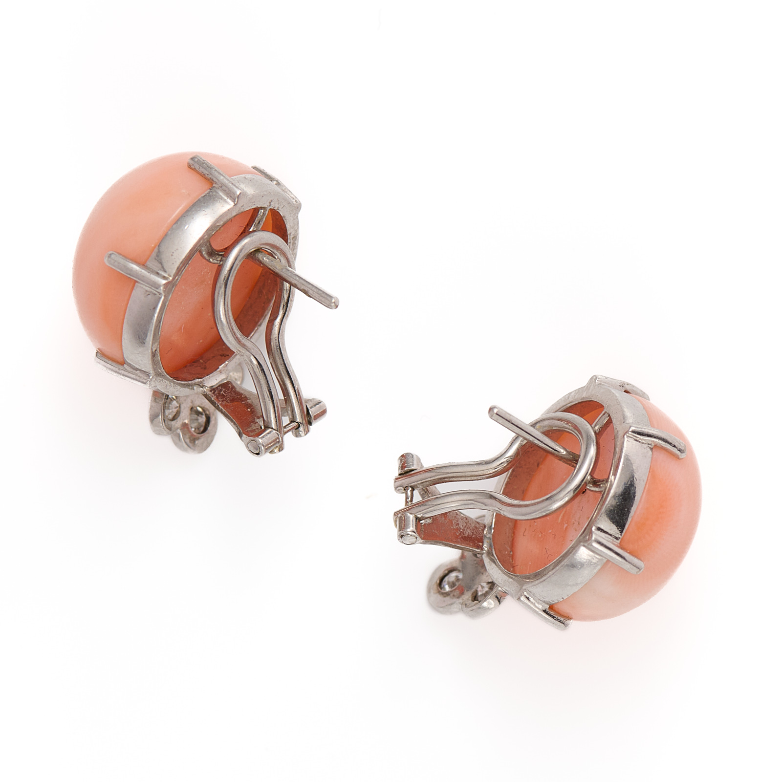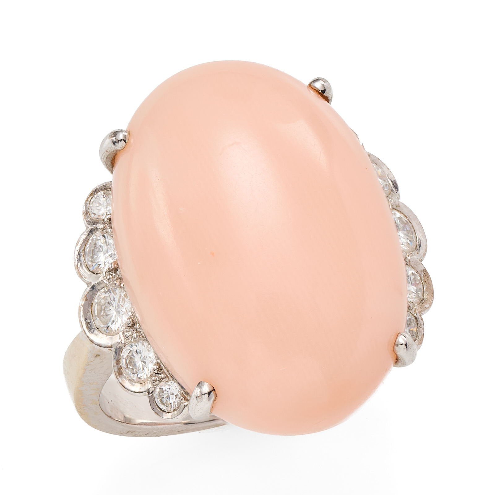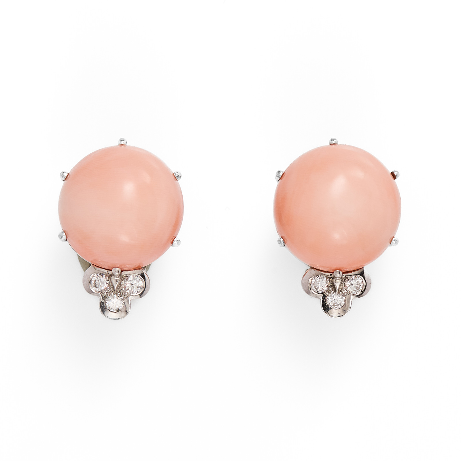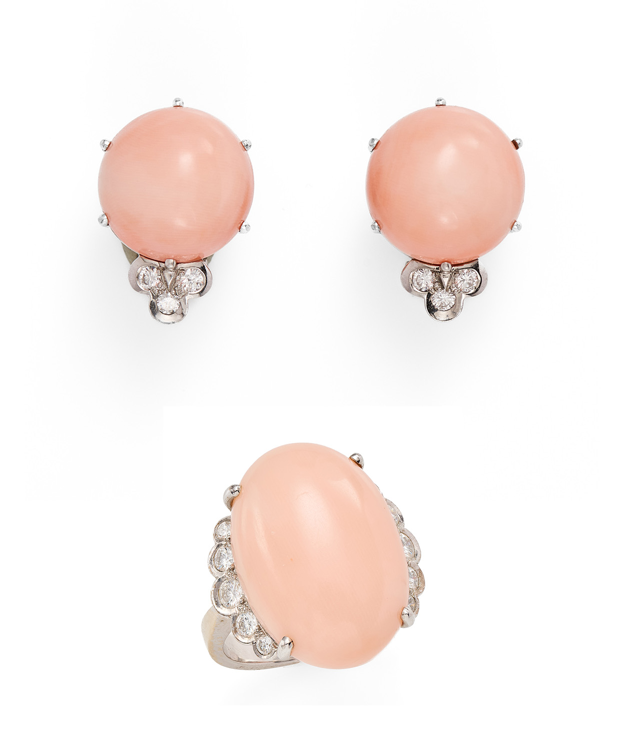 18 kt WG, insg. besetzt m. 3 Engelshautkorallen u. 16 Brillanten v. zus. ca. 0,60 ct. Bestehend aus 1 Ring u. 1 Paar Ohrstecker. Ring: mittig m. 1 gr. ovalen Engelshautkorallen-Cabochon (D ca. 21 mm) flankiert v. 10 Brillanten. Schmale polierte Ringschiene. RG 55. Ohrstecker: jew. m. 1 rd. Engelshautkorallen-Cabochon (D ca. 14 mm) u. 3 kl. Brillanten. Insg. 21,5 g. WG teils minim. berieben, minim. Gebrauchsspuren.