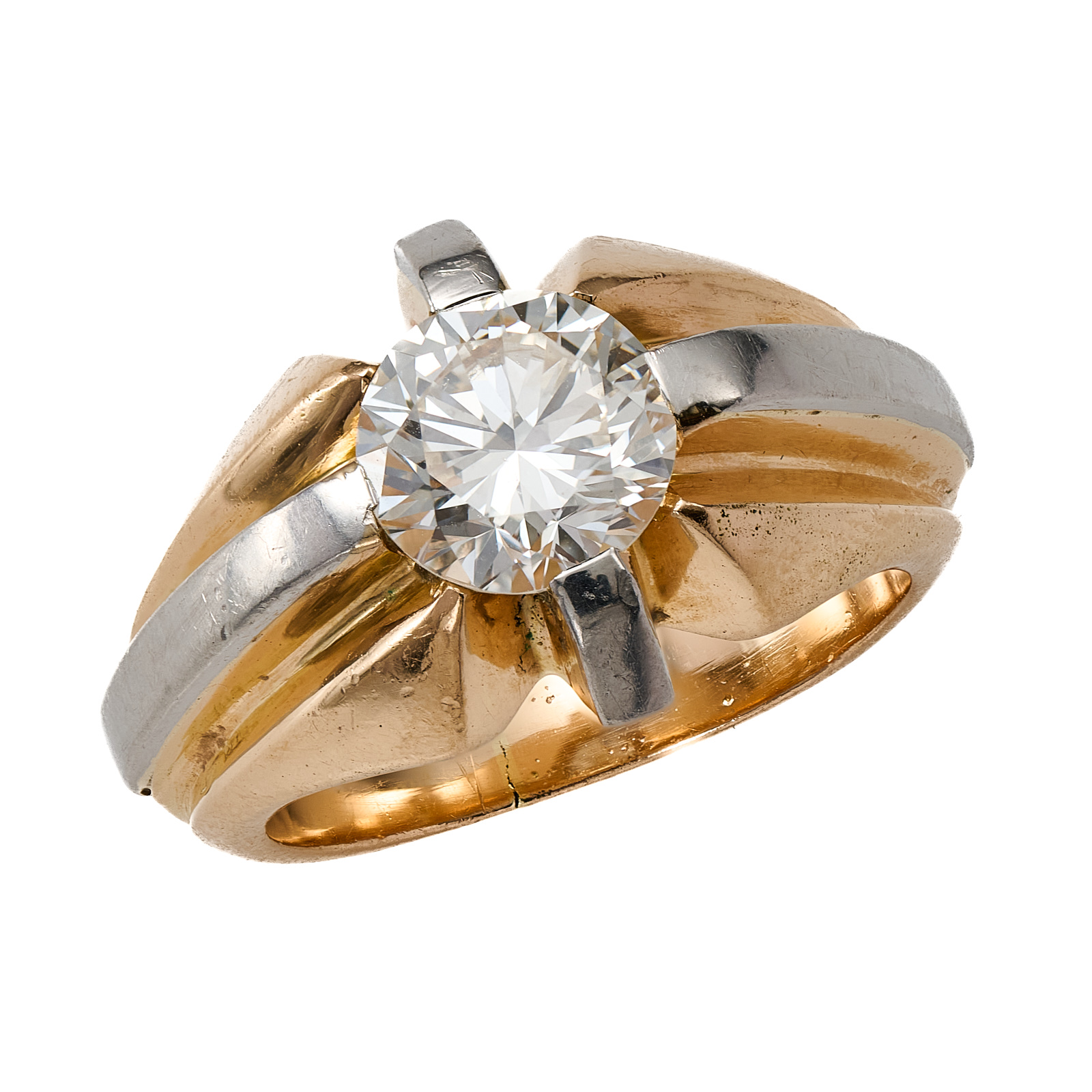 18 kt RG/WG, mittig besetzt m. 1 Brillant v. ca. 1,80 ct (Farbe getönt/ Reinheit vvsi). Geometr. ausgearbeiteter Ringkopf m. Vertiefungen u. kreuzförm. WG-Streifen. Breite polierte Ringschiene, nachträgl. verkleinert. RG 53. Insg. 14,6 g. Gebrauchsspuren.