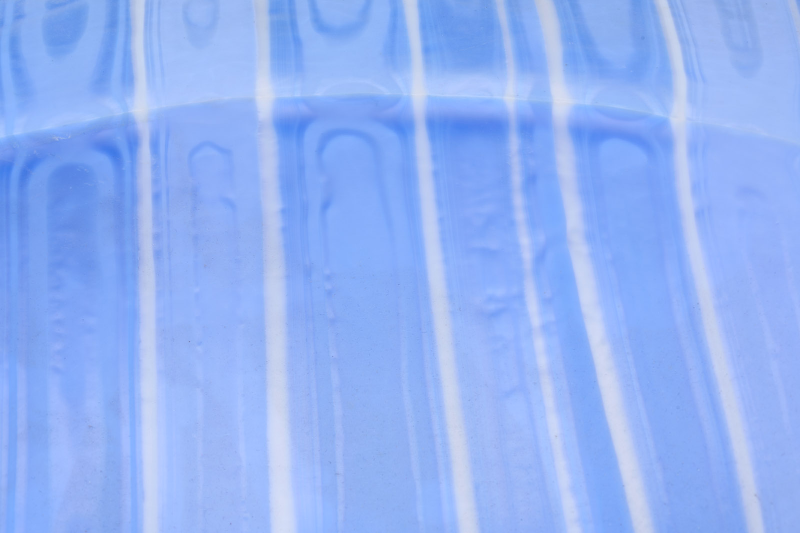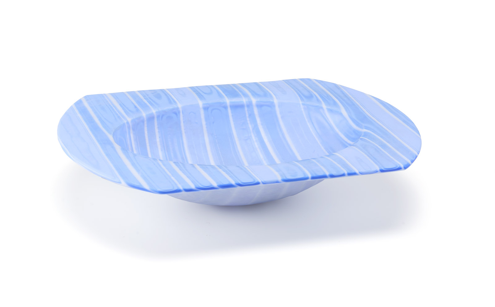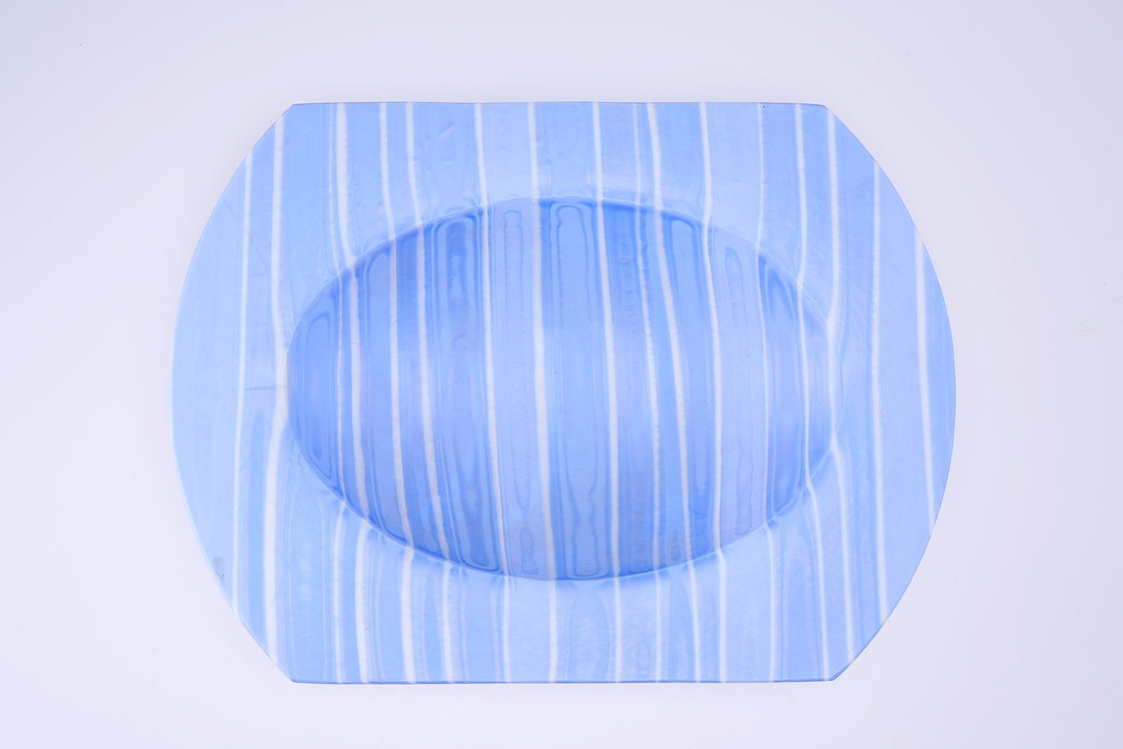 Weißes Glas m. blauen Einschmelzungen, matt. In d. Form gepressste Platte m. ov. Mulde, d. flache Rand an d. Enden abgerundet, über d. ges. Fläche laufende, leicht marmorierte Streifen. Unterseite weiß, unsign. L 35,7 cm.