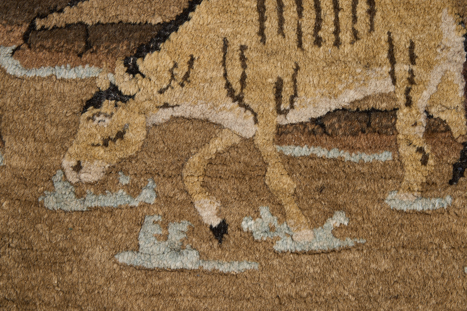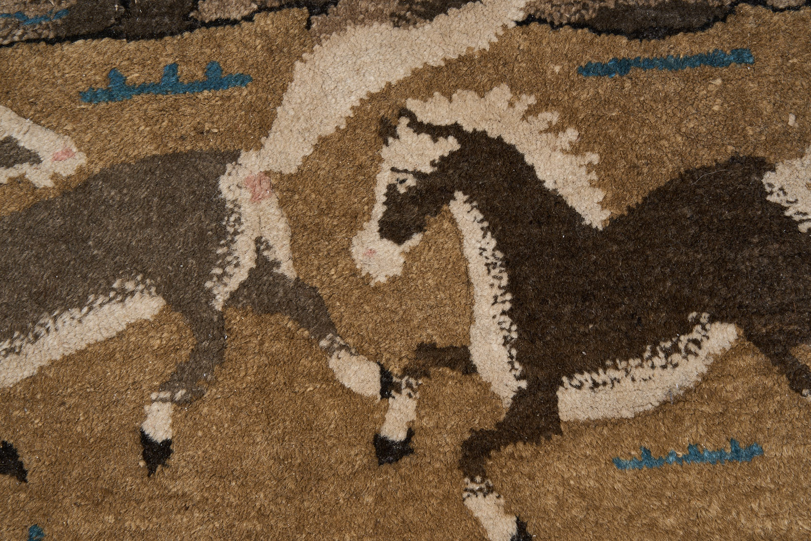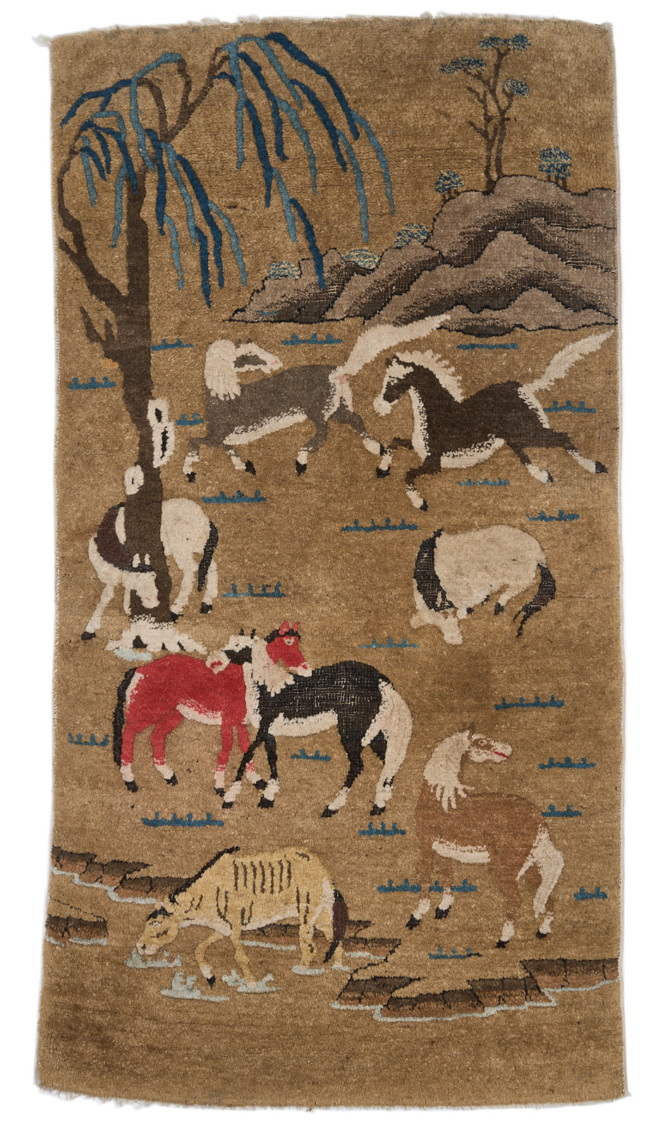 Wolle. Fläche m. hochrechteckiger Darstellung v. 8 versch. Pferden in Landschaft vor Hügel-Hintergrund u. Bäumen, nach vorn durch angedeutetes Wasser abgeschlossen. Unsign. Obere Kante rückseitig m. Ringen f. Wandhängung. Flor in d. schwarzen u. braunen Bereichen teils stark abgerieben. 121 x 64 cm
