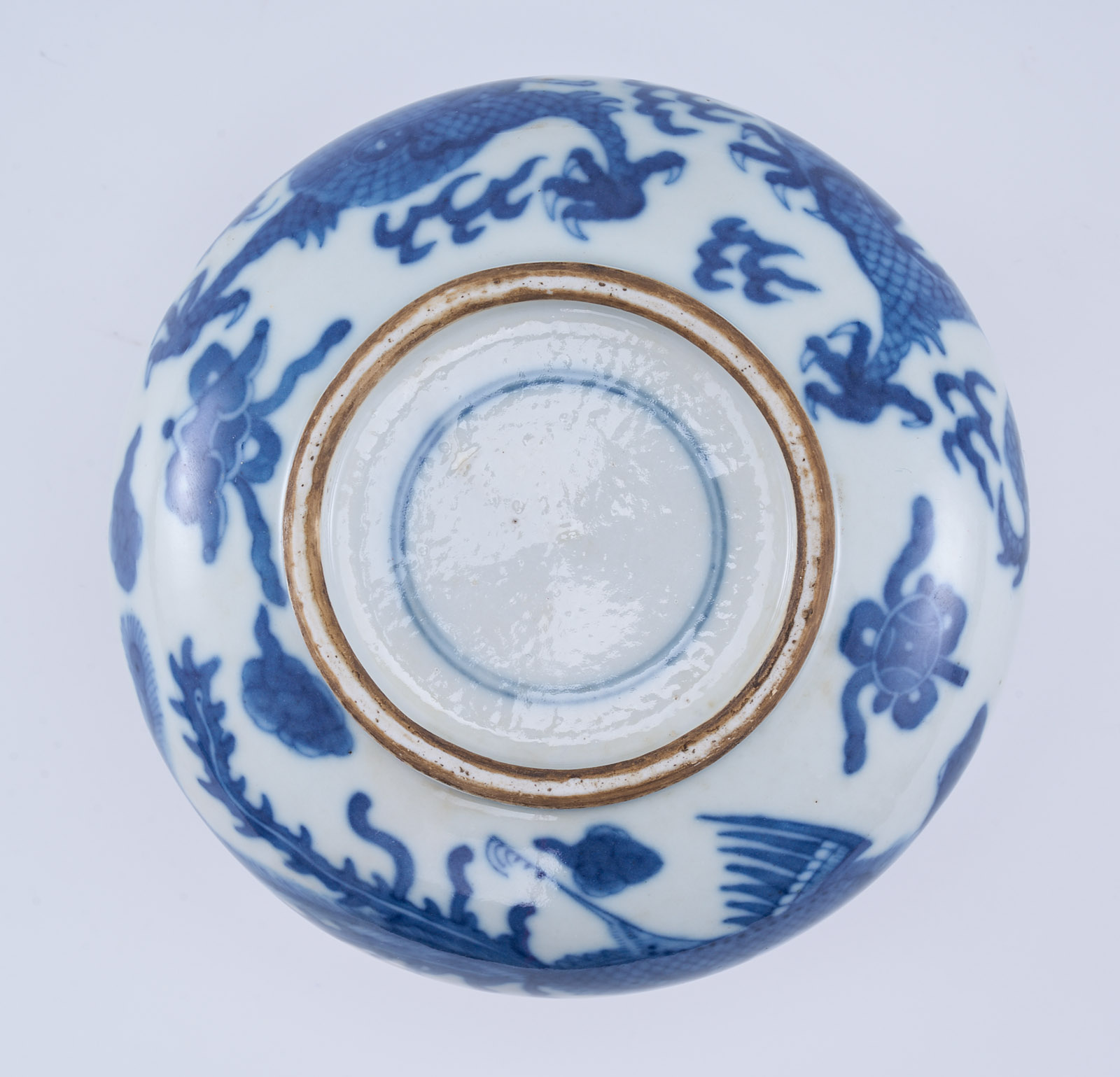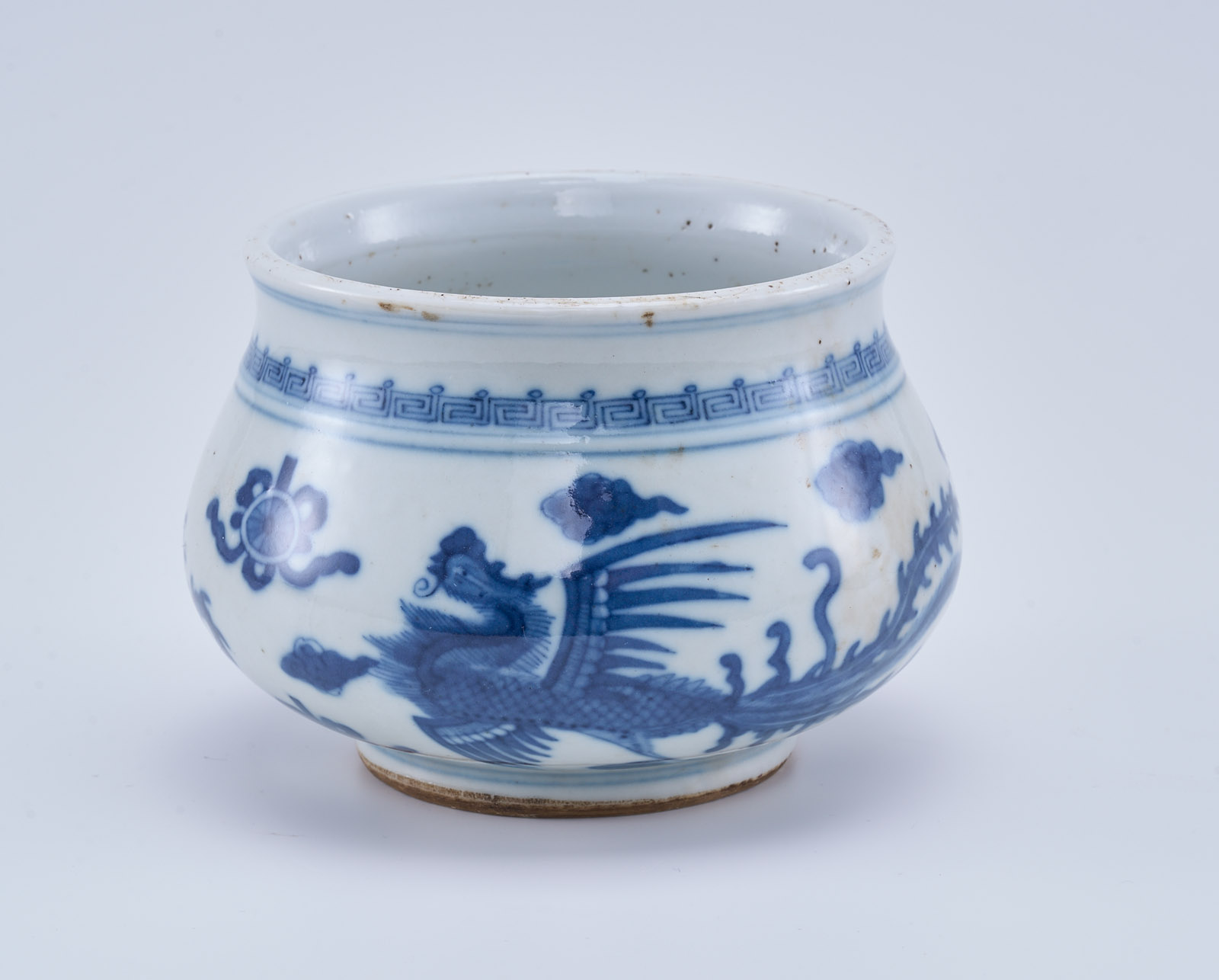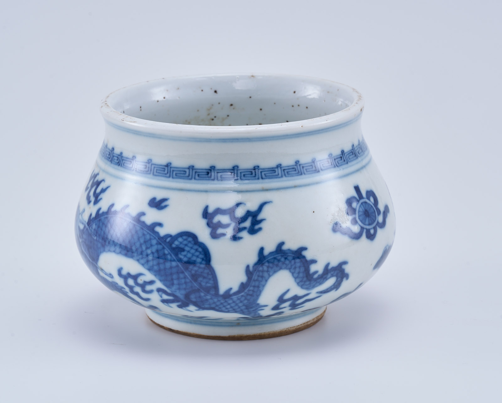 Porzellan m. Blaumalerei-Dekor. Kugeliger, nach oben zuschwingender Korpus m. leicht ausgestellter Lippe, auf Standring. Wandung umlaufend m. Drache u. Vogel zw. versch. Gegenständen u. Glückssymbolen, d. Halszone m. umlaufendem Mäanderband. Am Boden blauer Doppelring, ungemarkt. Ascheflug (v.a. innen). H 8,3 cm