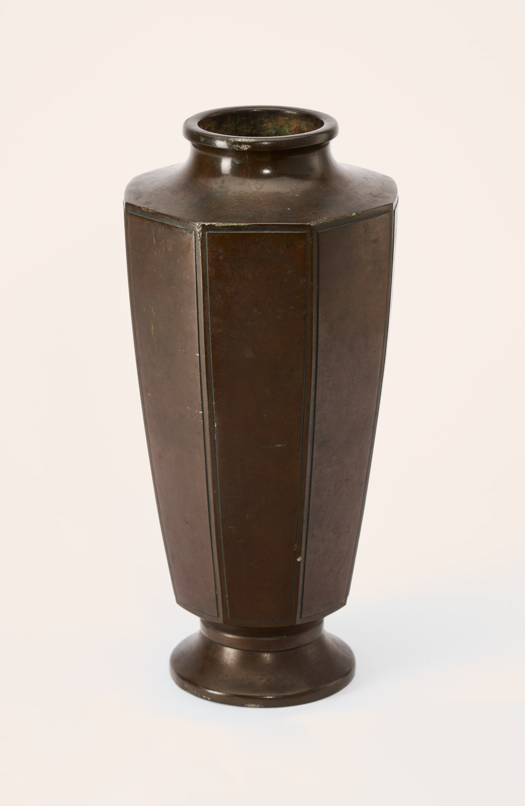 Dunkel patiniert. Schlanke, nach oben geweitete Amphore m. 8-eckiger Wandung auf kl. Rundfuß, d. breite, gekehlte Schulter in kl. Halsring ausschwingend. Wandung m. fein ausgestellten Flächen, über d. Fuß feiner Schaftring. Unsign. Oberfläche berieben, Lippe, Schulter- u. Fußkante leicht bestoßen. H 29,3 cm