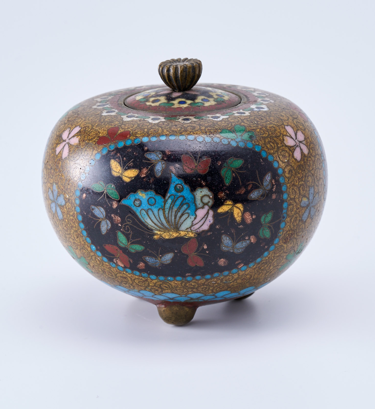 Kugeliger Korpus m. leicht abgeflachter Oberseite m. kl. Deckelchen m. Blütenknauf. Wandung m. gelb-rot gesprenkeltem Fond m. Spiralmuster m. bunten Blüten, darin 3 gr. ov. Reserven m. Schmetterlingen u. Blüten auf schw. Fond m. Glitter, Blütenring um d. Deckelkante. Boden m. Schuppen-gerahmtem rotem Fond u. 3 angedeuteten Kugelfüßen. Unsign. Innen hellblau emailliert. Oberfläche leicht berieben. H 6,9 cm