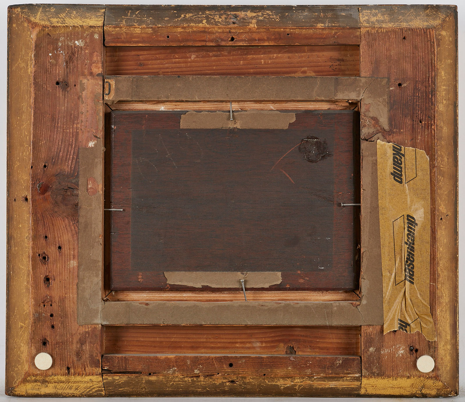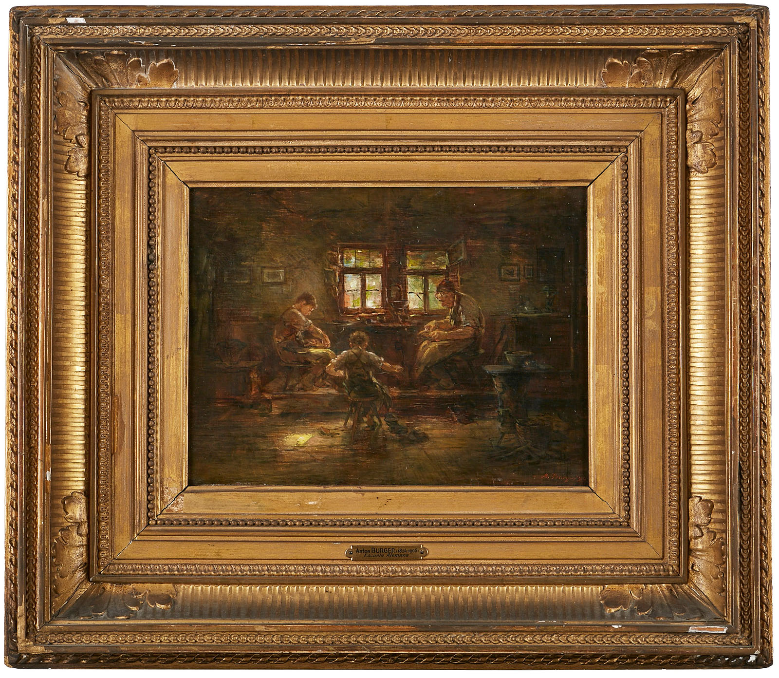 1824 Frankfurt – 1905 Kronberg „Familienbetrieb, Kronberger Nähstube“ u. re. sign. u. dat. A.Burger 94 Öl/Holz, 17,5 x 23,5 cm, Pfeiffenrahmen d. Zeit. Lit.: AKL