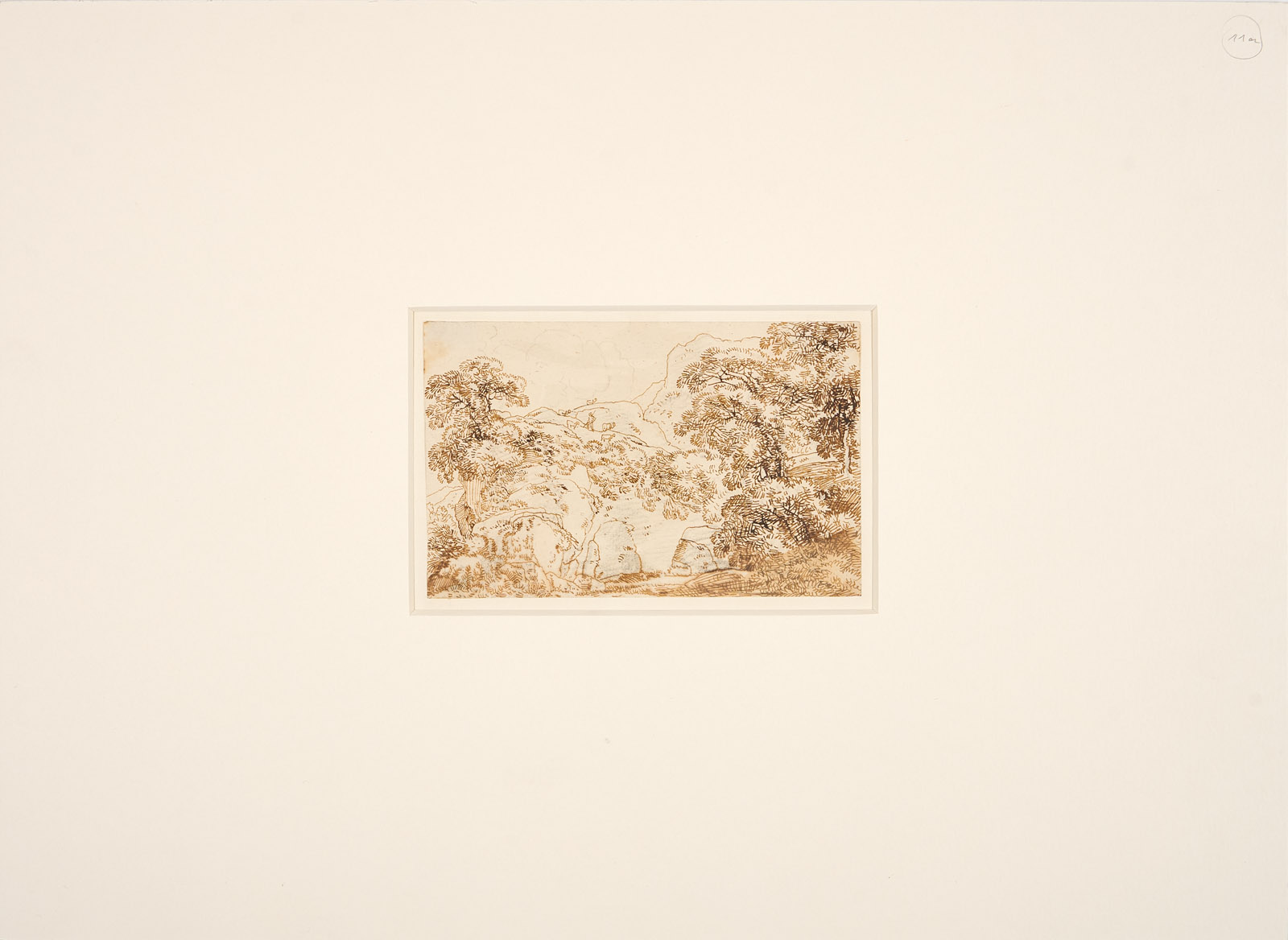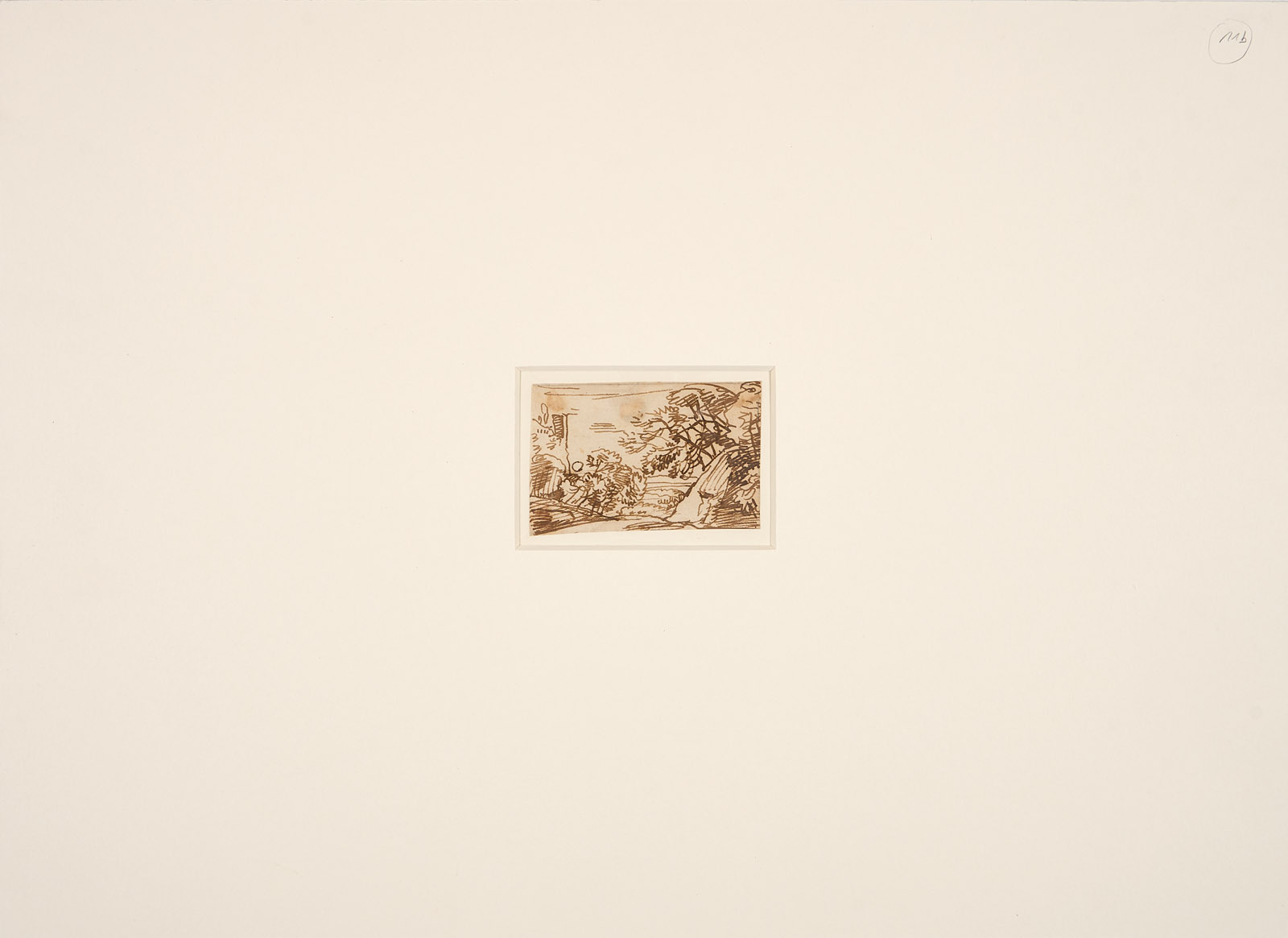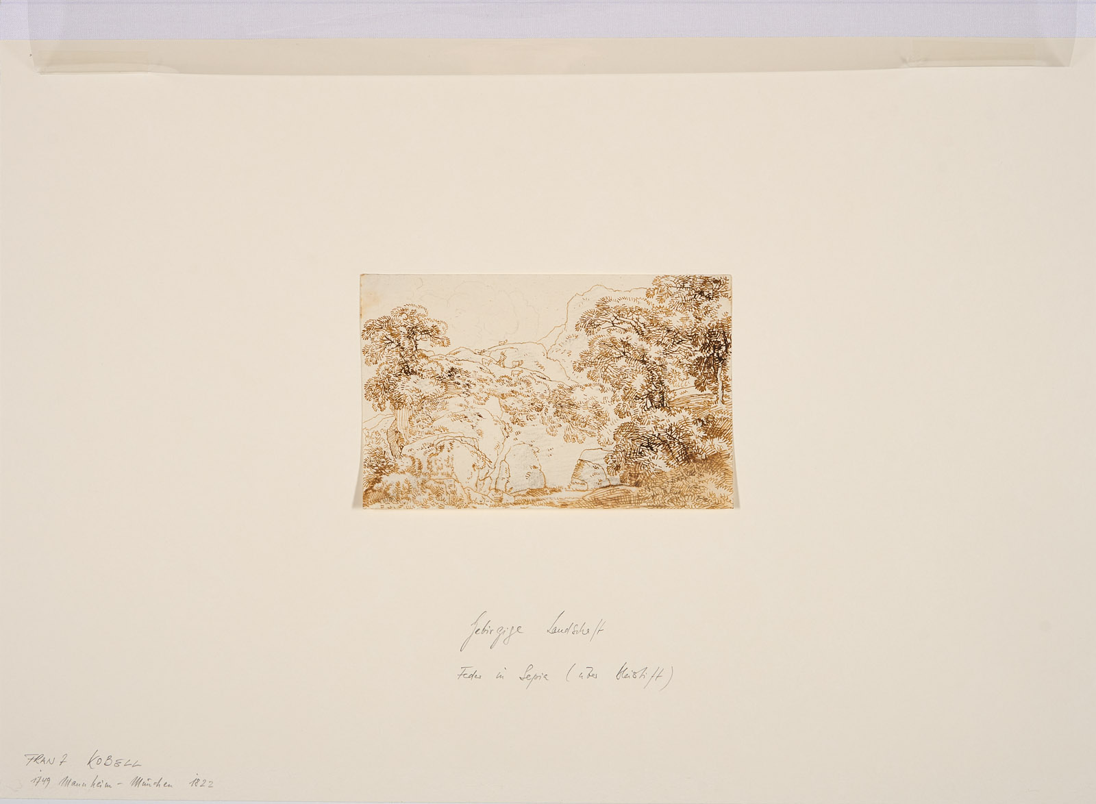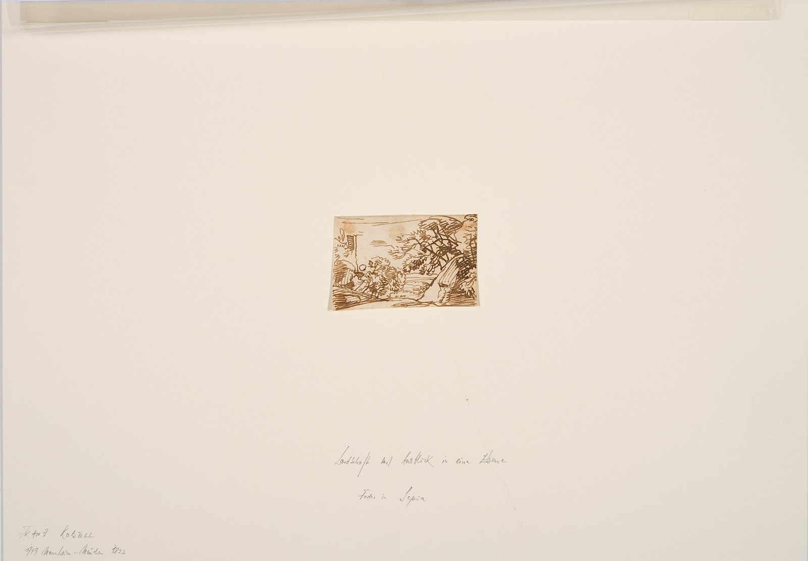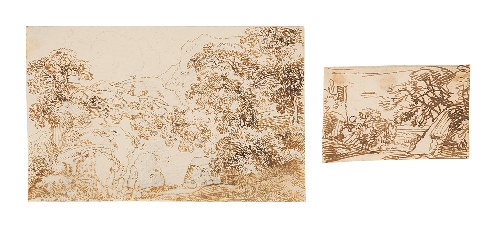 1749 Mannheim – 1822 München „Gebirgige Landschaft m. Hirten und Herde“ 16 x 10,4 cm, o. R. „Landschaft mit Ausblick in eine Ebene“ 5,6 x 8,5 cm, o. R. Provenienz: Privatsammlung Hessen Lit: AKL
