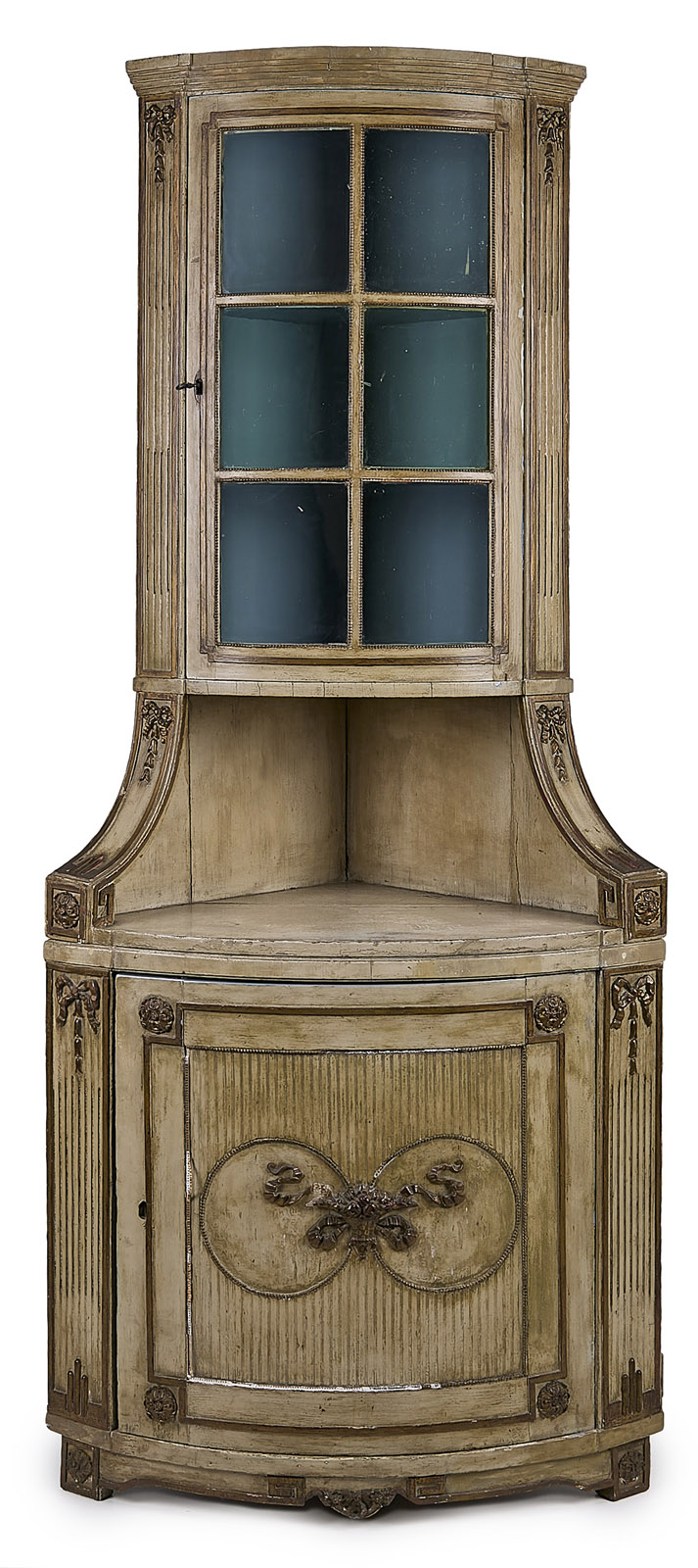 2-teilig. Weichholz u. Buche. Alte farbige Fassung in Beige u. Gold. In der gerundeten Front 1 gr. Tür, darüber offenes Ablagefach, darüber 1 verglaste Tür m. orig. Scheibe m. Sprossenunterteilung. Innen blau gefasst. Ecken u. Füllungsfelder m. Kannelierung u. stuckierten Schleifen u. Rosetten. Abgetrepptes Gesims. Zargensockel. 2 orig. Schlösser, 1 Schlüssel. H 224, B 96, T 67 cm. Gebrauchsspuren, Reste versch. alter Fassungen m. Defekten u. Abplatzungen, Stuck m. Defekten, Schwundrisse, Schlösser defekt.