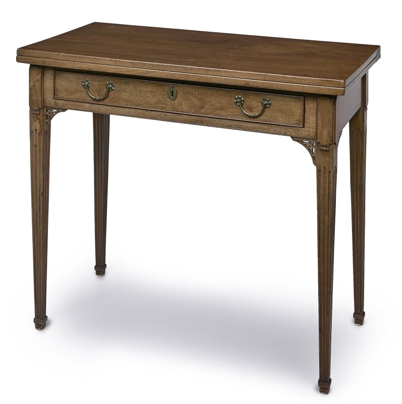 Mahagoni massiv u. furniert. Rechteckige Platte aufklappbar. In der Zarge 1 gr. Schub. Auf 4 halbhohen konischen kannelierten Beinen m. reliefierten durchbrochenen Zierecken. Rückseitig 1 Schwenkbein. H 76, B 85,5, T 42/84 cm. Gebrauchsspuren, ausgeblichen, kl. Defekte.