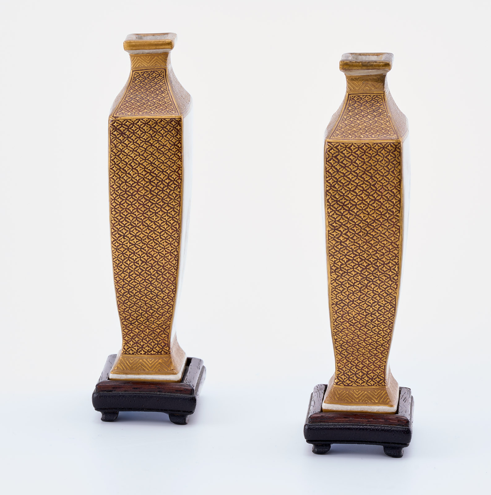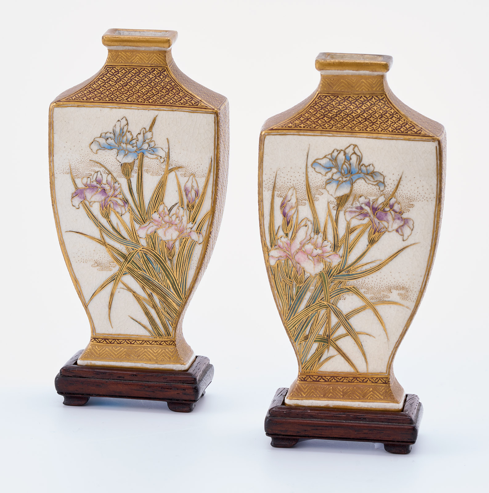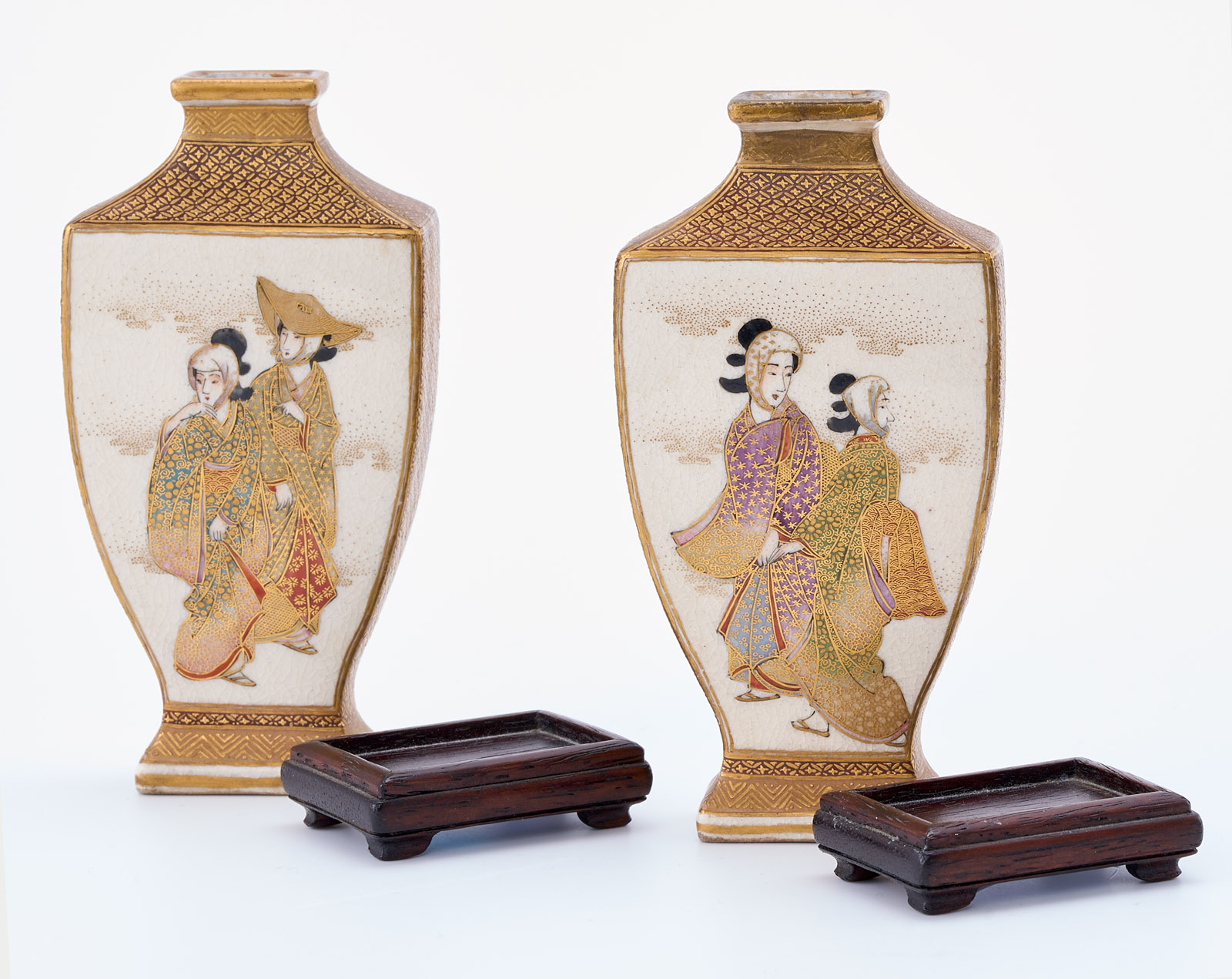 Paar kl. Satsuma-Vasen „Spaziergang“, Meji, Japan um 1890. Heller Scherben m. farbigem Dekor und feinem Gold-Überdekor. Jeweils flacher Korpus in Amphoren-Silhouette über rechteckigem Grundriß. Stark gekehlte Schulter m. kurzem Hals und rechteckigem Lippenrand, auf ausschwingendem Rechteck-Fuß. Wandung m. Darstellung versch. Geisha-Paare beim Flanieren, verso Lilienblüten (jew. spiegelsymmetr. zueinander gestaltet). Die fein farbigen Motive m. feinem Gold-Überdekor u. feinen Goldtupfen auf d. hellen, krakelierten Fond. Korpusseiten und Schulter jeweils m. feinem Goldnetz-Dekor auf dunkelrotem Grund, Hals u. Stand m. Zickzack-Goldmuster. Am Boden jeweils goldene 2-Zeichen-Marke auf eisenrotem Grund. Auf kl. rechteckigen Holzsockeln. Dekor minimal berieben, 1 x Lippe übergangen/ Standkante m. minimalem Chip. H 9,2 cm, Ges.H 10 cm Prov.: Nachlass des Maharadja Hari Singh von Kashmir, seitdem in Privatbesitz.