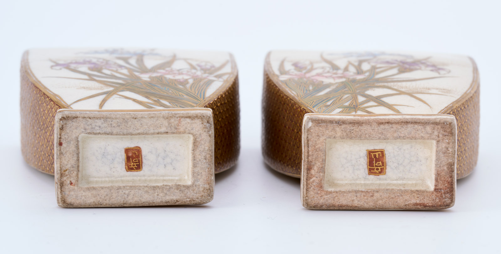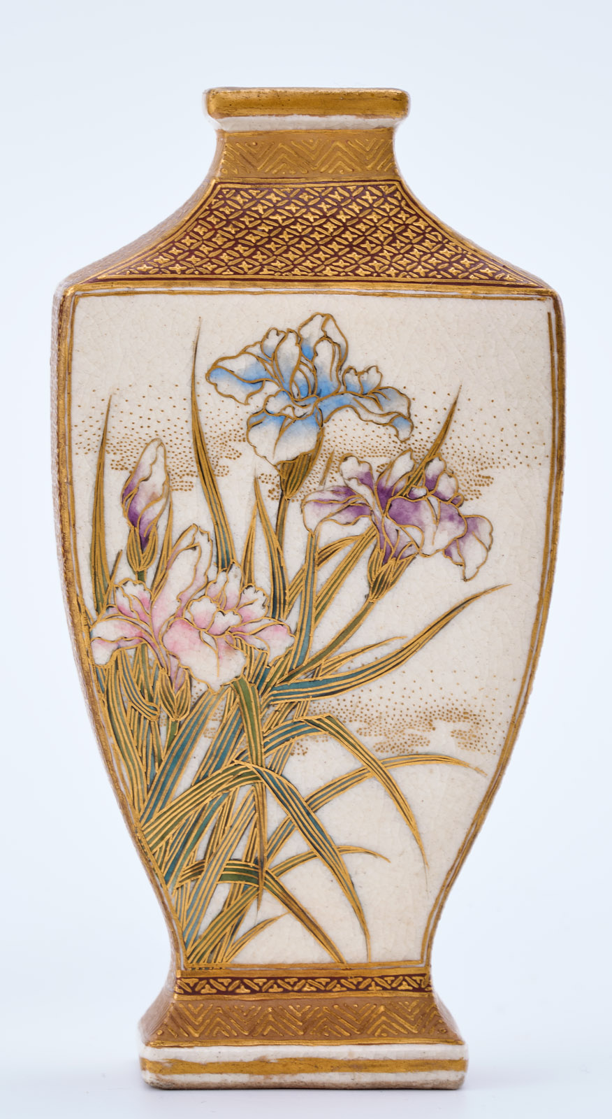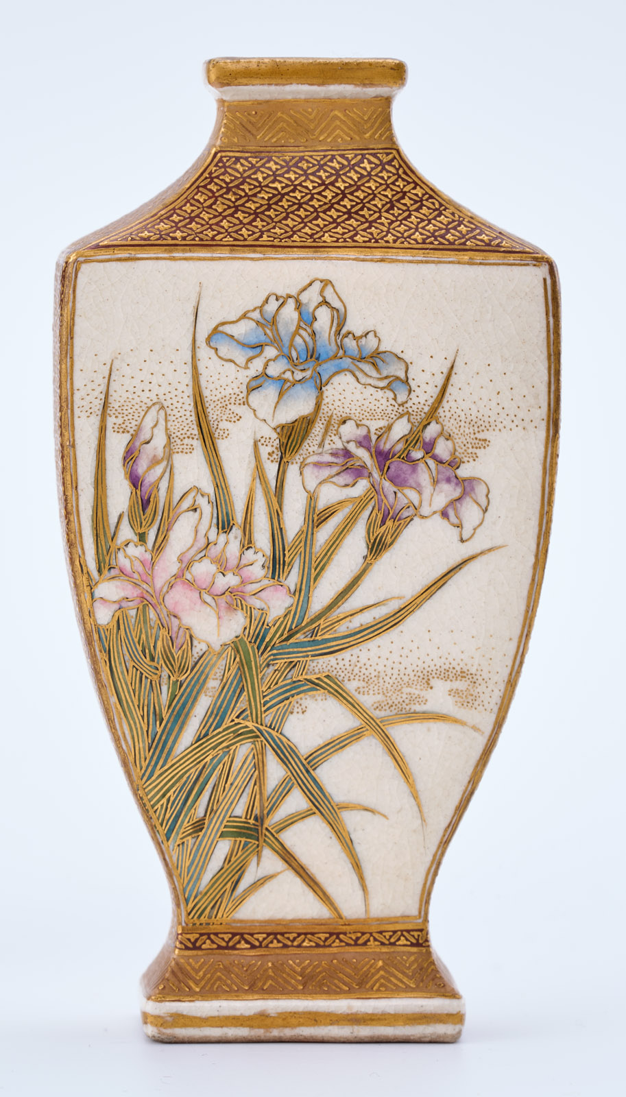 Paar kl. Satsuma-Vasen „Spaziergang“, Meji, Japan um 1890. Heller Scherben m. farbigem Dekor und feinem Gold-Überdekor. Jeweils flacher Korpus in Amphoren-Silhouette über rechteckigem Grundriß. Stark gekehlte Schulter m. kurzem Hals und rechteckigem Lippenrand, auf ausschwingendem Rechteck-Fuß. Wandung m. Darstellung versch. Geisha-Paare beim Flanieren, verso Lilienblüten (jew. spiegelsymmetr. zueinander gestaltet). Die fein farbigen Motive m. feinem Gold-Überdekor u. feinen Goldtupfen auf d. hellen, krakelierten Fond. Korpusseiten und Schulter jeweils m. feinem Goldnetz-Dekor auf dunkelrotem Grund, Hals u. Stand m. Zickzack-Goldmuster. Am Boden jeweils goldene 2-Zeichen-Marke auf eisenrotem Grund. Auf kl. rechteckigen Holzsockeln. Dekor minimal berieben, 1 x Lippe übergangen/ Standkante m. minimalem Chip. H 9,2 cm, Ges.H 10 cm Prov.: Nachlass des Maharadja Hari Singh von Kashmir, seitdem in Privatbesitz.