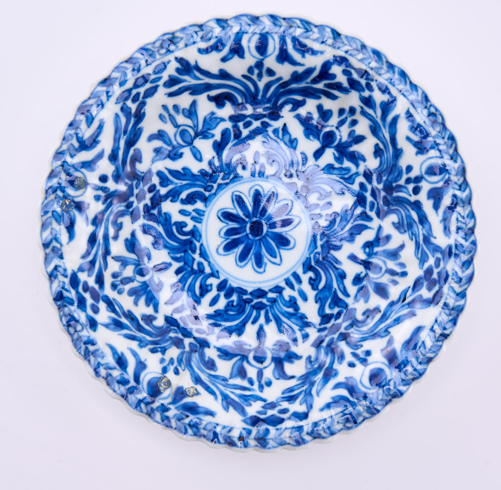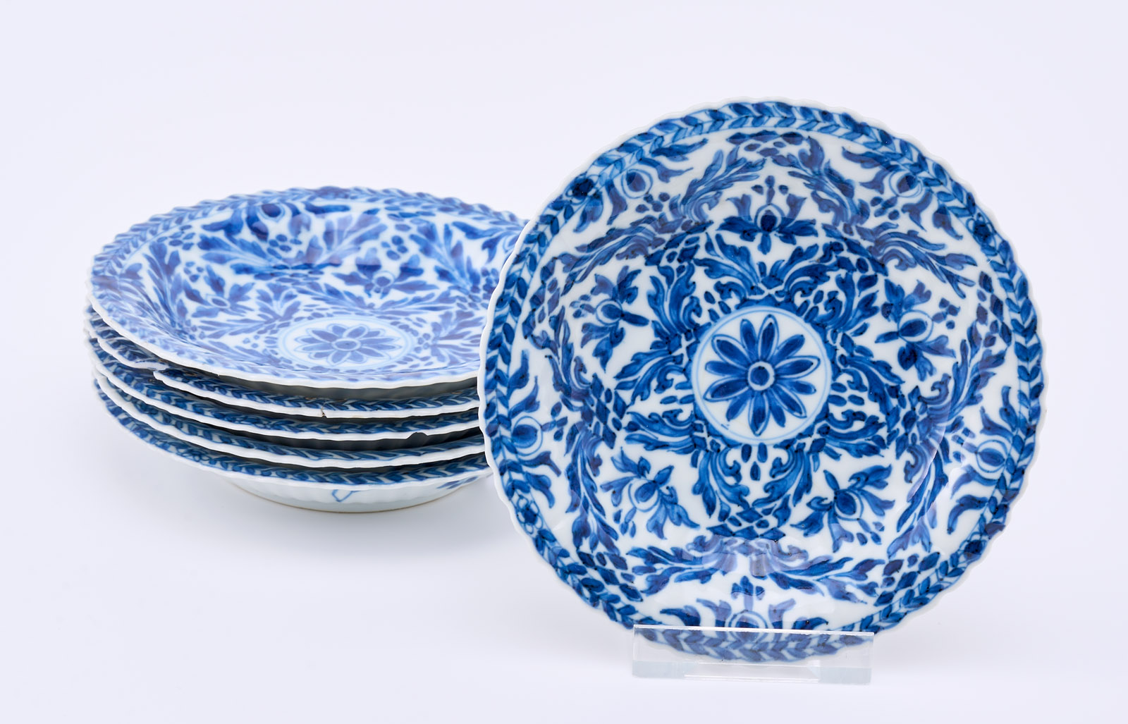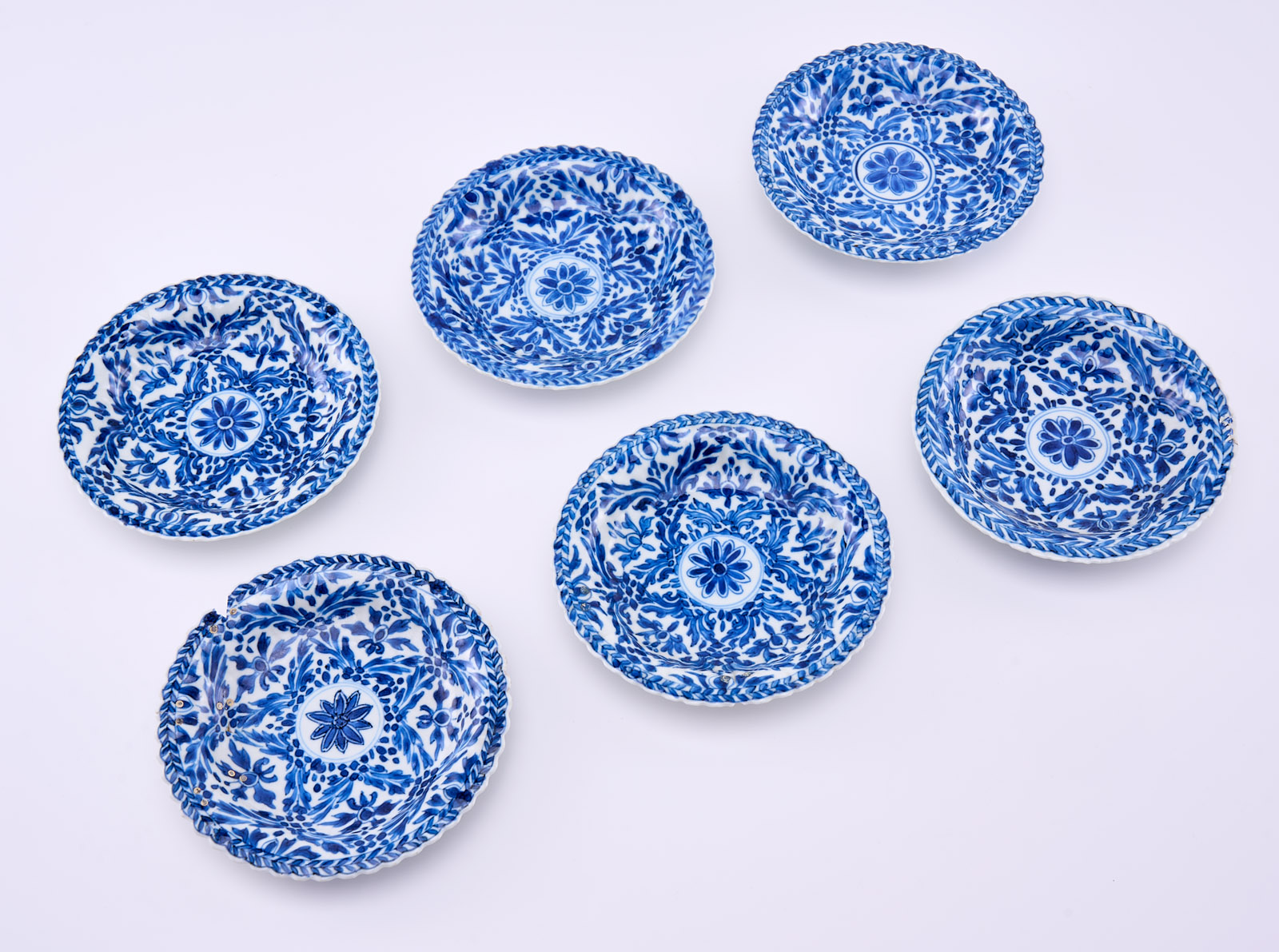 Satz von 6 kl. Tellerchen, China wohl 18. Jh. Porzellan m. Blaumalerei-Dekor. Jeweils runde Form m. fein gewelltem, gewölbtem Rand u. fein gewellter Kante. Ges. Oberfläche m. dichten Blattranken, je kl. Rundfeld m. Blüte rahmend. Fahne verso m. stilis. Zweigen m. Früchten und Blüten, am Boden je blaues Knoten-Symbol in blauem Doppelring. Alle Tellerchen m. teils minimal bestoßener Kante, 2 x Sprung, 1 x Kante m. restaur. Chip, 2 x Fahne m. alter Restaurierung m. Metallklammern. D 13,1 cm Prov.: Priv.besitz Niederlande, danach in Priv.besitz Frankfurt.