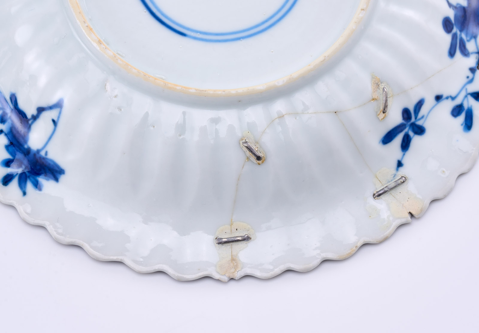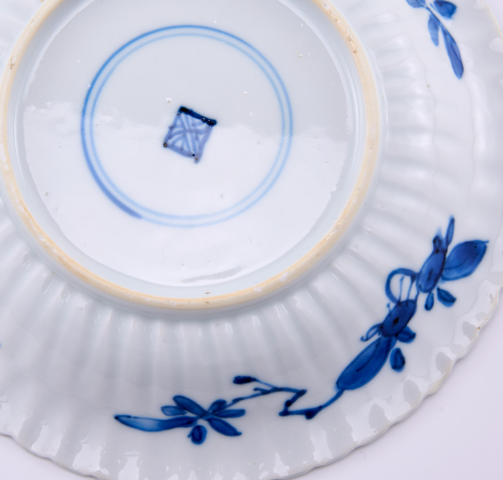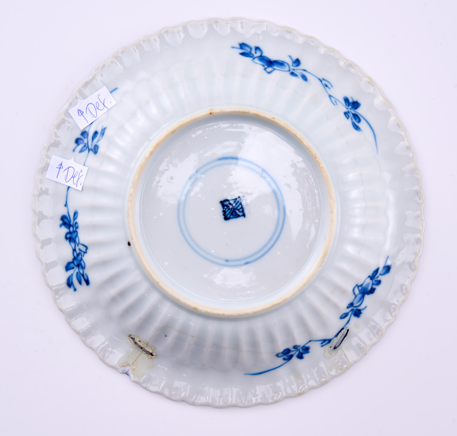 Satz von 6 kl. Tellerchen, China wohl 18. Jh. Porzellan m. Blaumalerei-Dekor. Jeweils runde Form m. fein gewelltem, gewölbtem Rand u. fein gewellter Kante. Ges. Oberfläche m. dichten Blattranken, je kl. Rundfeld m. Blüte rahmend. Fahne verso m. stilis. Zweigen m. Früchten und Blüten, am Boden je blaues Knoten-Symbol in blauem Doppelring. Alle Tellerchen m. teils minimal bestoßener Kante, 2 x Sprung, 1 x Kante m. restaur. Chip, 2 x Fahne m. alter Restaurierung m. Metallklammern. D 13,1 cm Prov.: Priv.besitz Niederlande, danach in Priv.besitz Frankfurt.