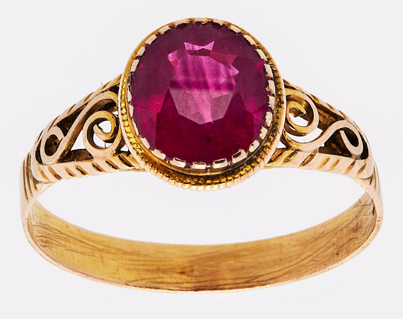 18 kt GG, besetzt m. 1 oval facettierten Rubin v.