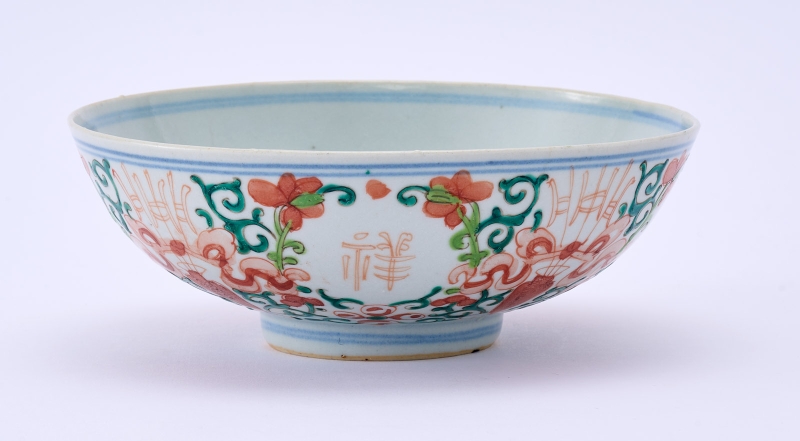 Porzellan m. buntem Emaillefarben-Dekor der sog. „Famille Orange“. Flach gewölbte Form auf kl. Standring. Wandung außen umlaufend m. Vasen m. Räucherstäbchen zw. Blütenranken, kl. Felder m. Schriftzeichen bildend. Innen am Boden kl. Rundfeld m. Schriftzeichen in blauer Doppellinie. Am Boden quadrat. blaue Zeichenmarke. Dekor berieben, Lippe m. 2 kl. Haarrissen. D 16,3 cm