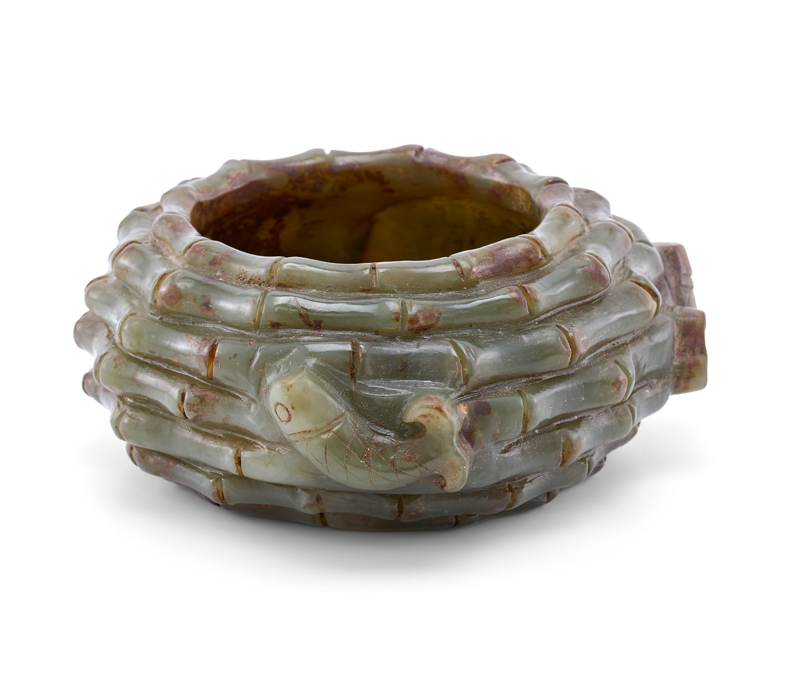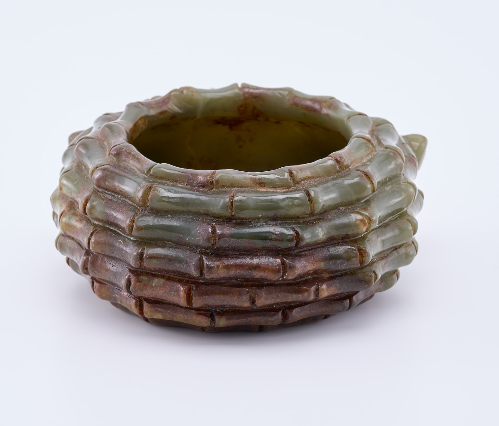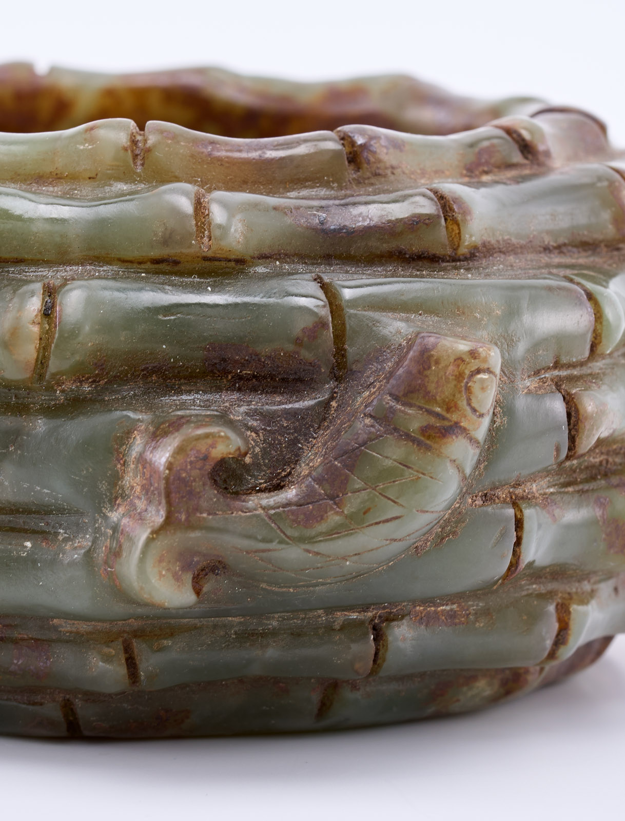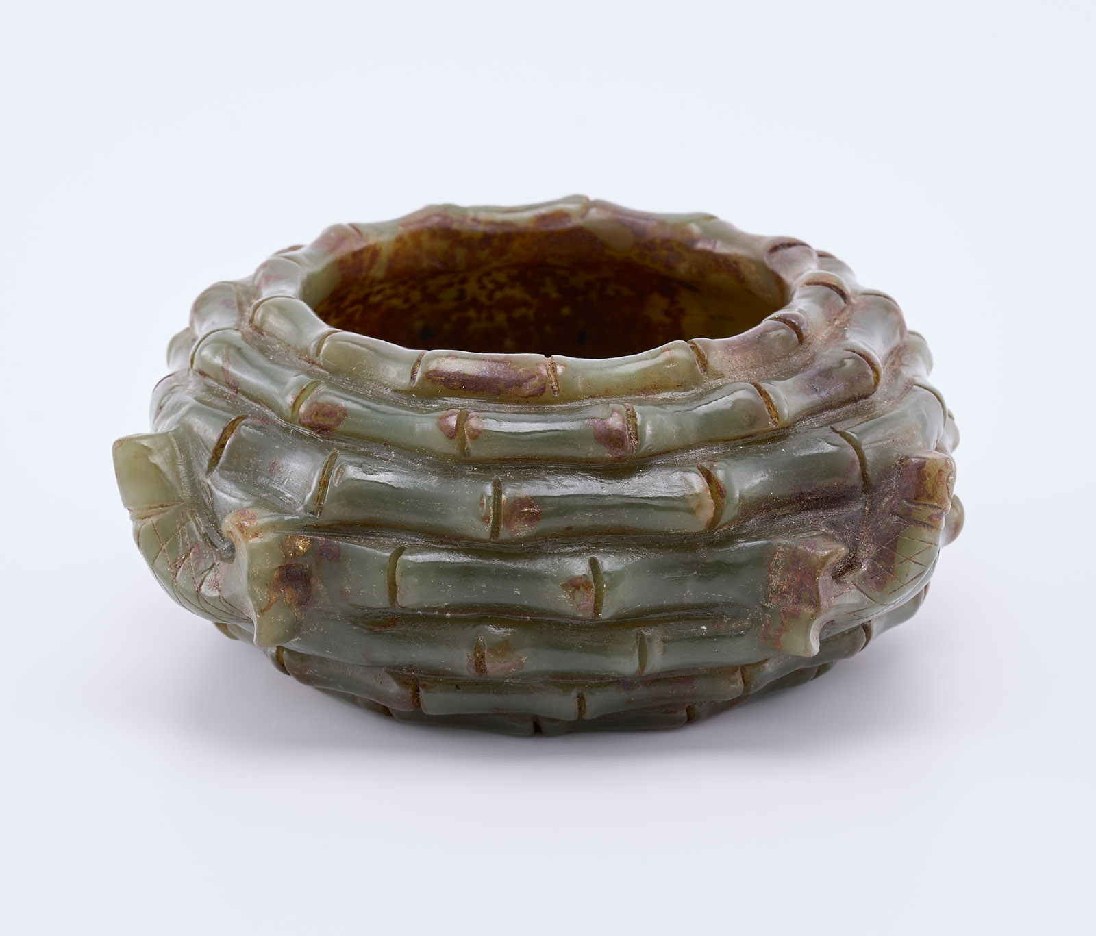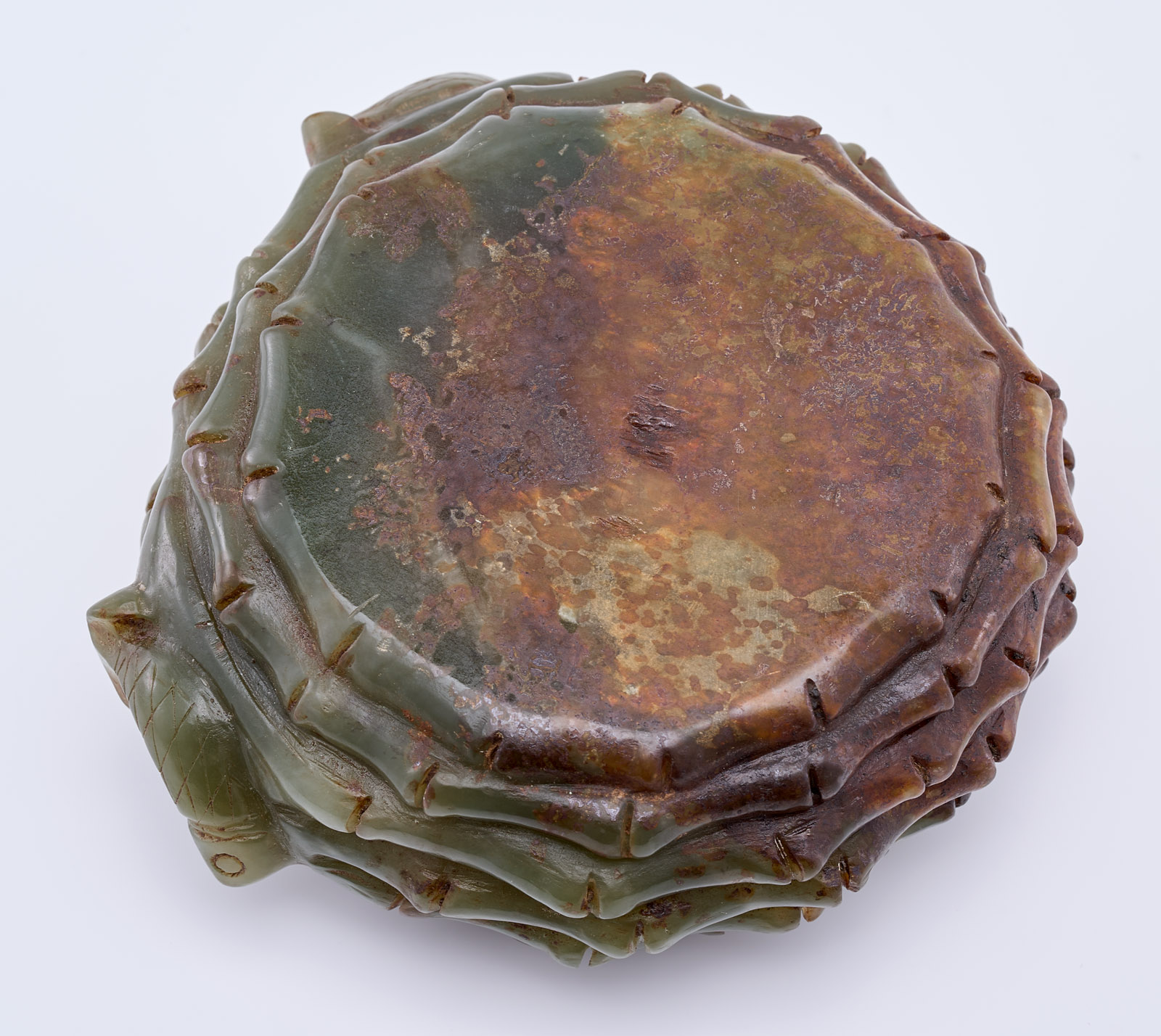 Dunkelgrüne Jade, vollrund geschnitzt. Kugelige