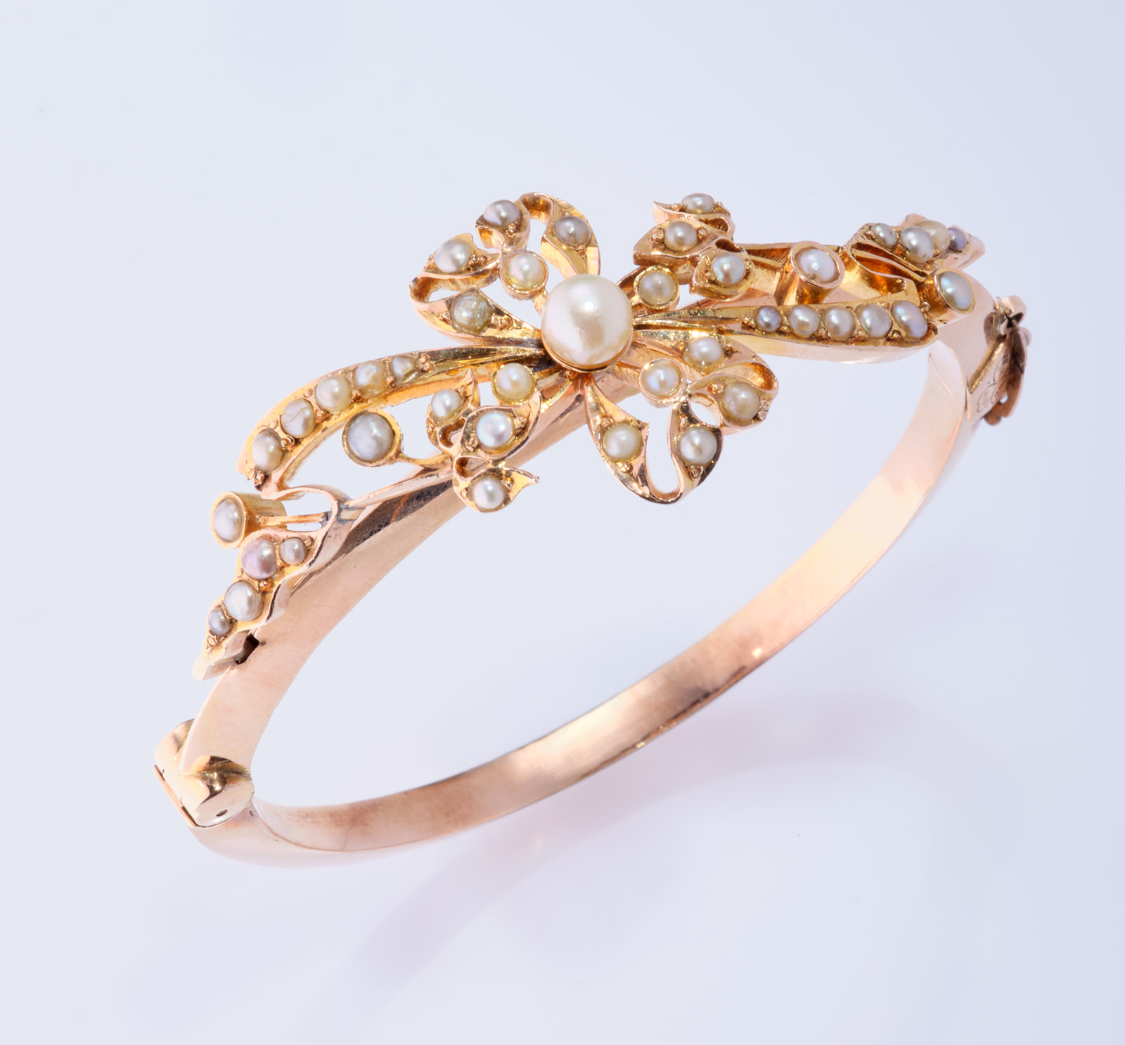 bzw. grauen Süßwasserperlen. Polierter Armreif,