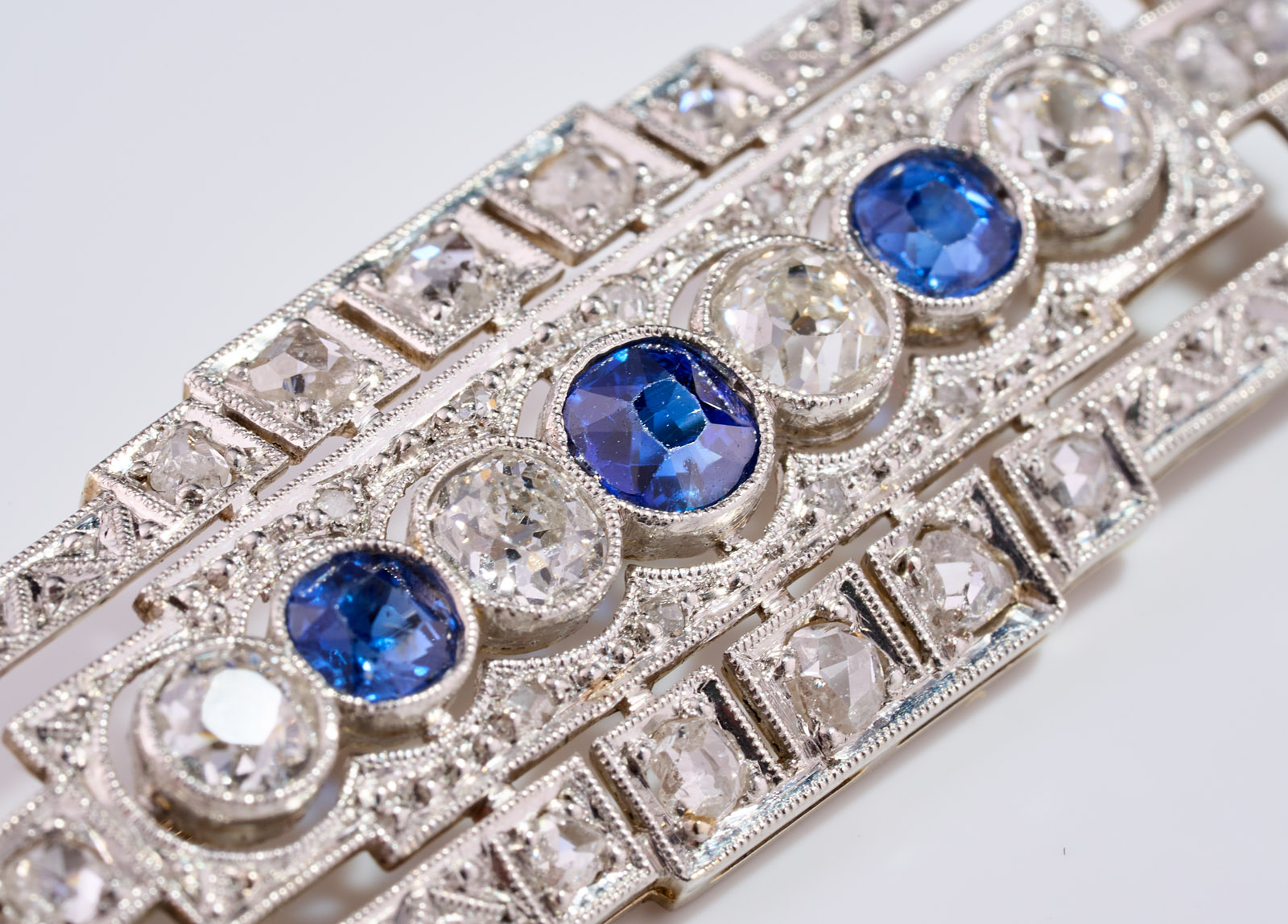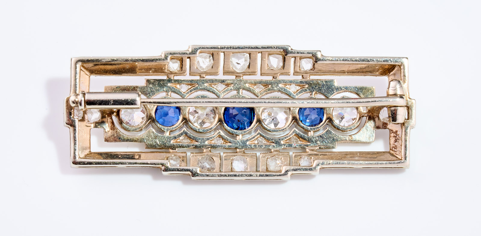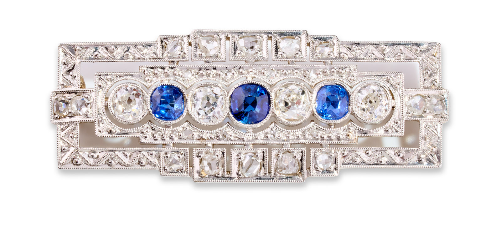 Saphir-Diamant-Brosche, Art Déco um 1920.