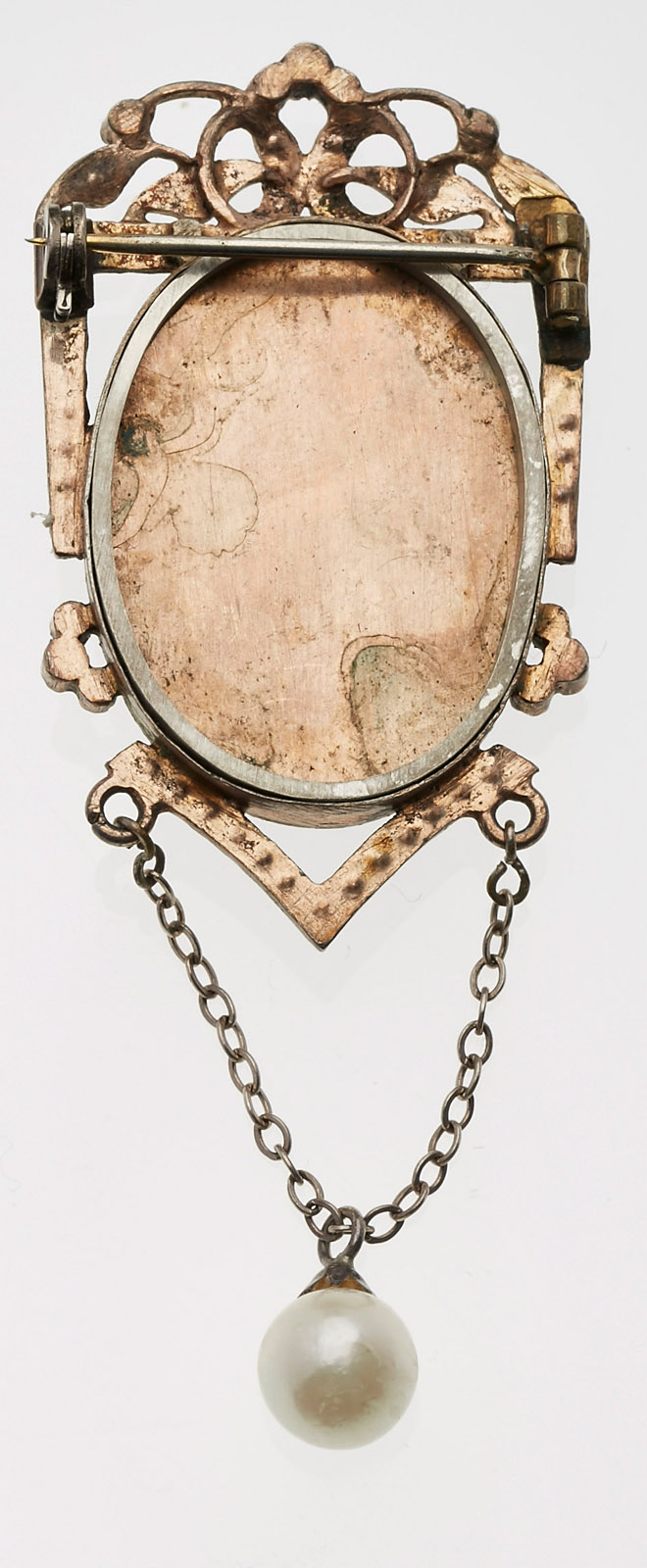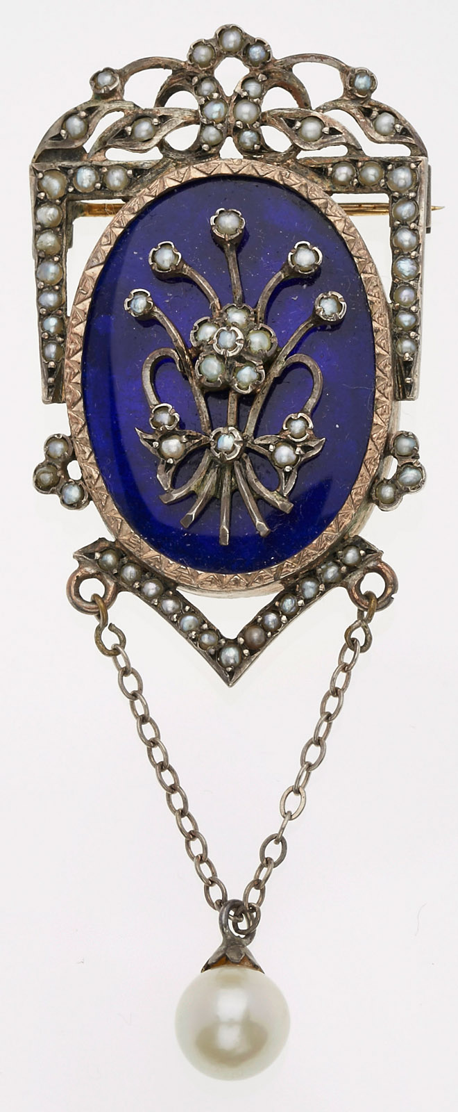 Silber teils rotvergoldet, besetzt m. 1 ovalen blauen Glasplatte, zahlr. kl. Halbperlen u. 1 weißen herabhängenden Zuchtperle (wohl ergänzt). Florale Ausarbeitung m. herabhängendem Kettenelement. L 6,9 cm. Insg. 10,7 g. Perle m. Riss, Gebrauchsspuren.