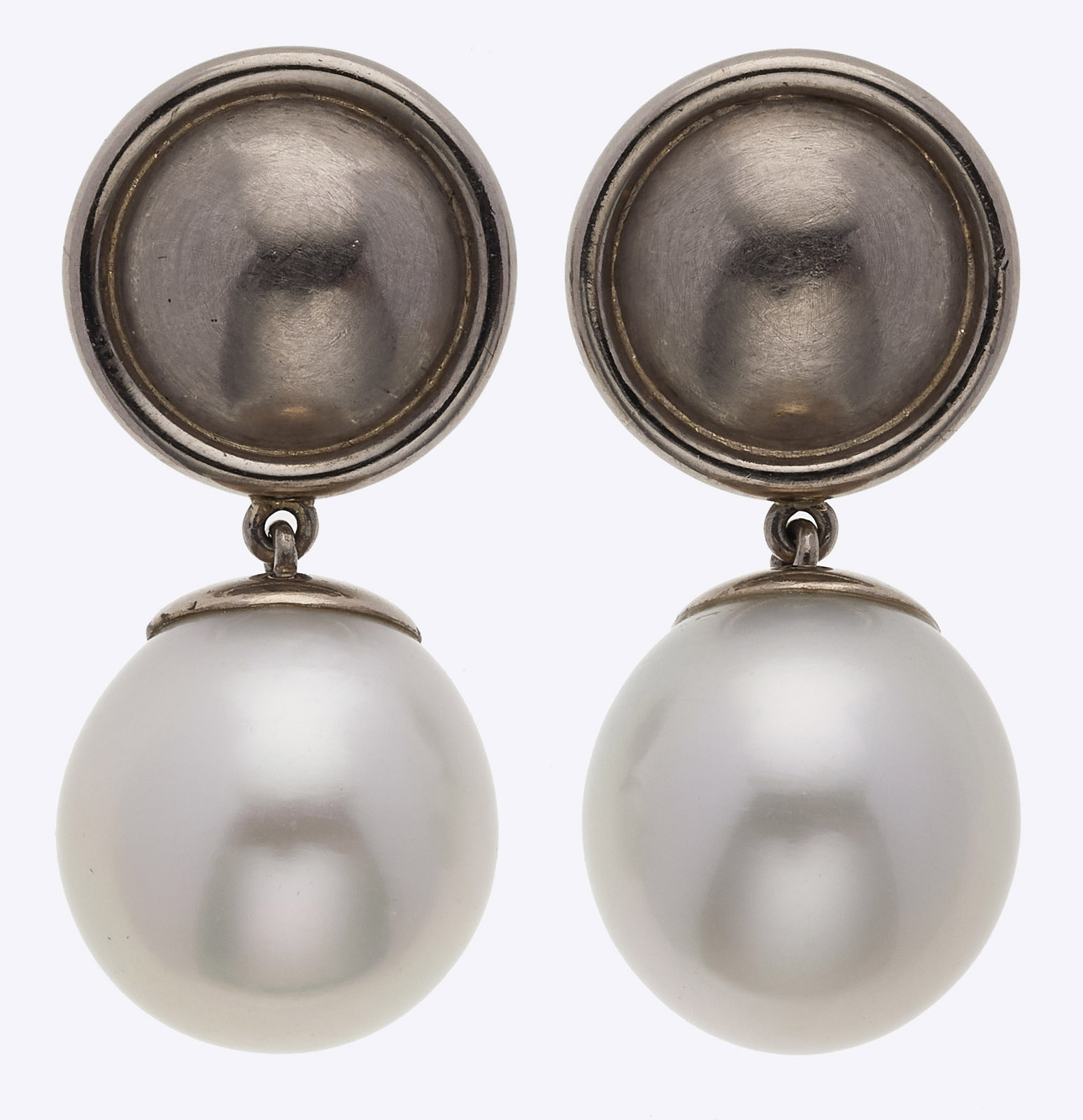 Weiße Südsee-Zuchtperlen. Runde Stecker u. Verschlüsse 18 kt WG. Perlen-D ca. 14-15 mm. Ohrhänger-L 3,2 cm. Insg. 16,5 g. Gutachten v. 2018 in Kopie. WG teils berieben, Gebrauchsspuren.