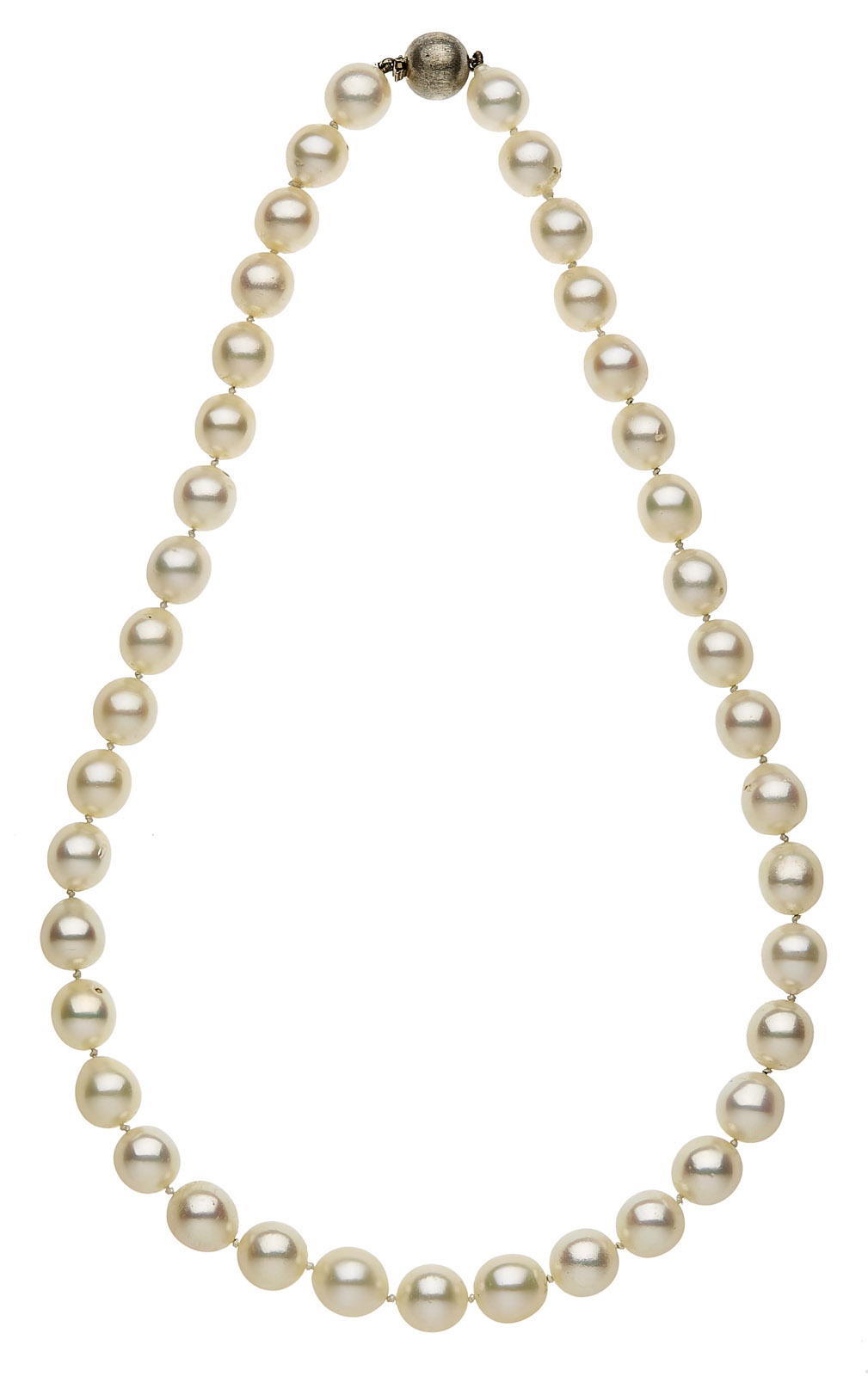 Weiße Akoyazuchtperlen, leicht oval. Mattierte Kugelschließe in 14 kt WG. Perlen-D ca. 9-10 mm. Ketten-L 44,3 cm. Insg. 51,3 g. Gutachten v. 2018 in Kopie. Gebrauchsspuren.