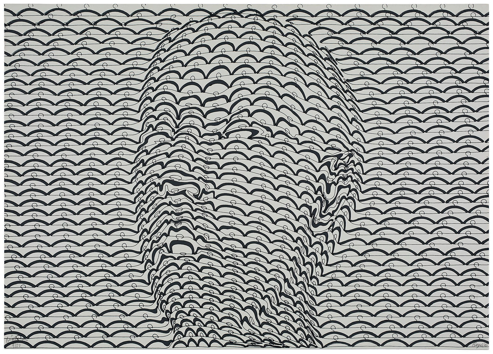 geb. 1937 Berlin“Bügelmann“ 1970 u. re. sign. u. dat. Bayrle 70 u. li. mit dem Titel Exemplar 9/50, 50,4 x 70,4 cm, o.R. Farbfrischer Zustand, nie montiert. Keine Defekte.