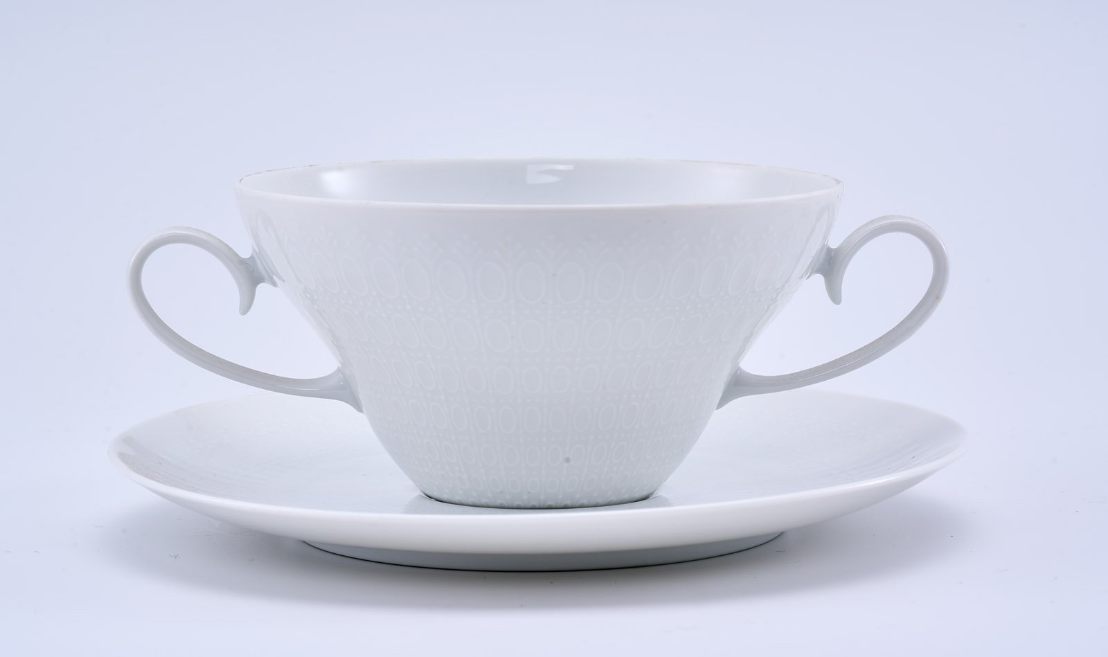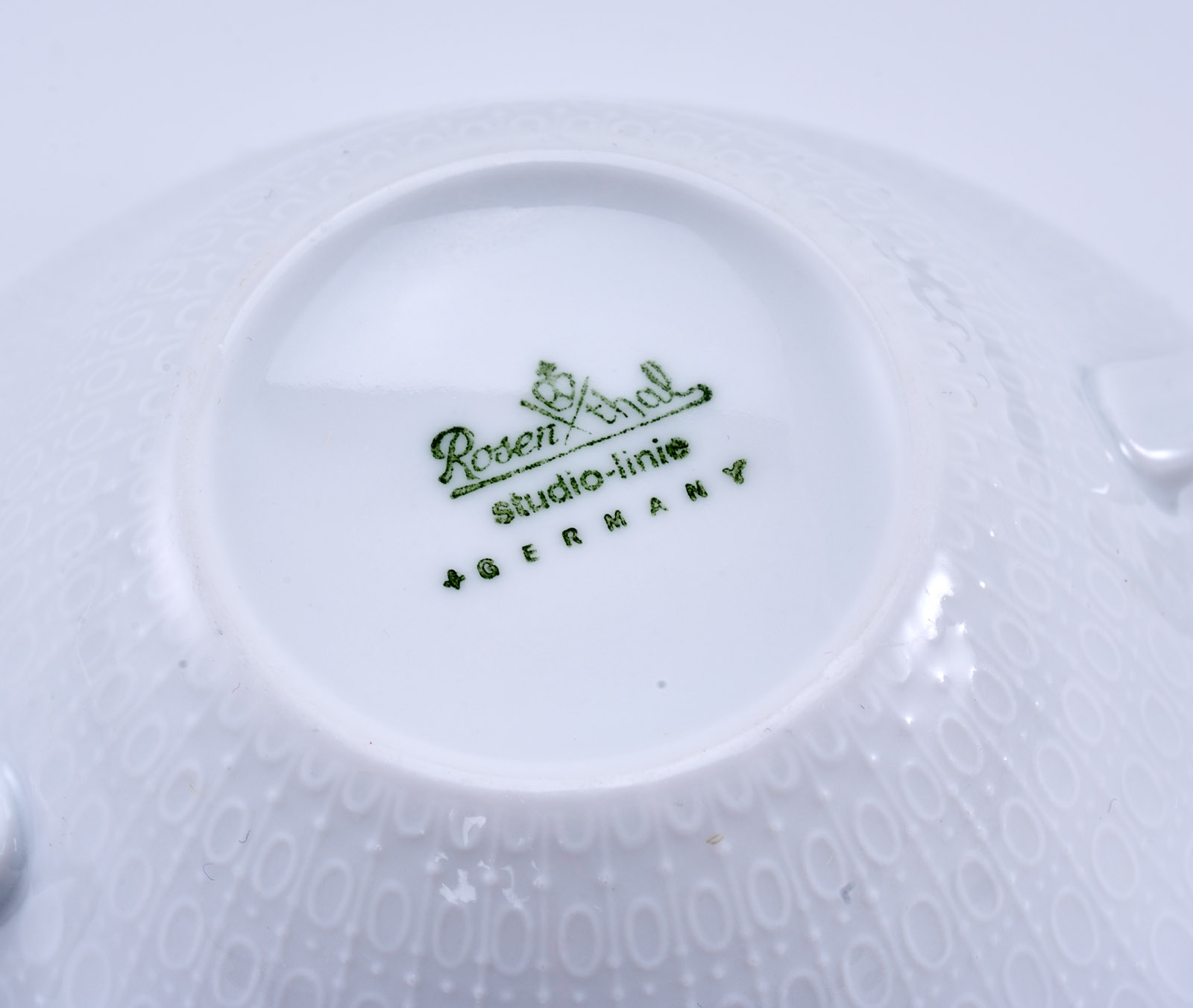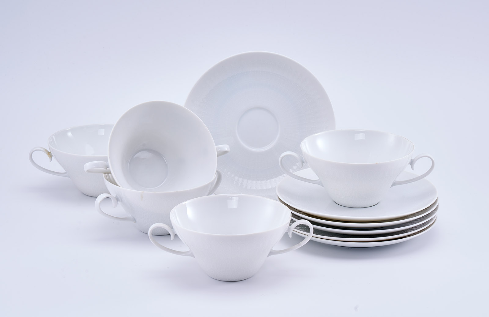 Form „Romanze“, weiß glasiert. Entw.: Björn Wijnblad. Am Boden grüner Firmenstempel m. „studio-linie“ bzw. „Germany“. Bestehend aus: 5 Suppentassen, 6 UT, zus. 11 Teile.