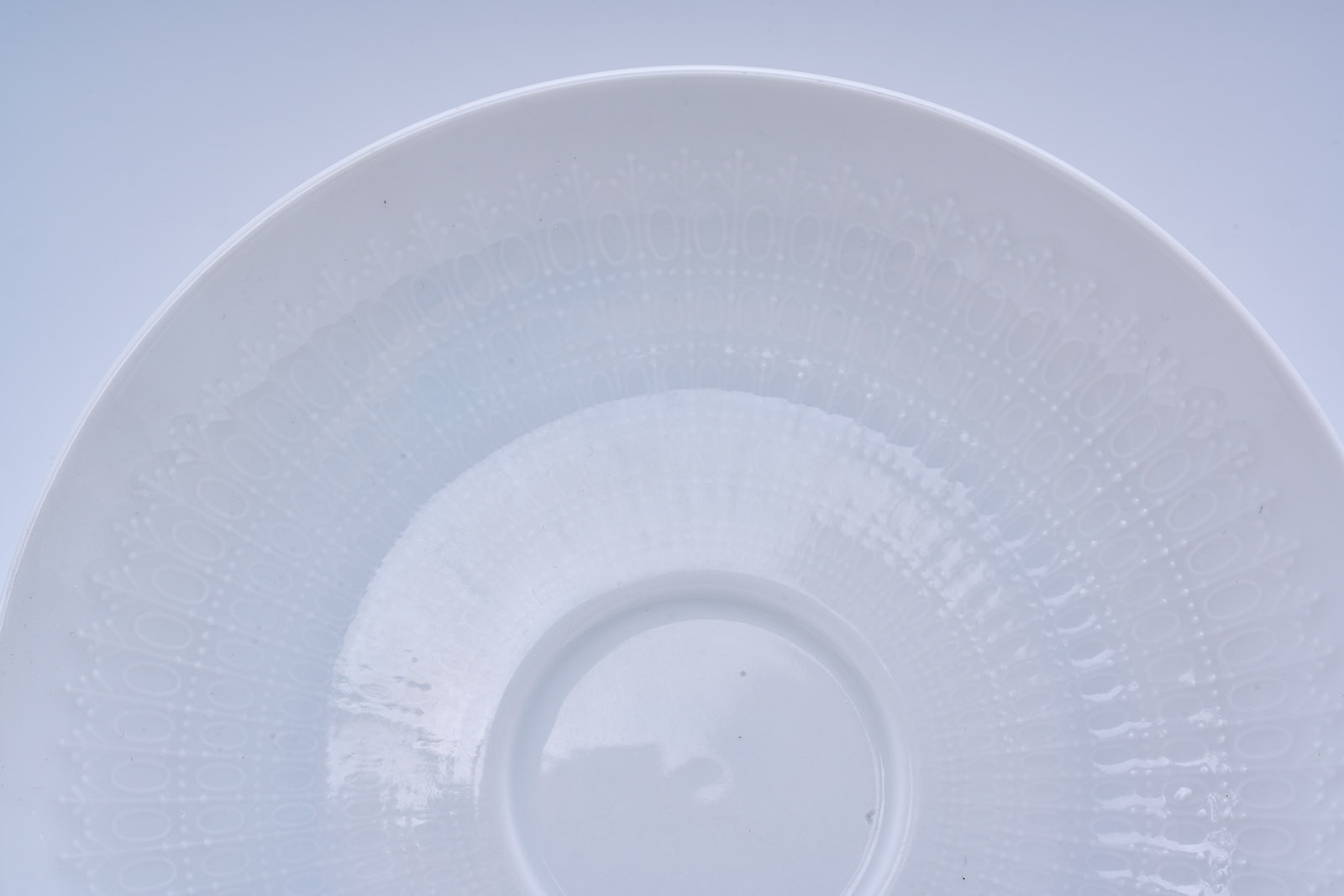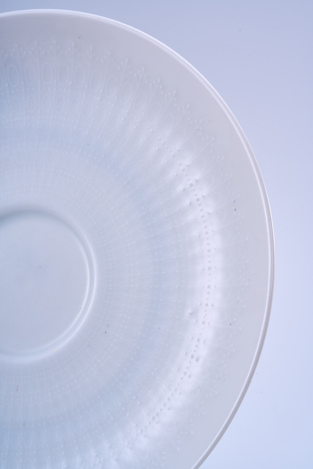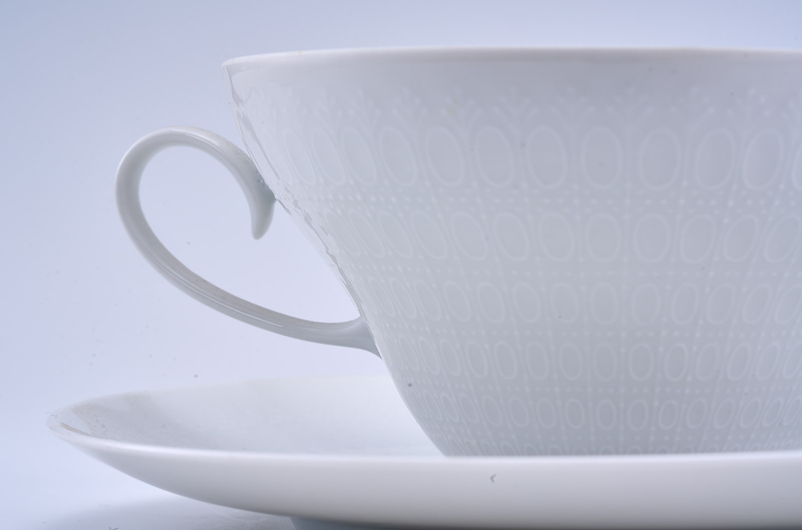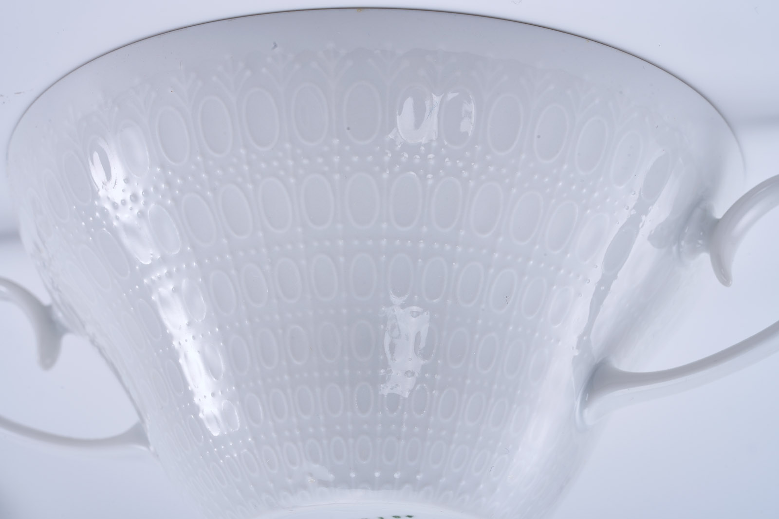 Form „Romanze“, weiß glasiert. Entw.: Björn Wijnblad. Am Boden grüner Firmenstempel m. „studio-linie“ bzw. „Germany“. Bestehend aus: 5 Suppentassen, 6 UT, zus. 11 Teile.