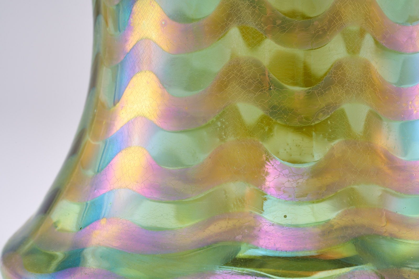 Grünes Glas m. gelber Fadenauflage, irisierend überfangen. Weiter Zylinder m. gewellter Wandung, zu Stand und stark gewellter Lippe hin stark ausschwingend. Wandung umlaufend m. Wellenband-Muster. Boden m. ausgeschliffenem Abriß, ungemarkt. Luftblaseneinschlüsse, Oberfläche partiell leicht berieben. H 15 cm
