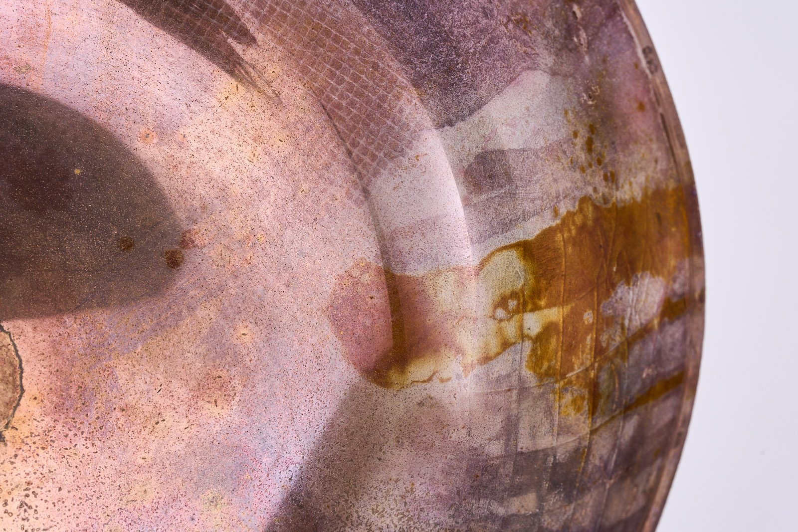 Farbloses Glas m. Farbverlauf außen, innen poliert und violett-irisierend überfangen, außen m. versch. Textil- und Gitter- Struktur, mattiert. Unsign. D 21,5 cm