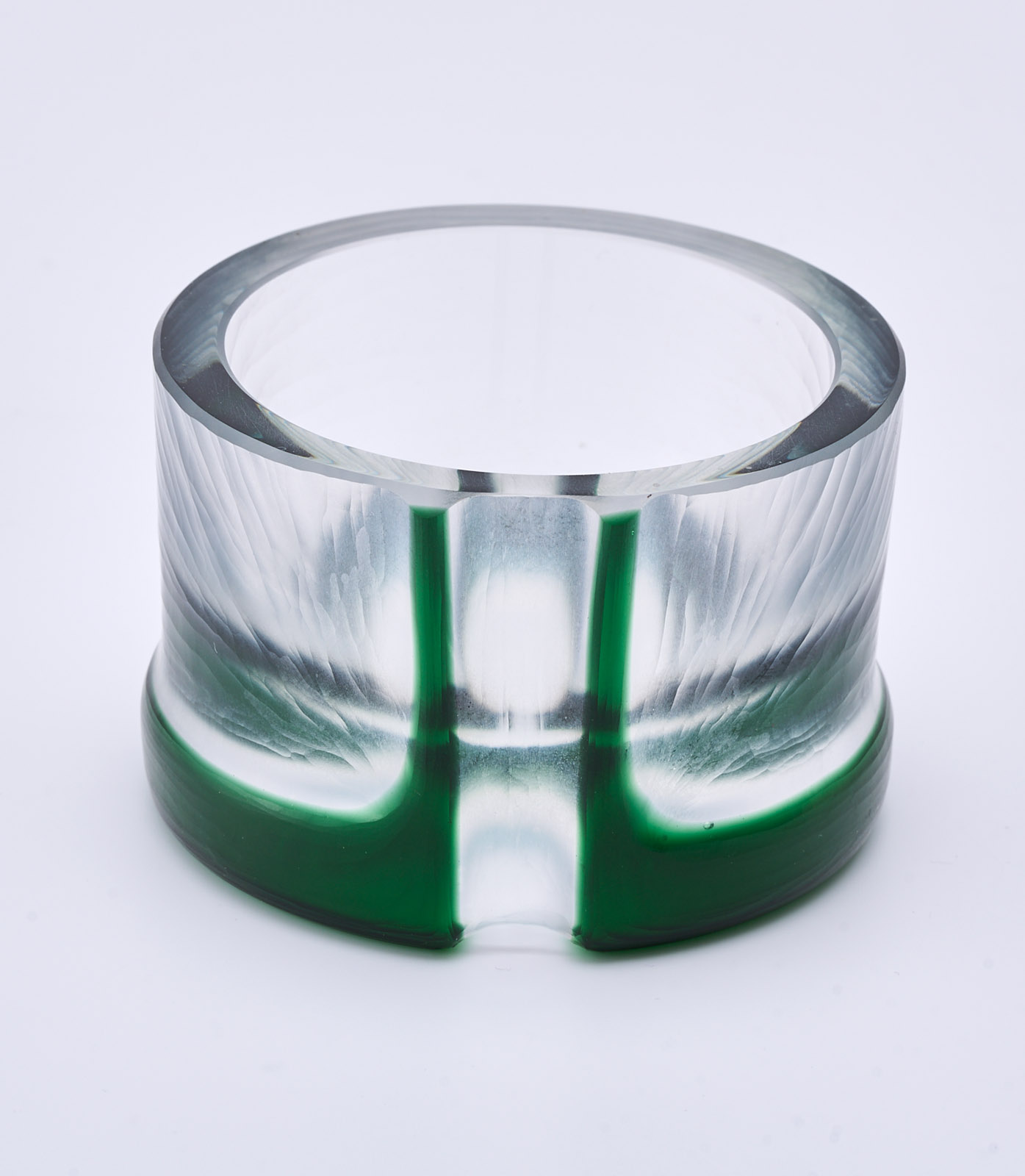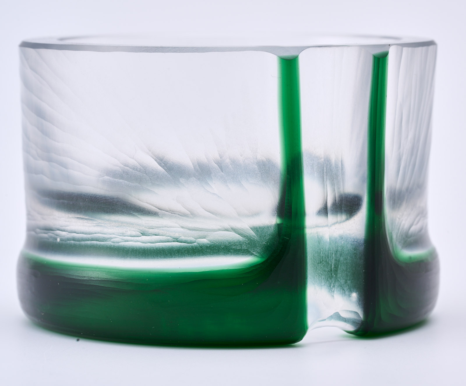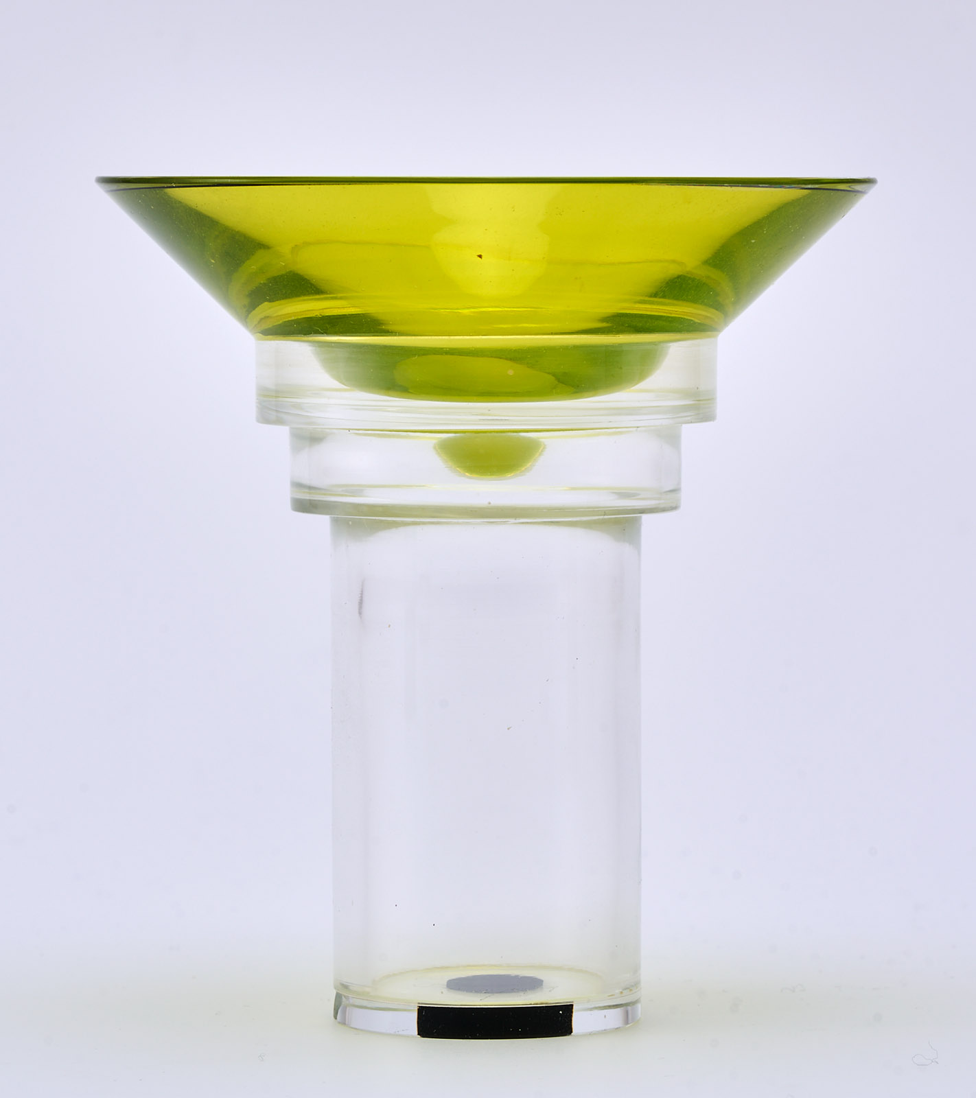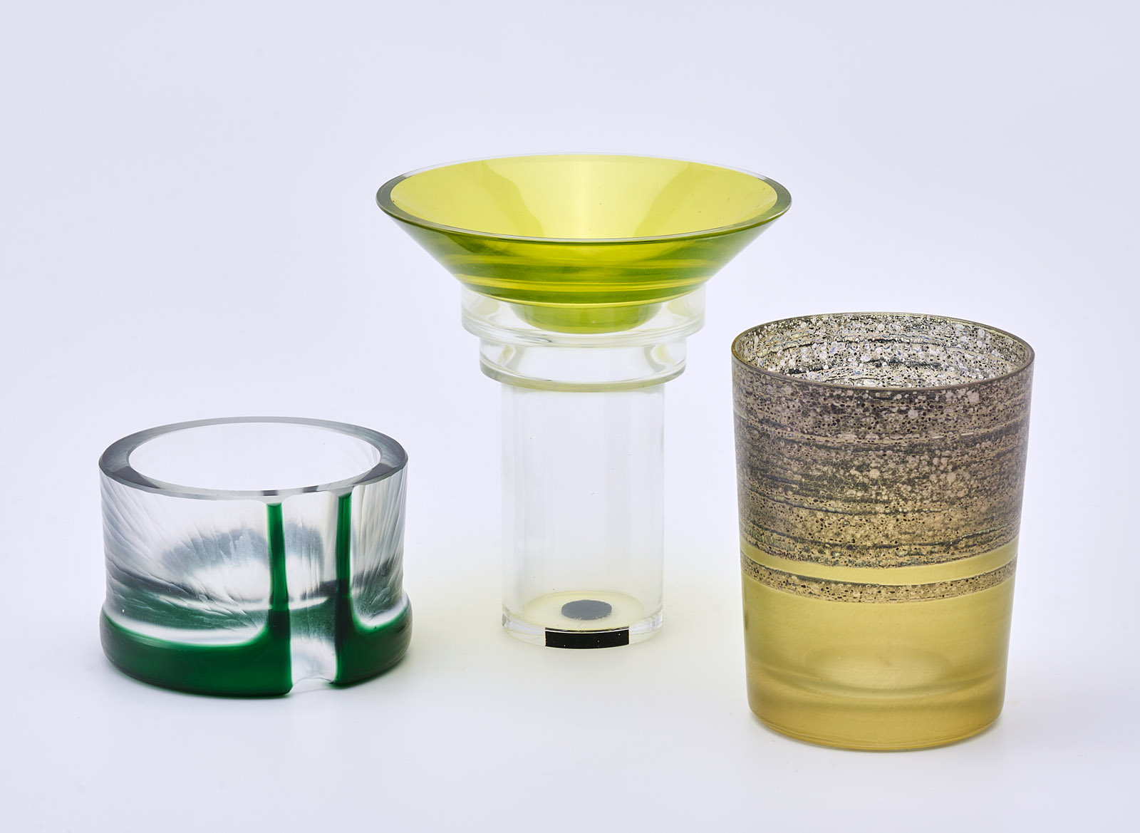 Farbloses und buntes Glas m. Auflagen- und Schliffdekor. Jew. am Boden sign. und dat. a) Cocktailglas Borek Sipek: weiter, gelber Kelch, in hohlen Schaft spitz zulaufend, Schaftansatz getreppt, stumpfer Stand m. geschlossenem Boden. Dieser m. schw. Punkt-Einschmelzung, v. innen geritzt monogr. „B.S.“, Nr. „4/99“. H 10,2 cm b) kl. Schale Gerd Genter: niedrige, runde Form, die massive Wandung innen poliert und außen grob mattiert m. gefurchter Partie, flankiert v. nach unten schwingendem grünem Band. Ausge-schliffener Boden geritzt sign. und dat. „Genter 1978“. D 7 cm c) kl. Becherglas Klaus Moje/ Isgard Moje-Wohlgemuth: zylindr. Form m. grau-silbriger Aufschmelzung im oberen Teil, der geschliffene Boden geritzt sign. und dat. „Moje 70“. H 8,2 cm
