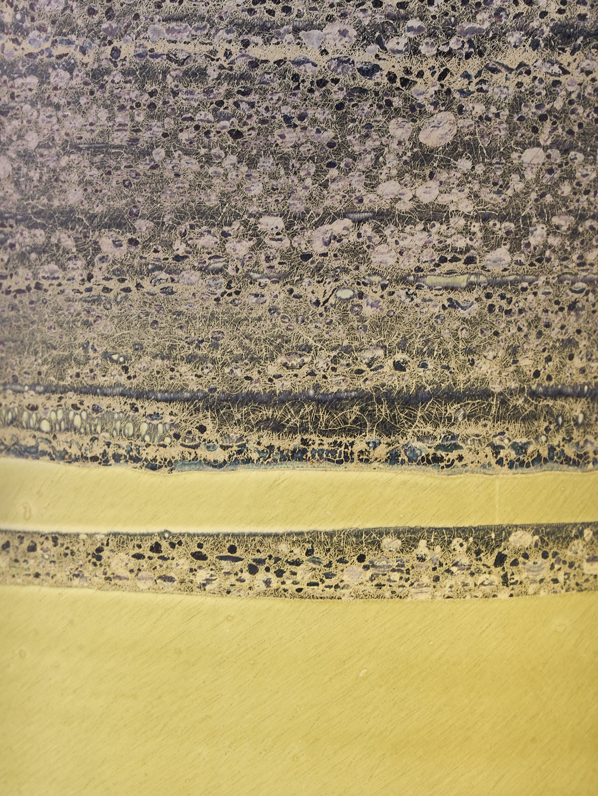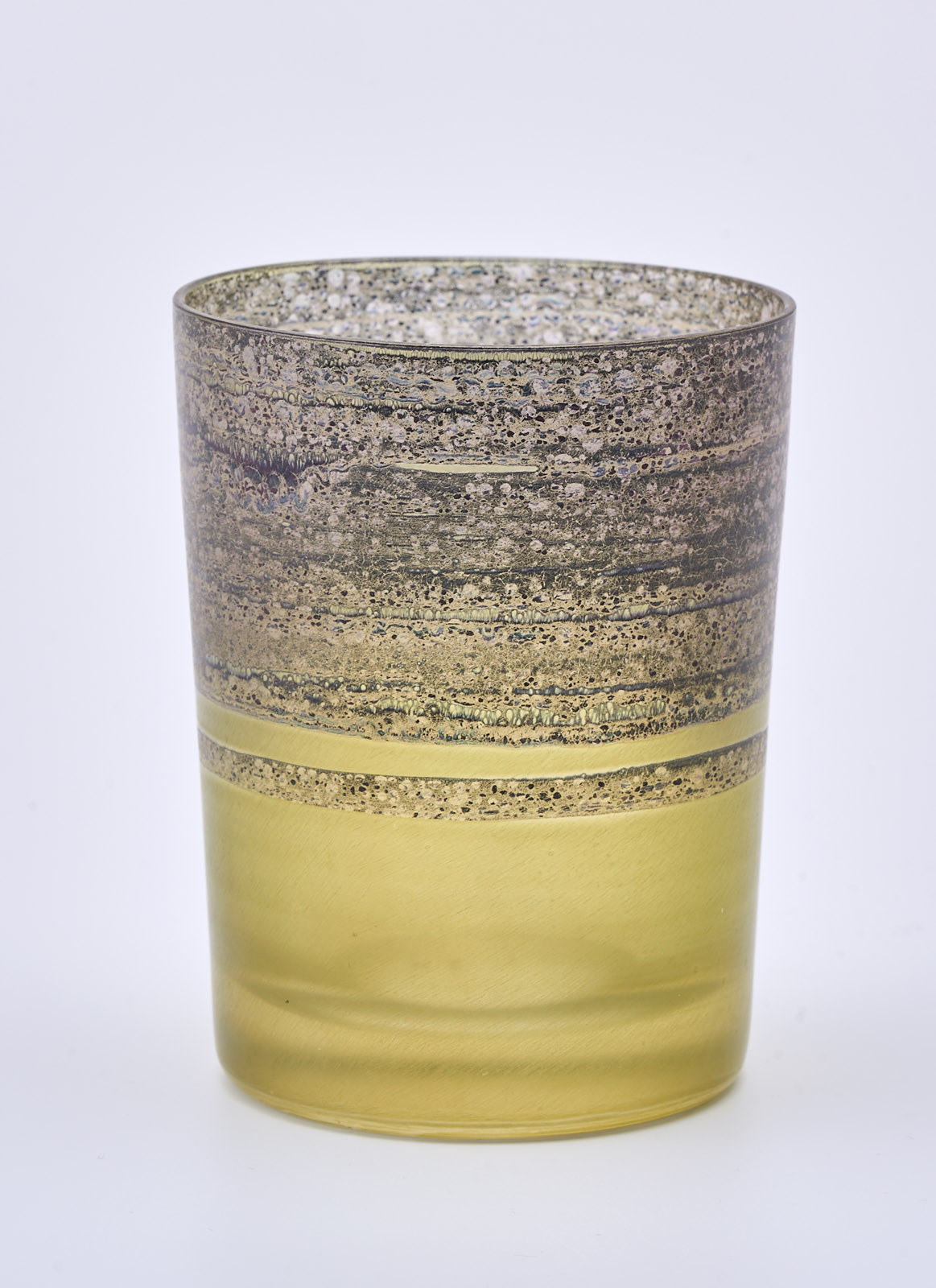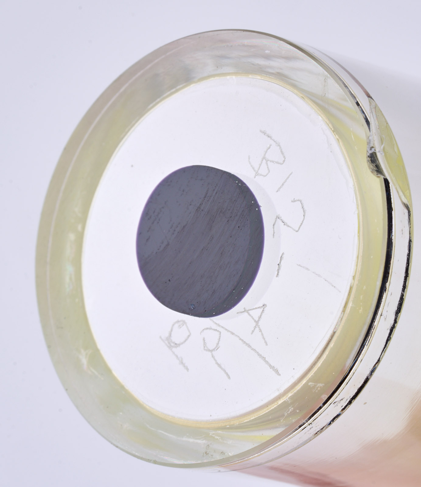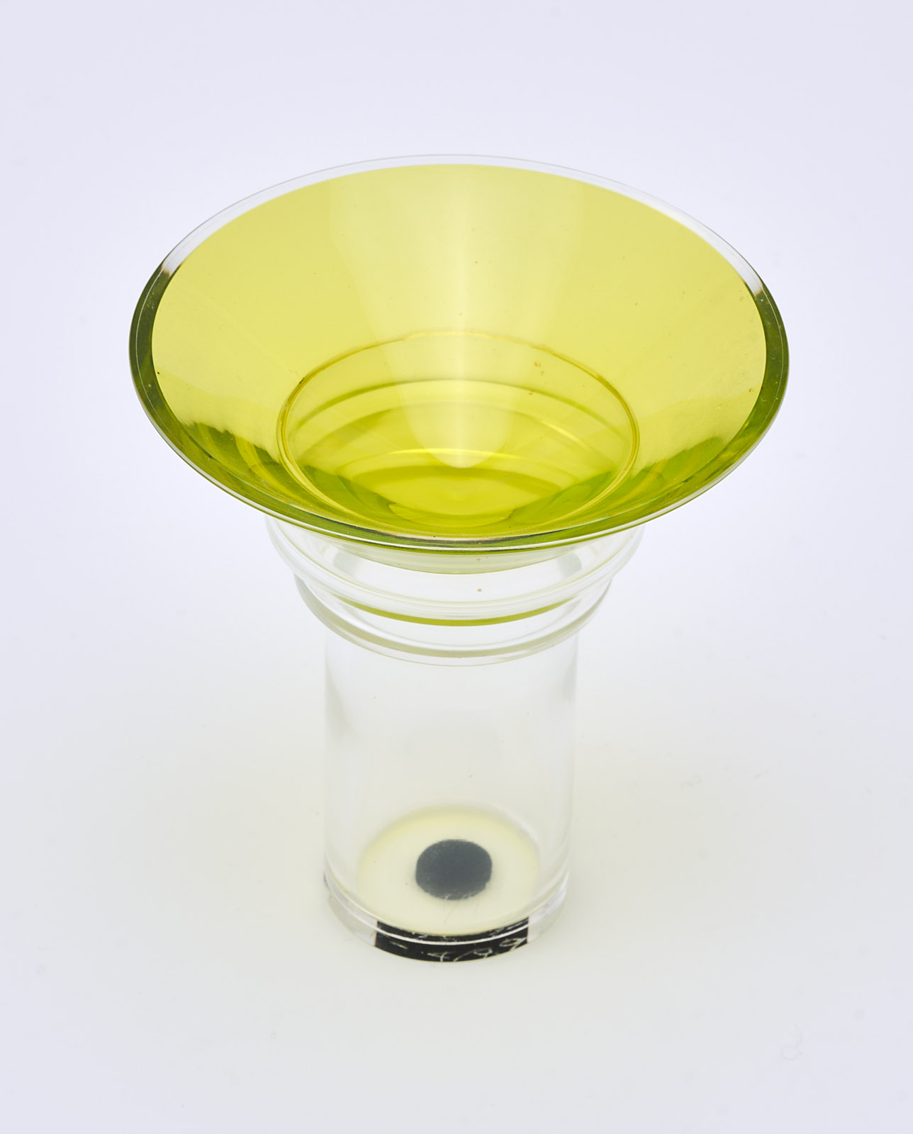 Farbloses und buntes Glas m. Auflagen- und Schliffdekor. Jew. am Boden sign. und dat. a) Cocktailglas Borek Sipek: weiter, gelber Kelch, in hohlen Schaft spitz zulaufend, Schaftansatz getreppt, stumpfer Stand m. geschlossenem Boden. Dieser m. schw. Punkt-Einschmelzung, v. innen geritzt monogr. „B.S.“, Nr. „4/99“. H 10,2 cm b) kl. Schale Gerd Genter: niedrige, runde Form, die massive Wandung innen poliert und außen grob mattiert m. gefurchter Partie, flankiert v. nach unten schwingendem grünem Band. Ausge-schliffener Boden geritzt sign. und dat. „Genter 1978“. D 7 cm c) kl. Becherglas Klaus Moje/ Isgard Moje-Wohlgemuth: zylindr. Form m. grau-silbriger Aufschmelzung im oberen Teil, der geschliffene Boden geritzt sign. und dat. „Moje 70“. H 8,2 cm