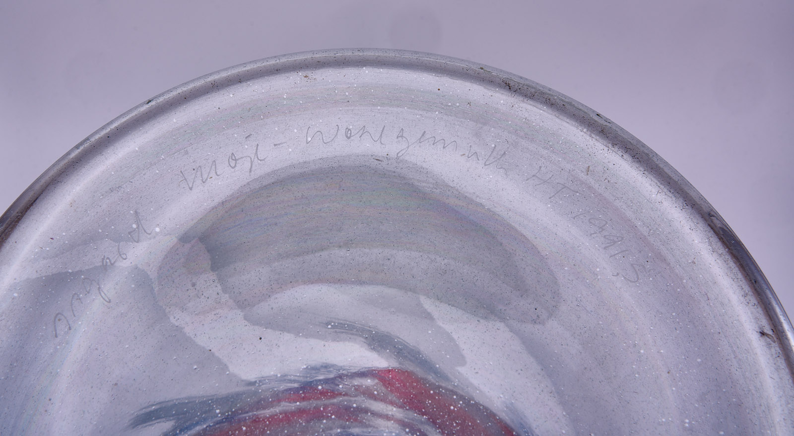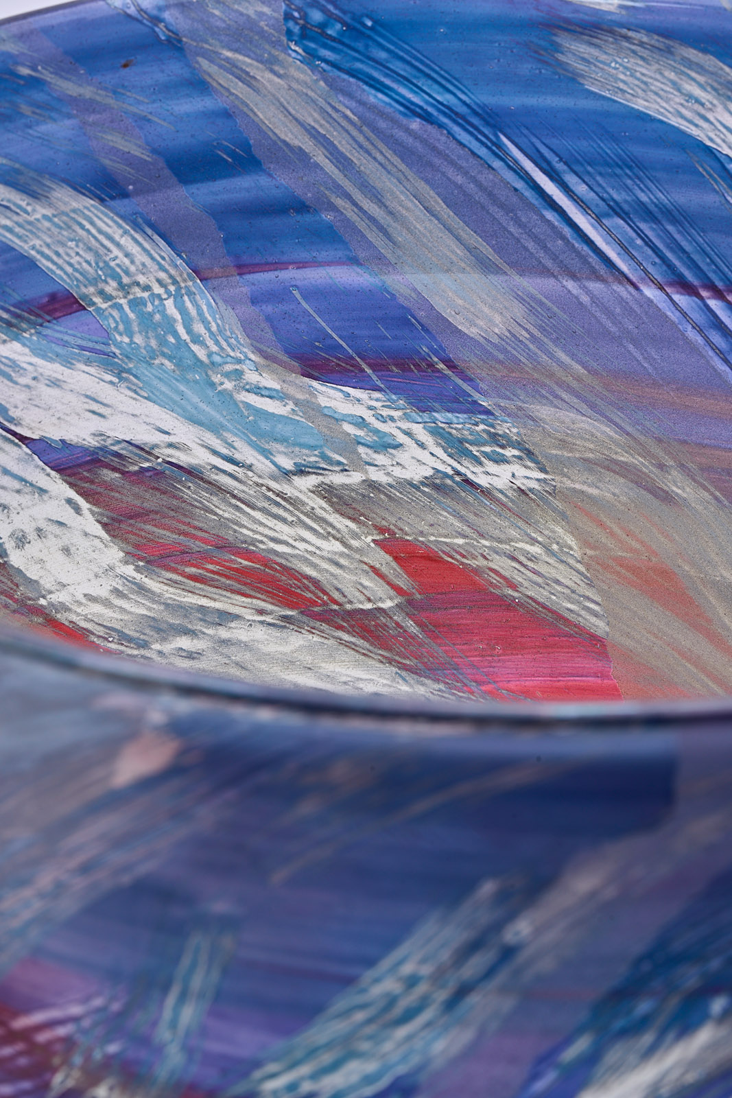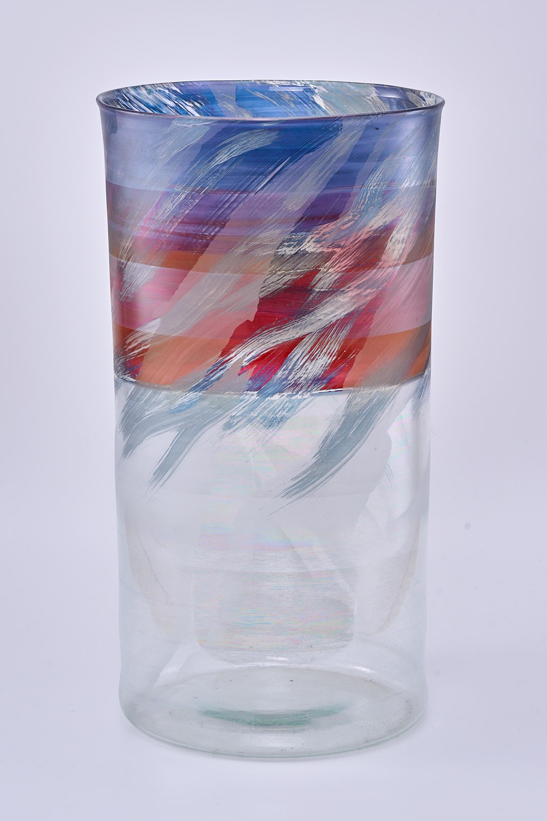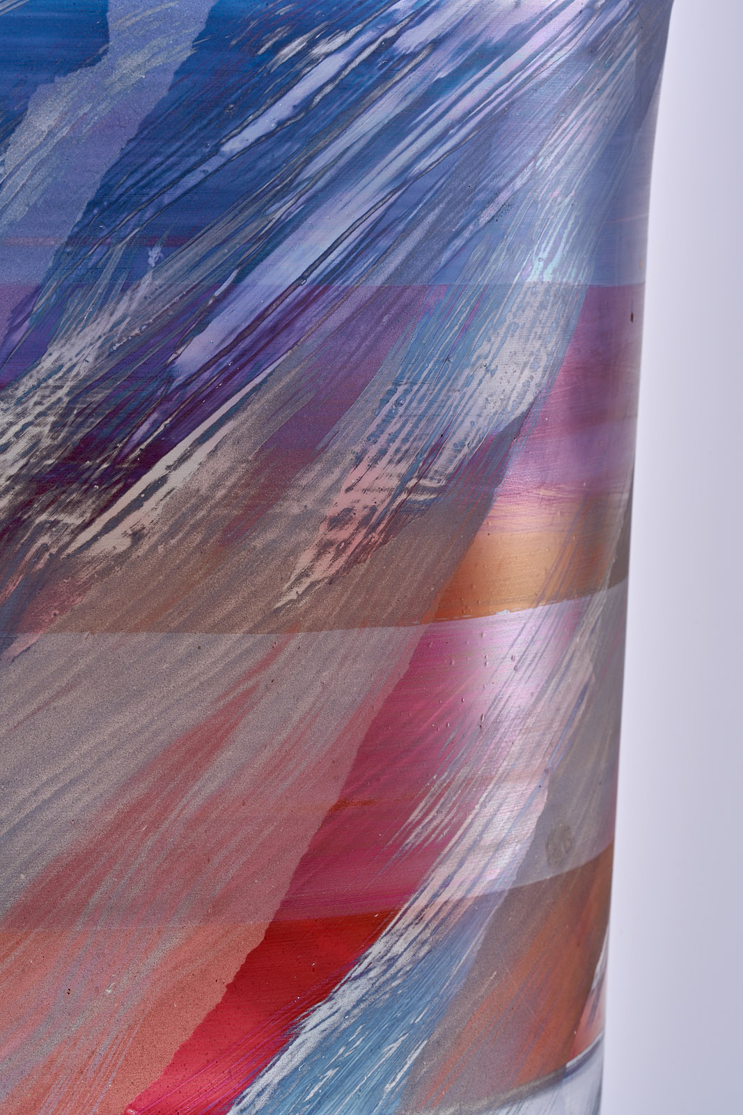 Farbloses Glas, versch. farbig und metallisch glänzend überfangen, partiell mattiert, leicht irisierend. Hoher, zylindr. Korpus, nach oben ins Ovale m. minim. ausschwingender Lippe übergehend. Umlaufendes Band- und Wisch-Dekor. Am Boden geritzt sign. und dat. „Isgard Moje-Wohlgemuth HT 1991 S“. Oberfläche minimal berieben. H 53,8 cm
