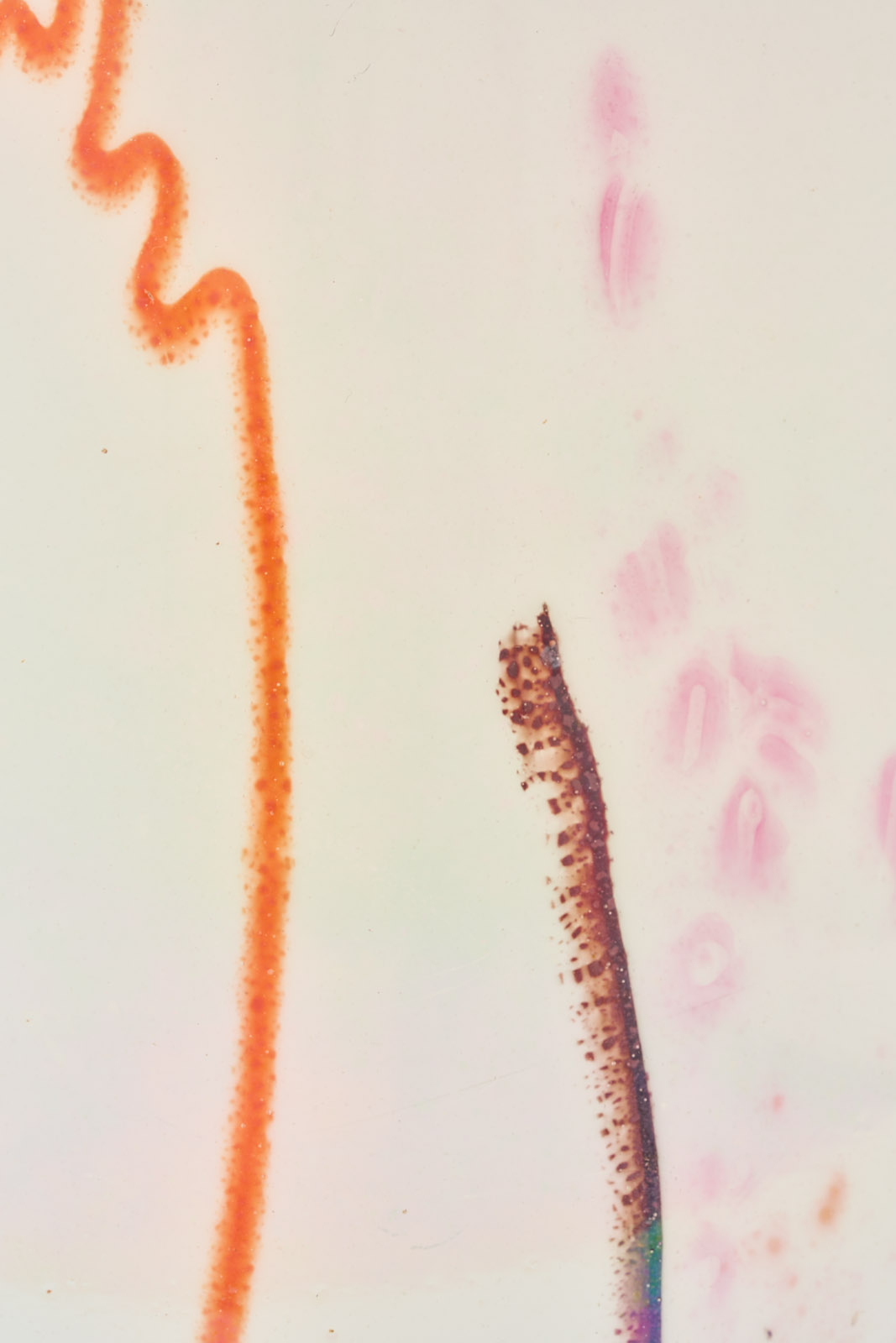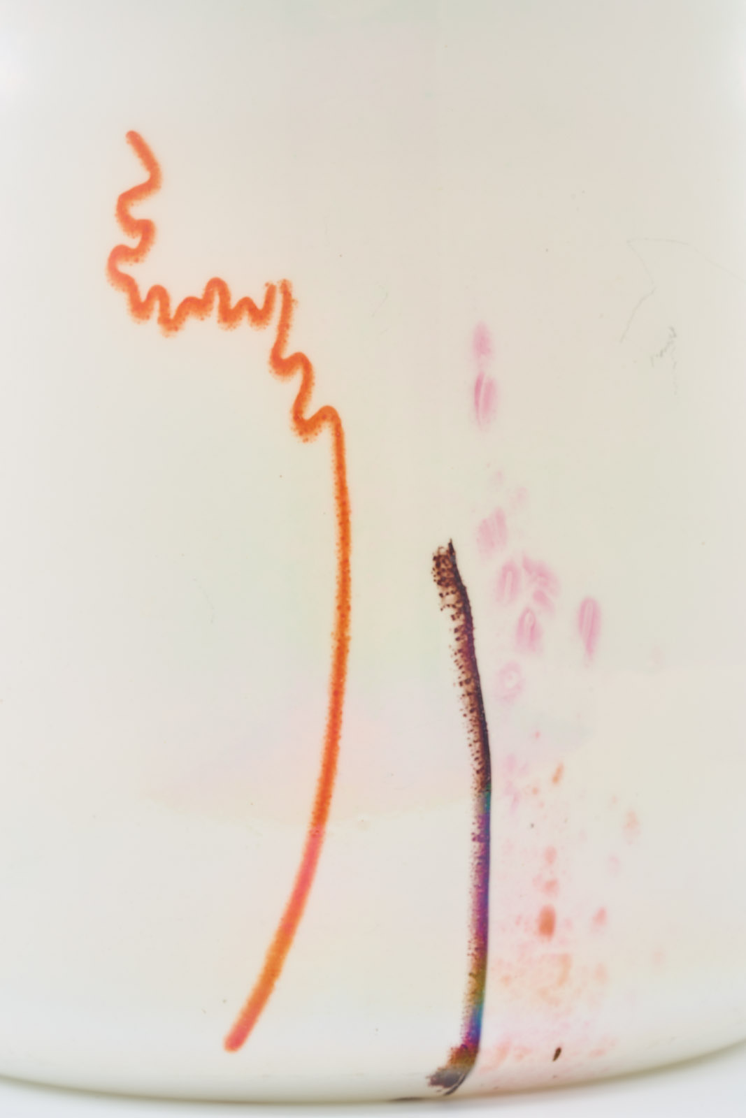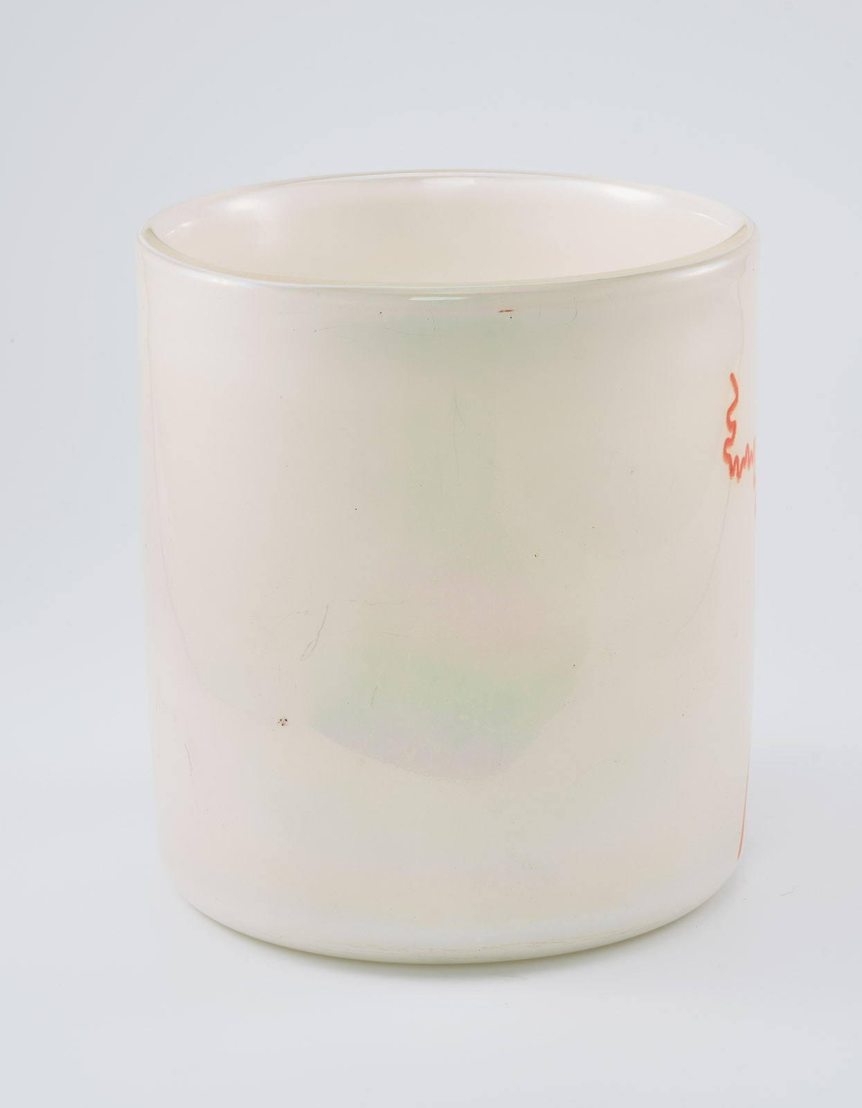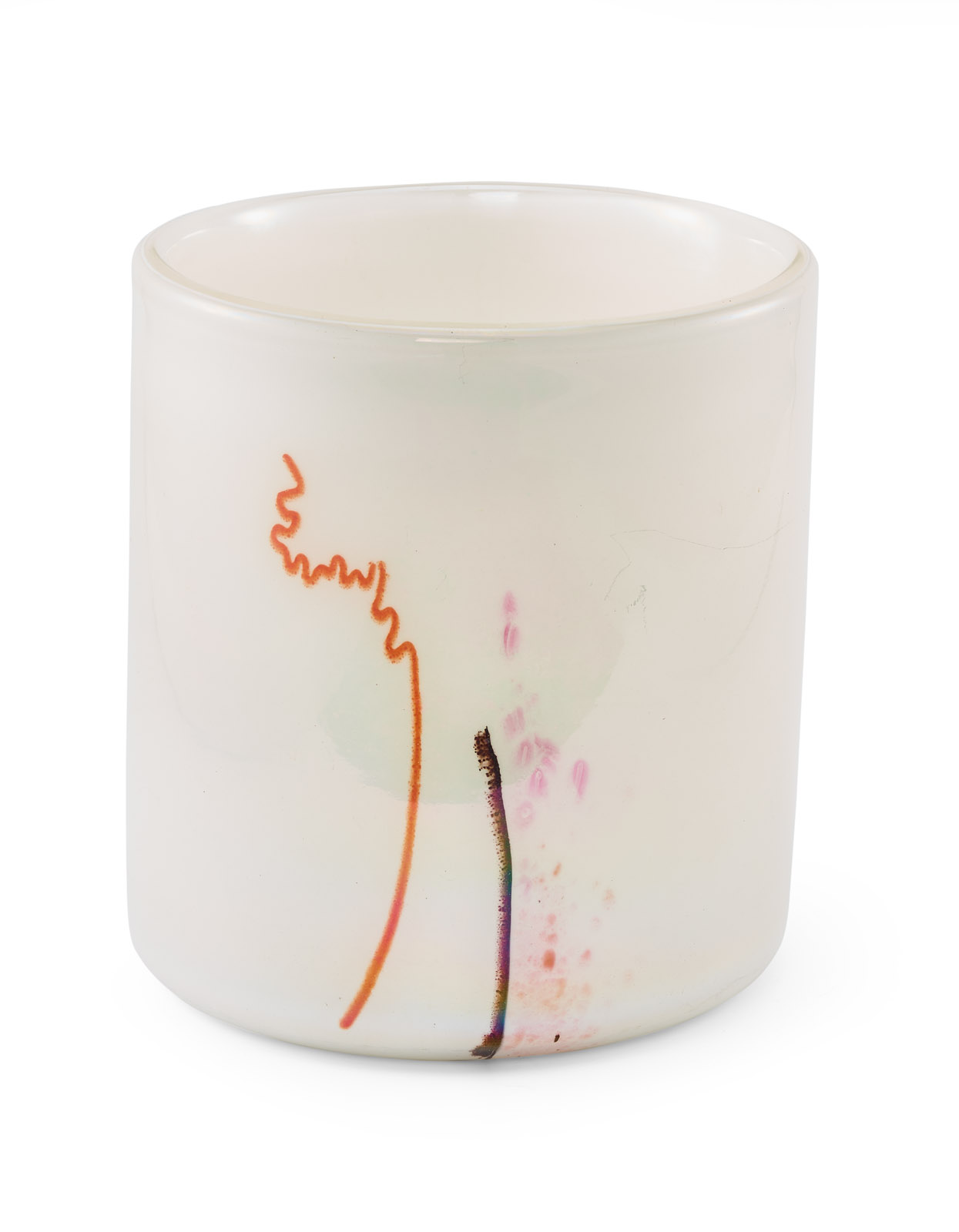 Farbloses Glas m. weißer Zwischenschicht m. farbigen Fadeneinschmelzungen, außen irisierend überfangen. Weite, zylindr. Form. gerundeter Lippe und Standkante. Boden m. Abriß, unsign. Oberfläche leicht berieben. H 24,2 cm
