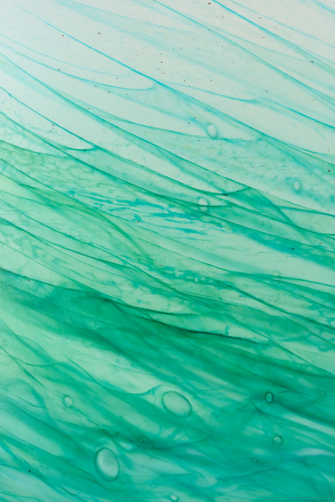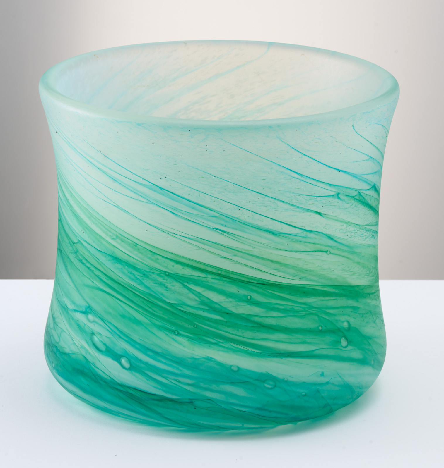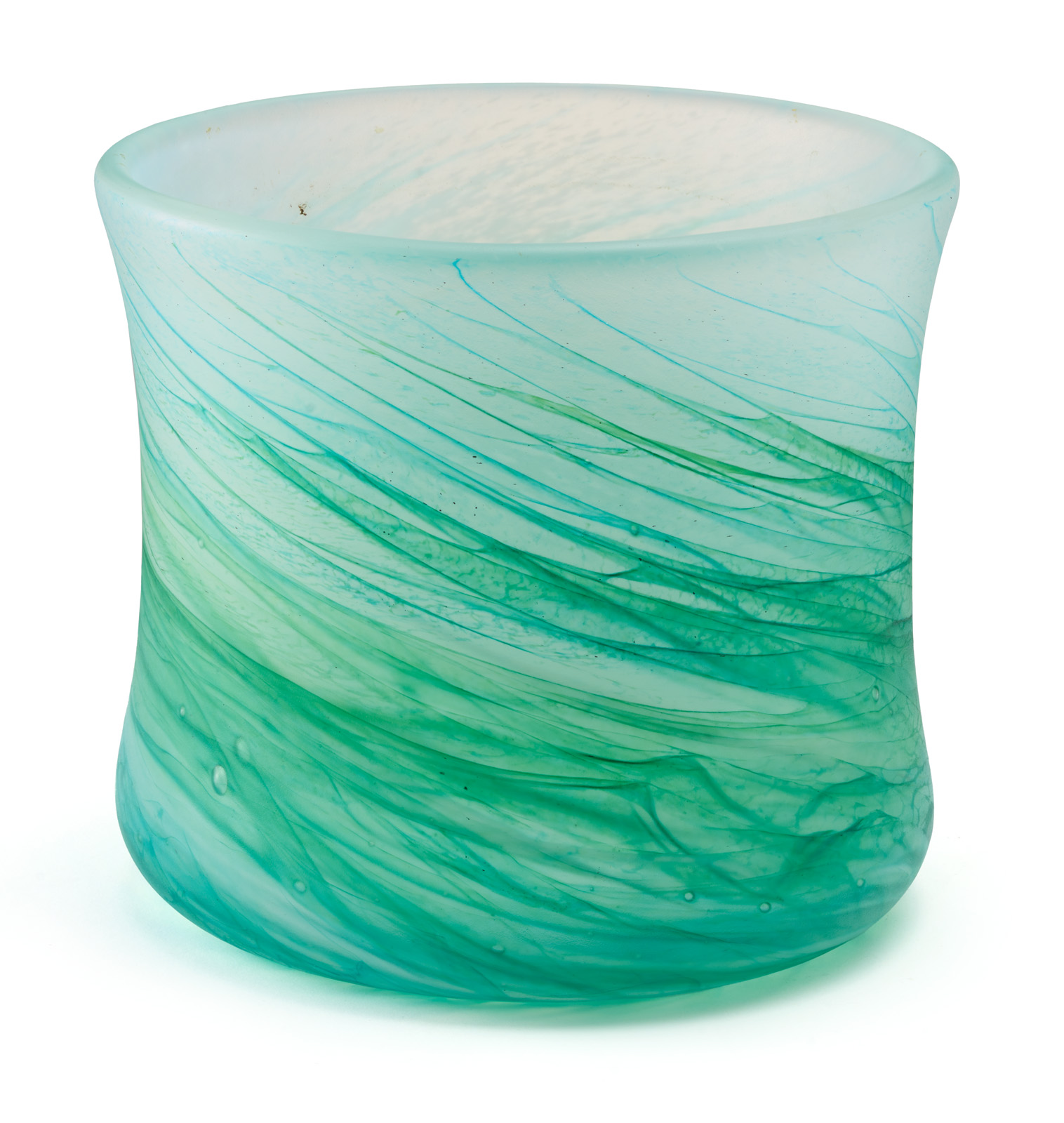 Farbloses Glas m. weißer und grüner Pulverein-schmelzung, satiniert. Zylindr. Korpus m. leicht eingeschwungener Wandung und gerundetem Stand. Dickwandig m. Luftblasen-Einschlüssen. Boden m. ausgeschliffenem Abriß, unsign. H 19 cm