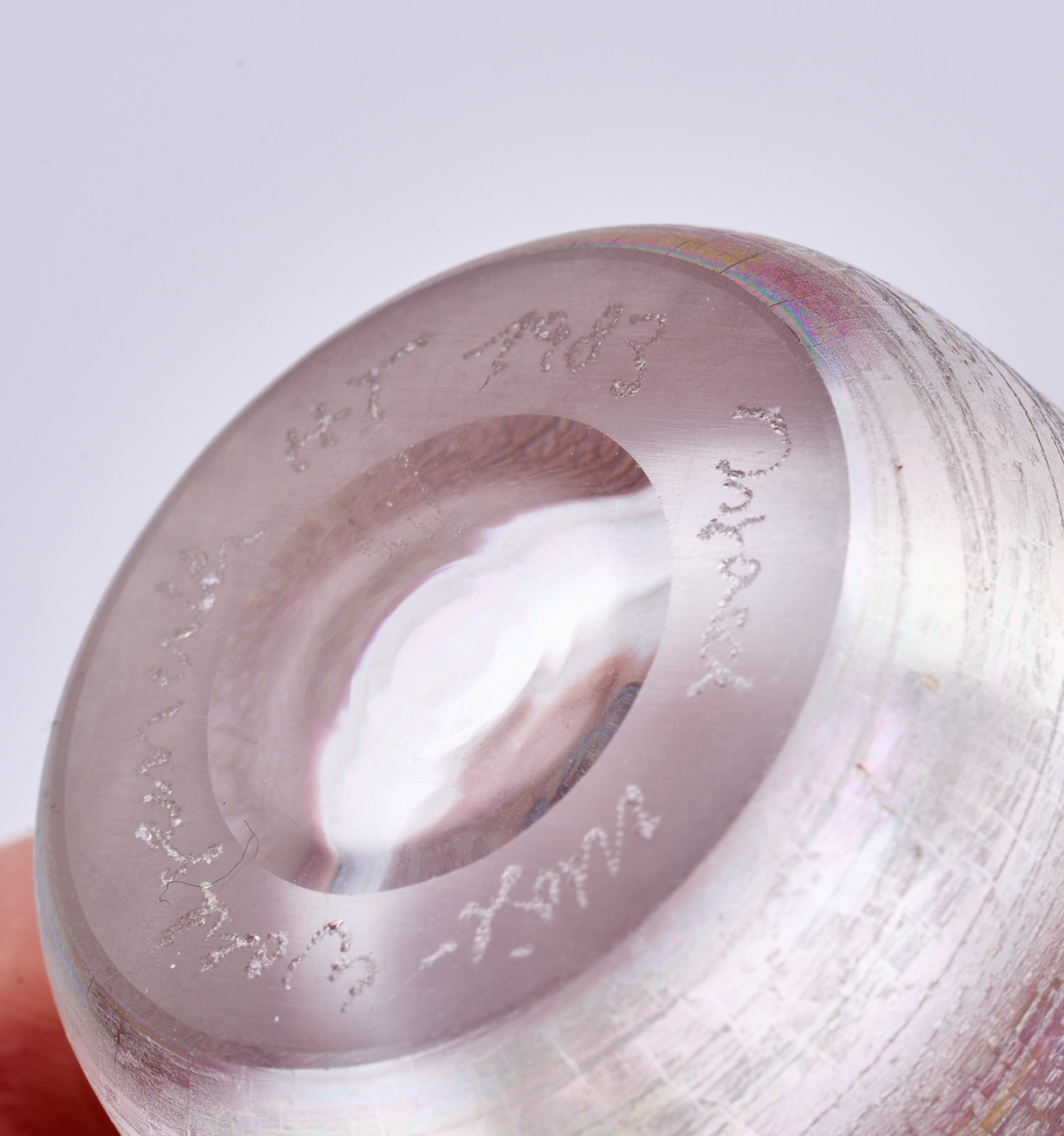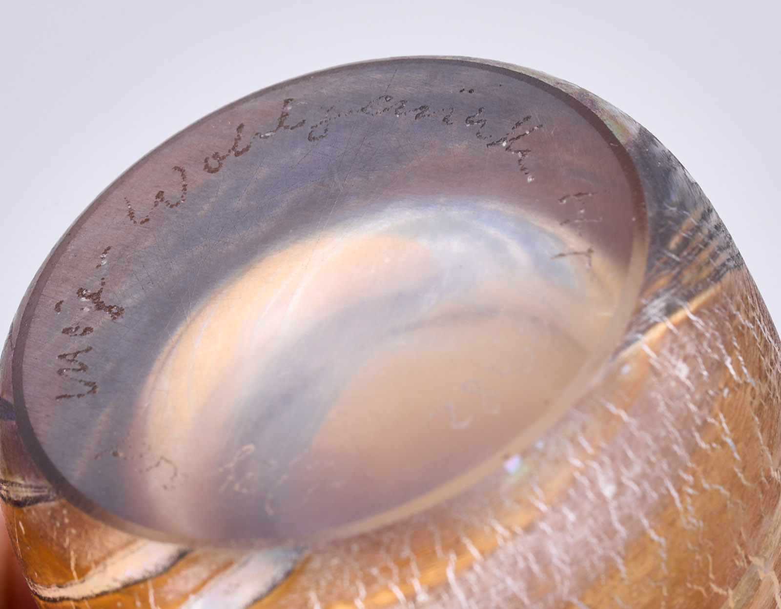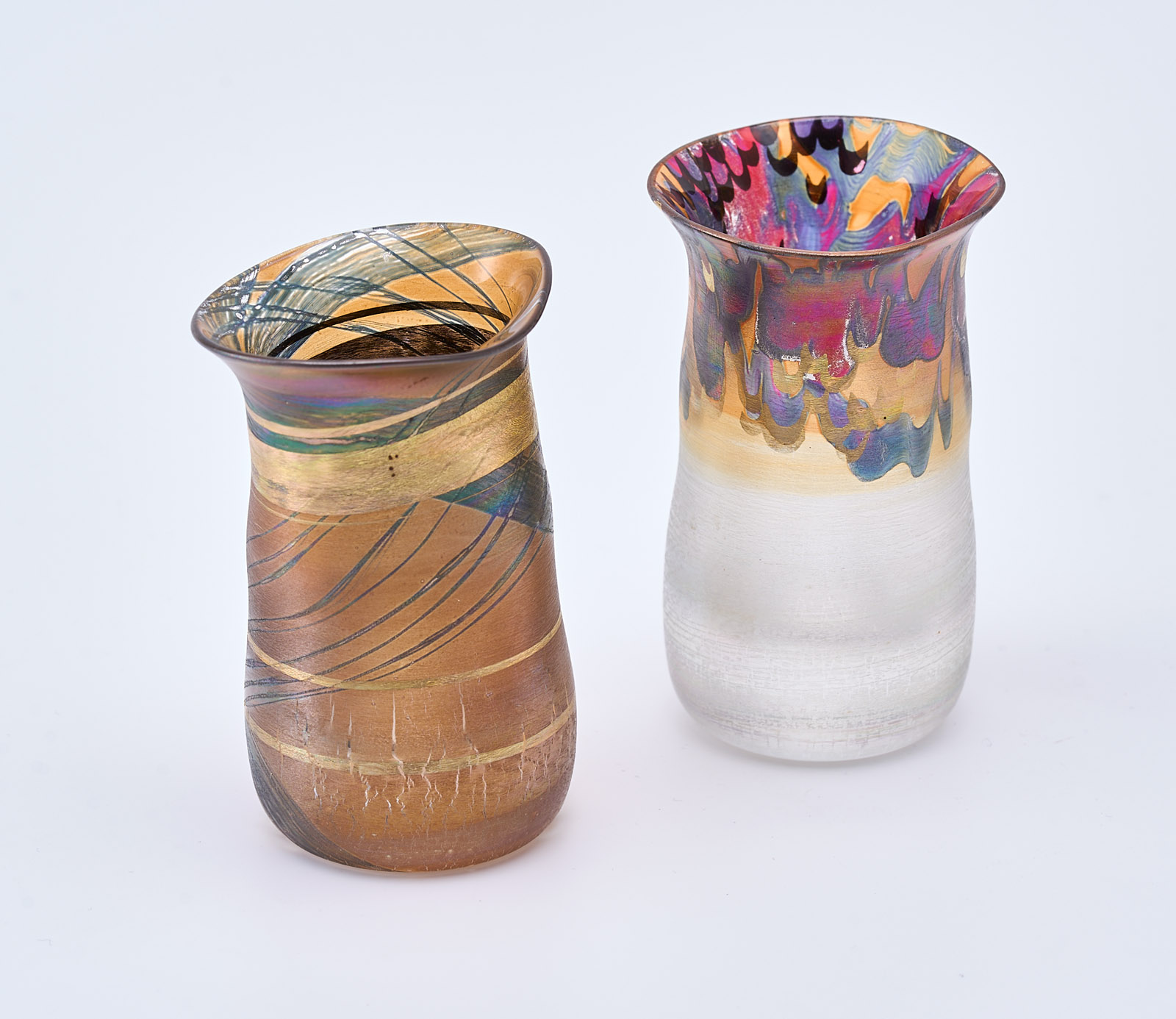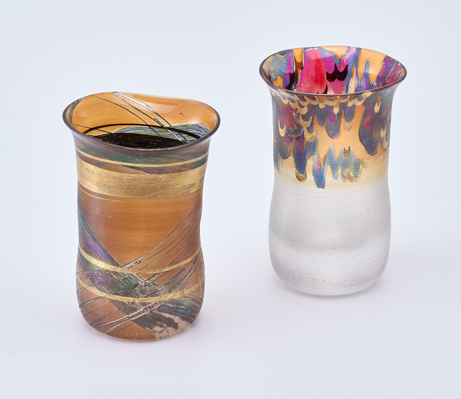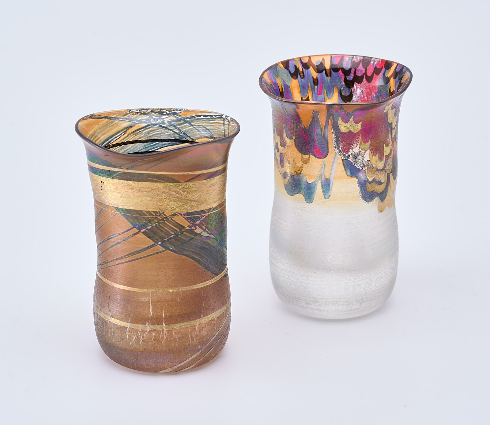 Farbloses Glas m. versch. farbigen Auflagen und Golddekor. Jew. zylindr., leicht verzogene Form m. ausschwingender Lippe, Wandung jeweils fein mattiert und umlaufend dekoriert. Jeweils Boden geschliffen, darin geritzt sign. „Isgard Moje-Wohlgemuth HT“ m. „1982“ bzw. „1983“. H 7,3 bzw. 7,5 cm