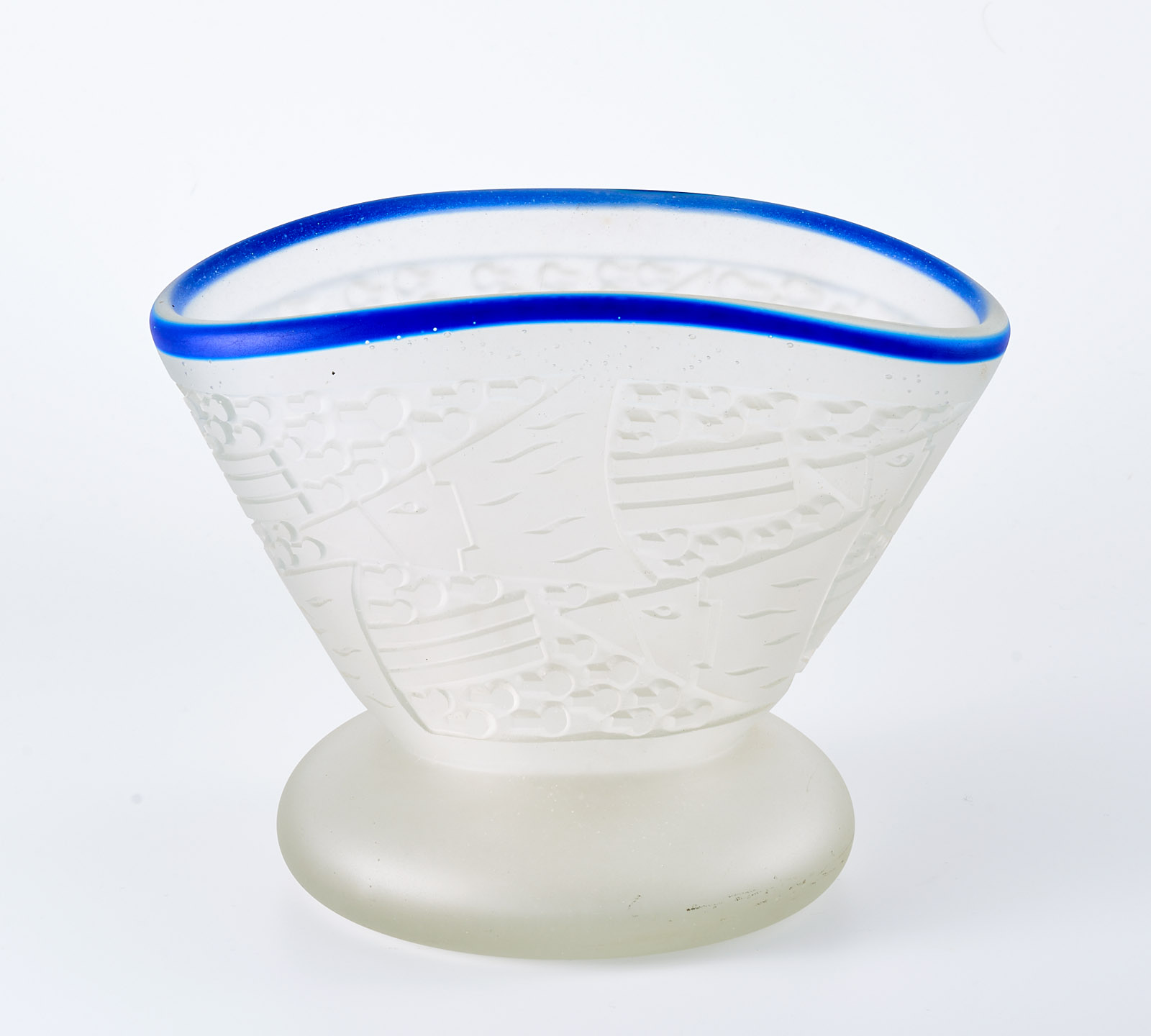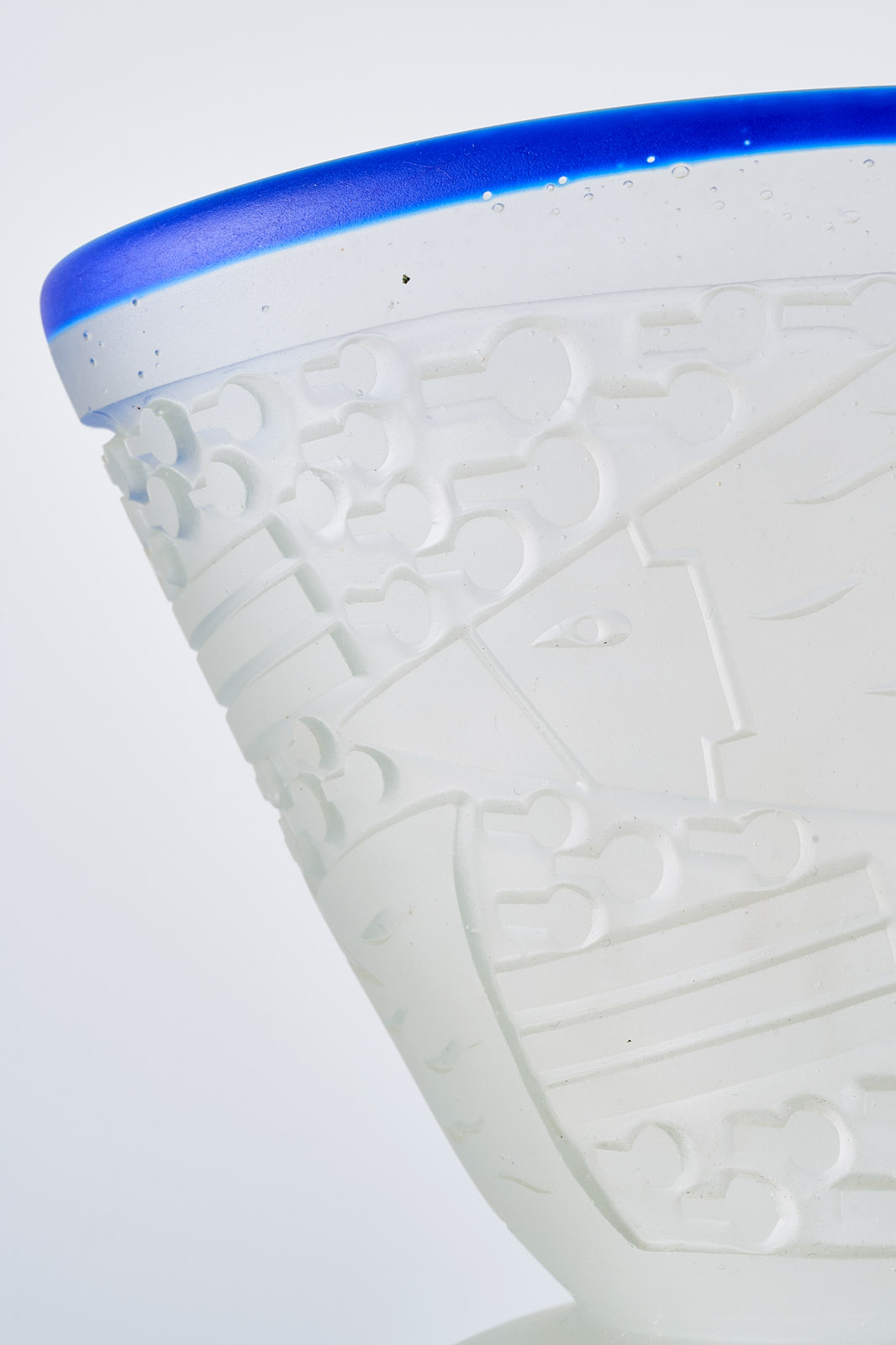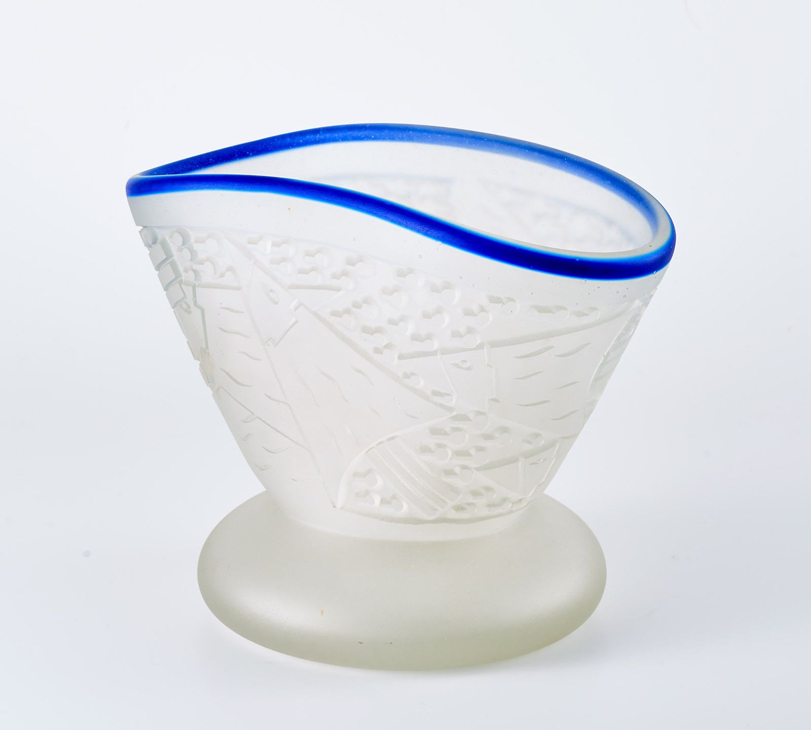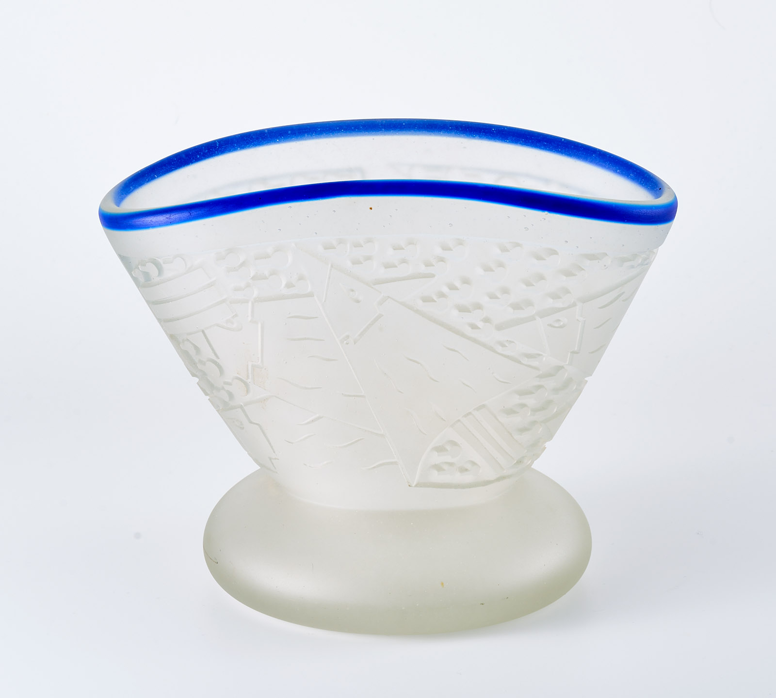 Farbloses, mattiertes Glas m. blauer Fadenauf-schmelzung. Gr. Fuß in gedrückter Kugelform, darauf sich nach oben stark weitender Kelch m. betonter, leicht geschwungener Lippe. Kelch-wandung umlaufend m. geometr. Schliffdekor m. stilis. Vögeln. Boden m. ausgeschliffenem Abriß, am Rand geritzt bez. „B-28-82“. H 18,8 cm
