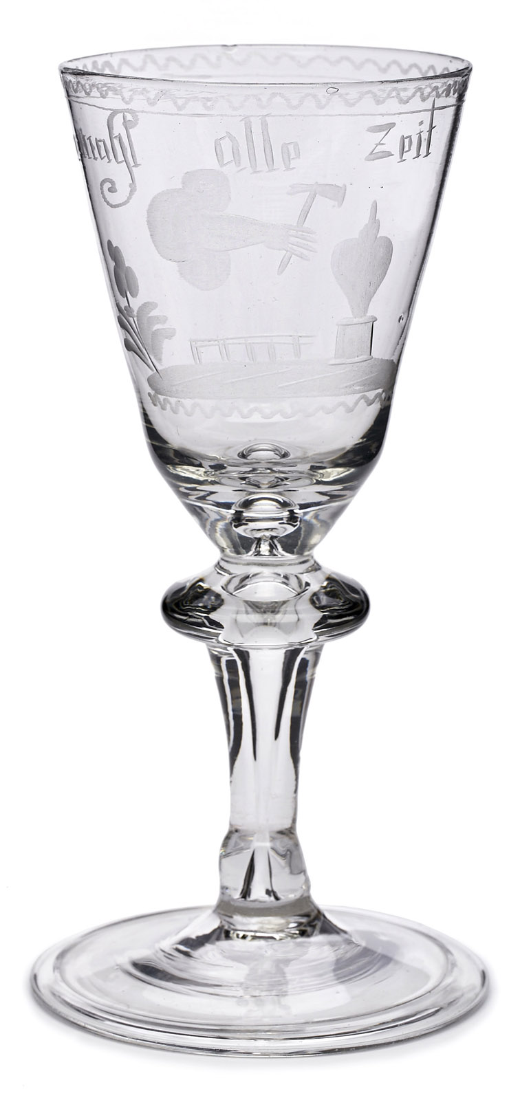 Farbloses Glas m. Schliffdekor. Kon. Kelch auf hohlem Schaft m. Nodus und leicht gewölbtem Rundfuß. Kelch schauseitig m. kl. Szene einer aus Wolke kommenden Hand m. Hammer, auf ein brennendes Herz zielend, unterfangen v. angedeuteter Gartenlandschaft, darüber Schriftzug „ein mahl alle Zeit“(sic!). Boden m. Abriß. Lippe m. minimalem Chip. H 16,6 cm