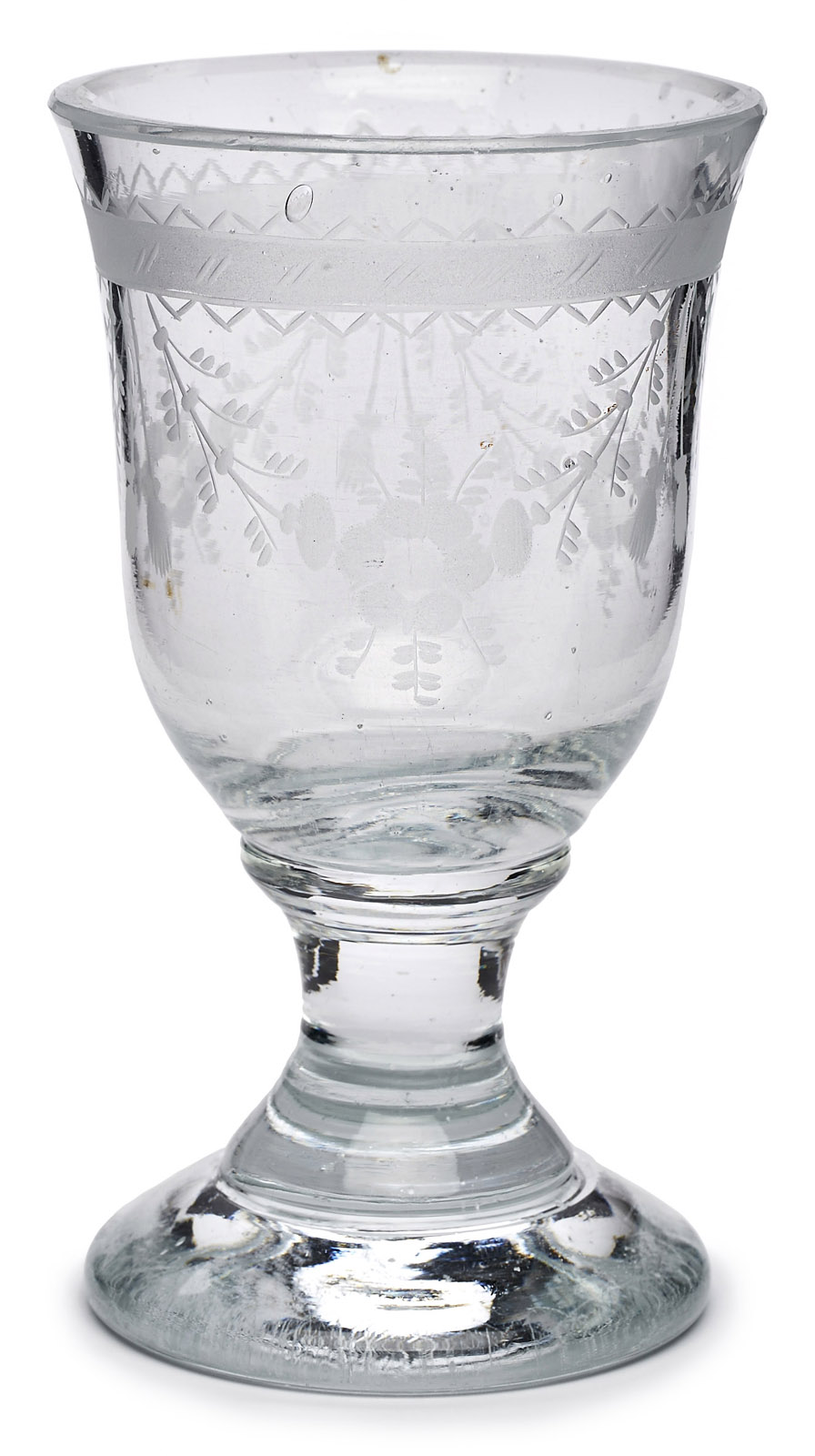 Farbloses Glas m. Schliffdekor. Hoher Kelch m. leicht ausschwingender Lippe, nach unten gerundet, der starke Schaft leicht gekehlt, in massiven Rundfuß ausschwingend. Kelch umlaufend m. Blumengirlanden m. Quasten an Band. Stand berieben, Kelch minim. berieben/ Lippe m. ausgeschliffener Stelle. H 14,6 cm