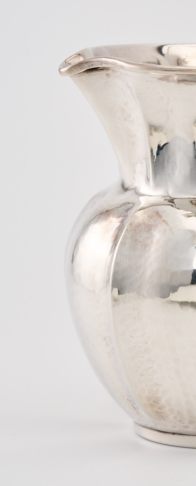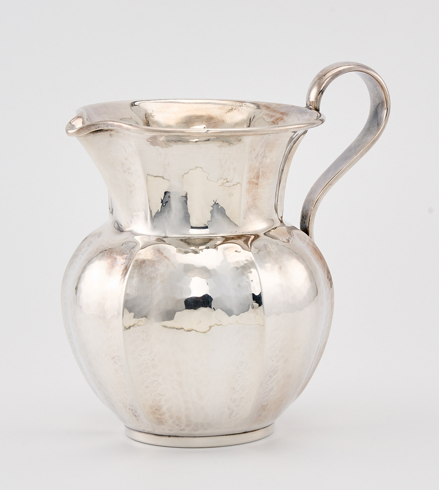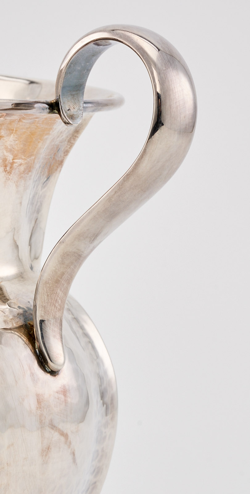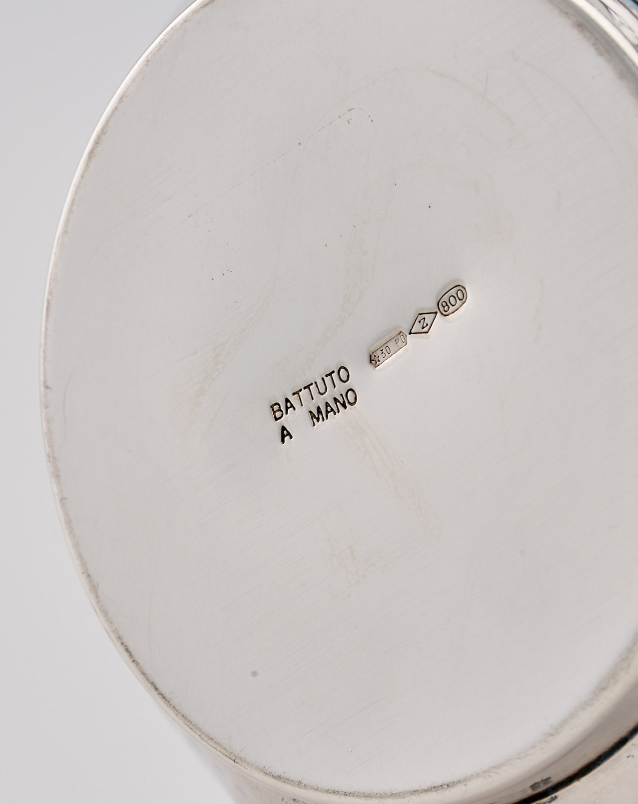 800er Silber. Bez. „Battuto a Mano“. Kugelige Wandung m. ausschwingendem Kelch m. kl. Ausguß-Spitze, gegenüber der geschwungene Bandhenkel. Ges. Wandung m. Hammerschlag-Oberfläche, leicht geschweift m. feinen Graten. Oberfläche minimal berieben. H 15,8 cm, 358g