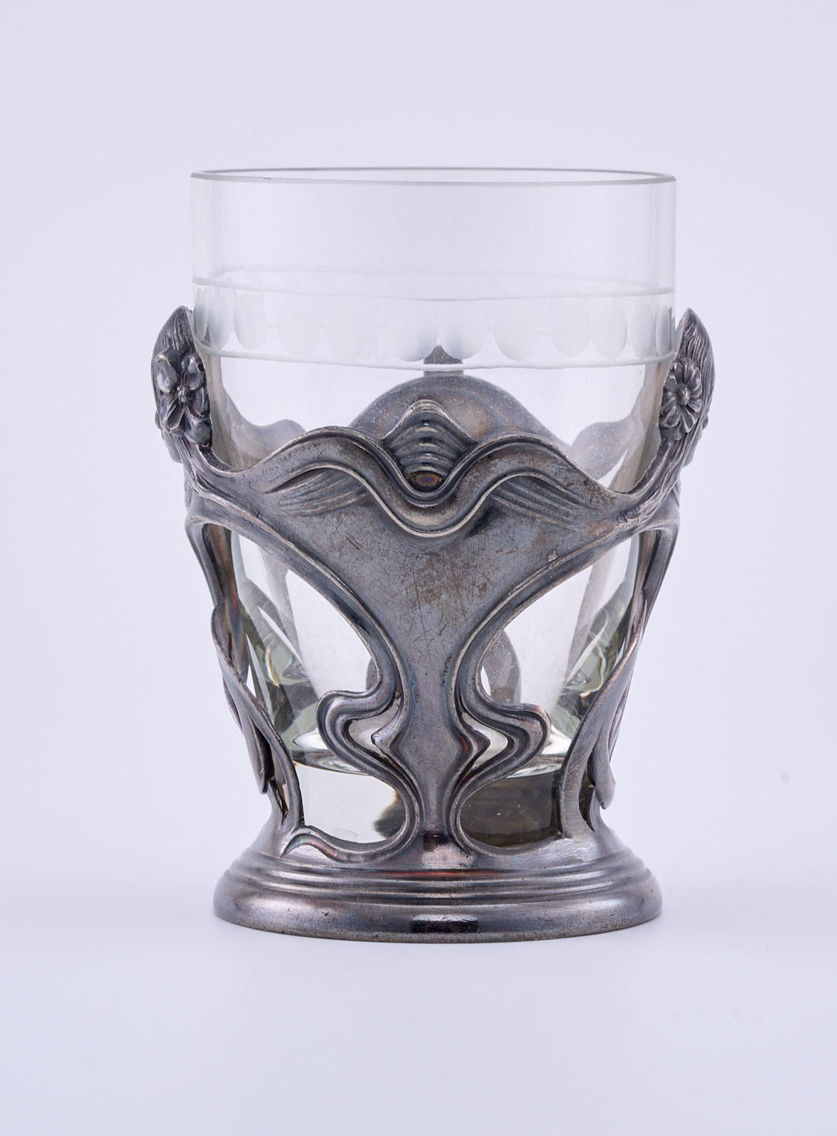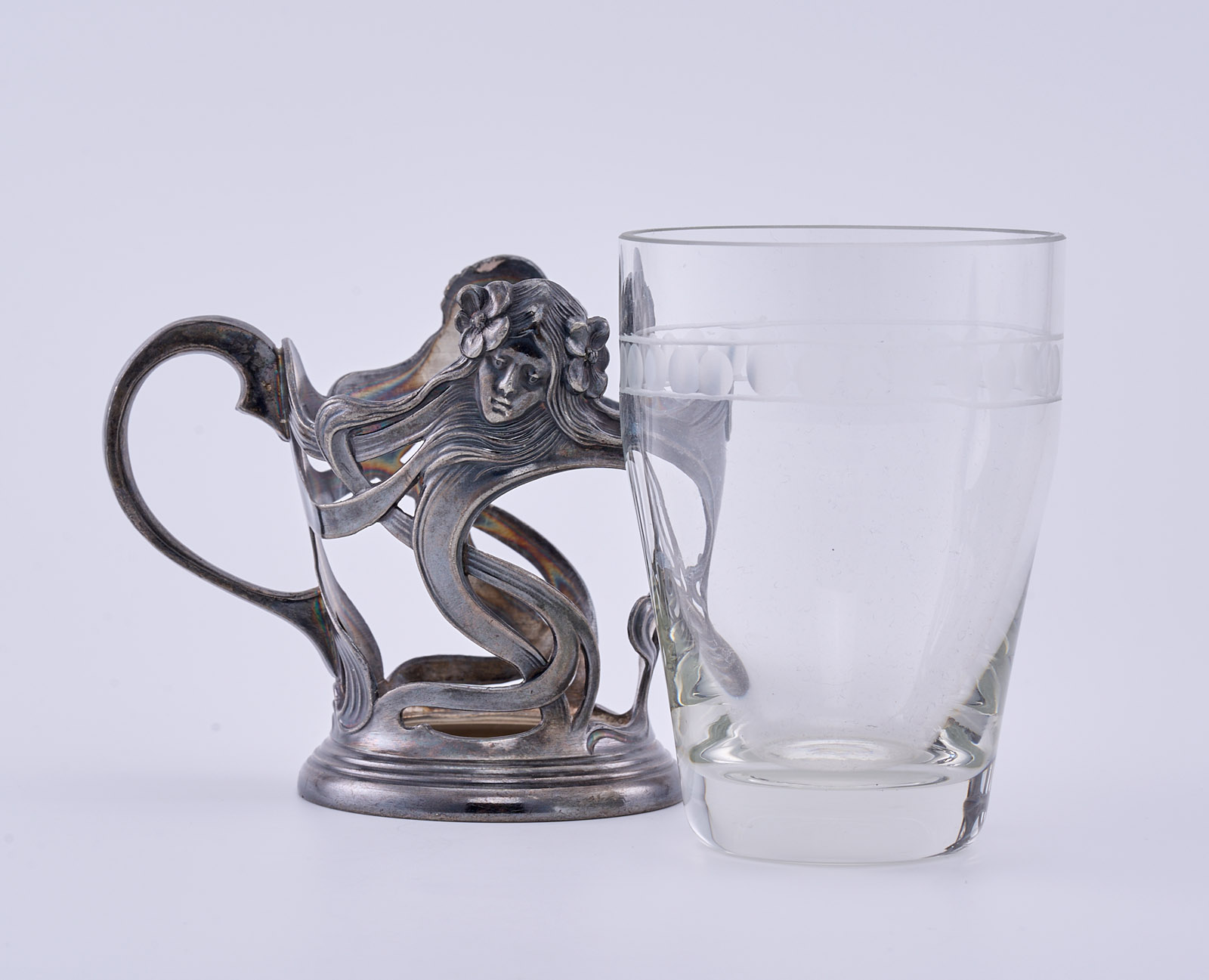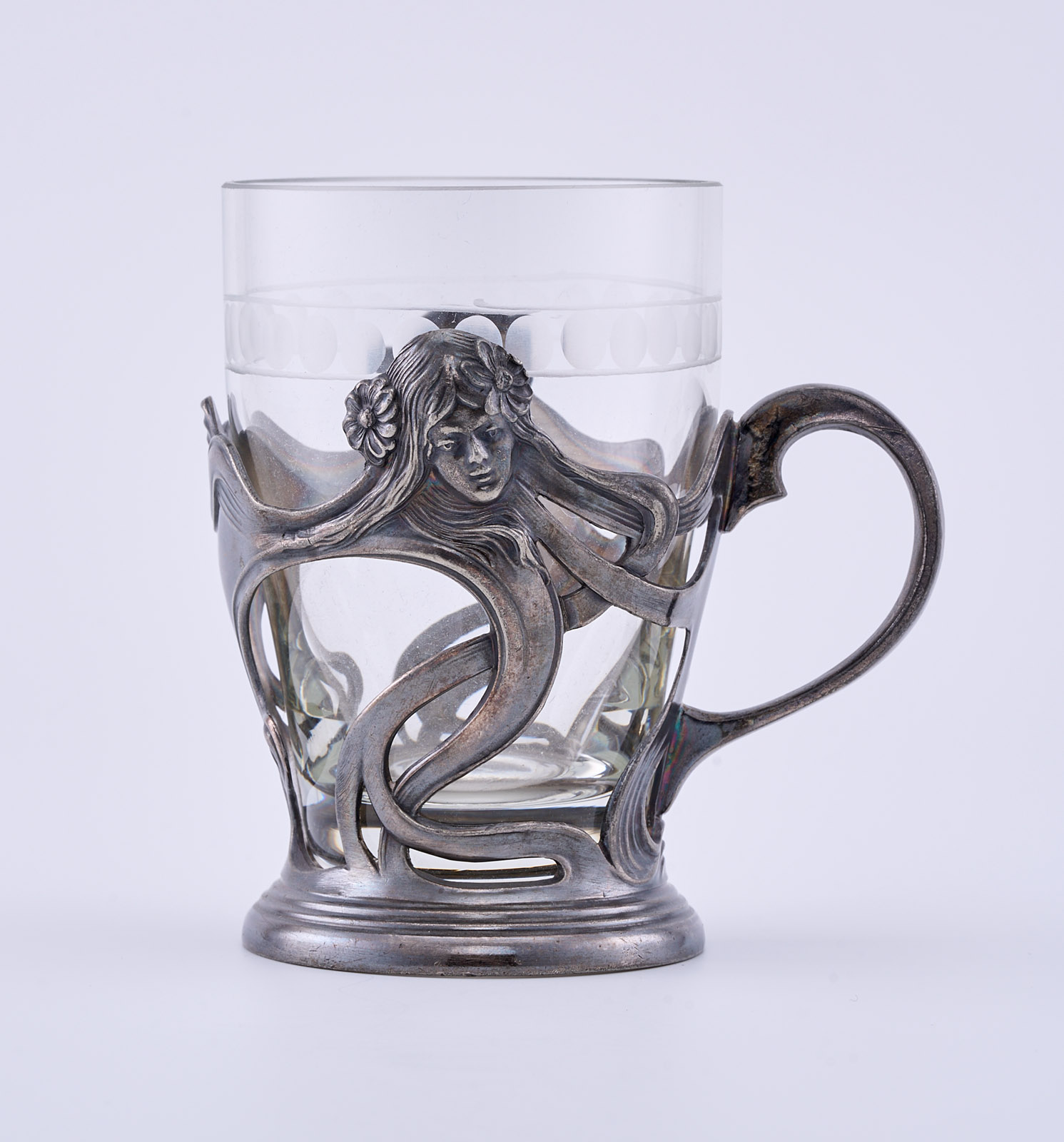 Zinn, farbloses Glas. Fa. Albert Köhler (gemarkt „A.K. & Cie.“). Becherglas m. Kugelschliff-Band in Halter auf Rundfuß m. Rundhenkel, Wandung gebildet aus Bandelwerk m. Frauenköpfen, reich geschweift und reliefiert. Oberflächen partiell minimal berieben, Glaskante minimal bestoßen, Halter m. 1 leicht gestauchtem Bogen. H 9,8 cm