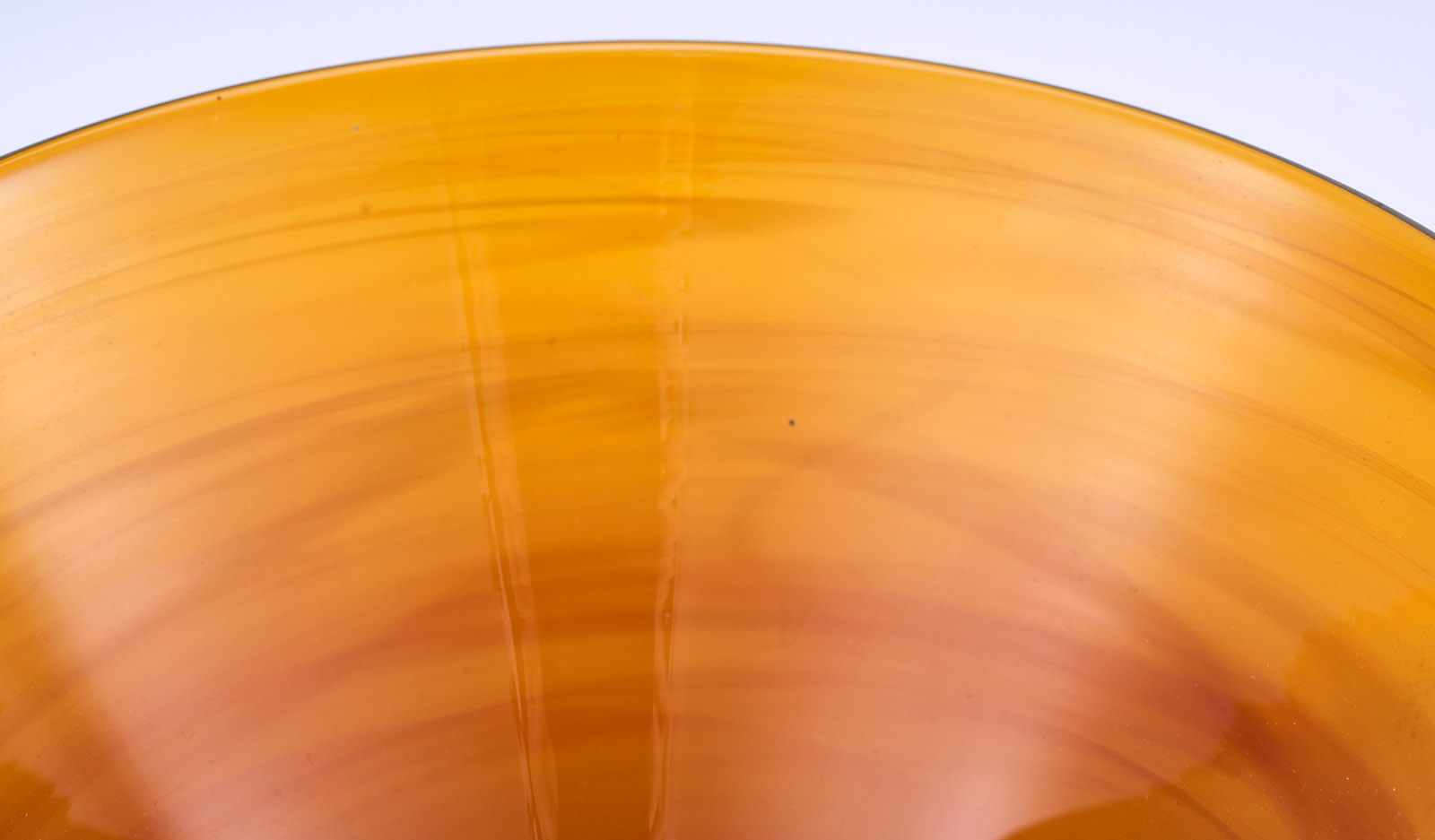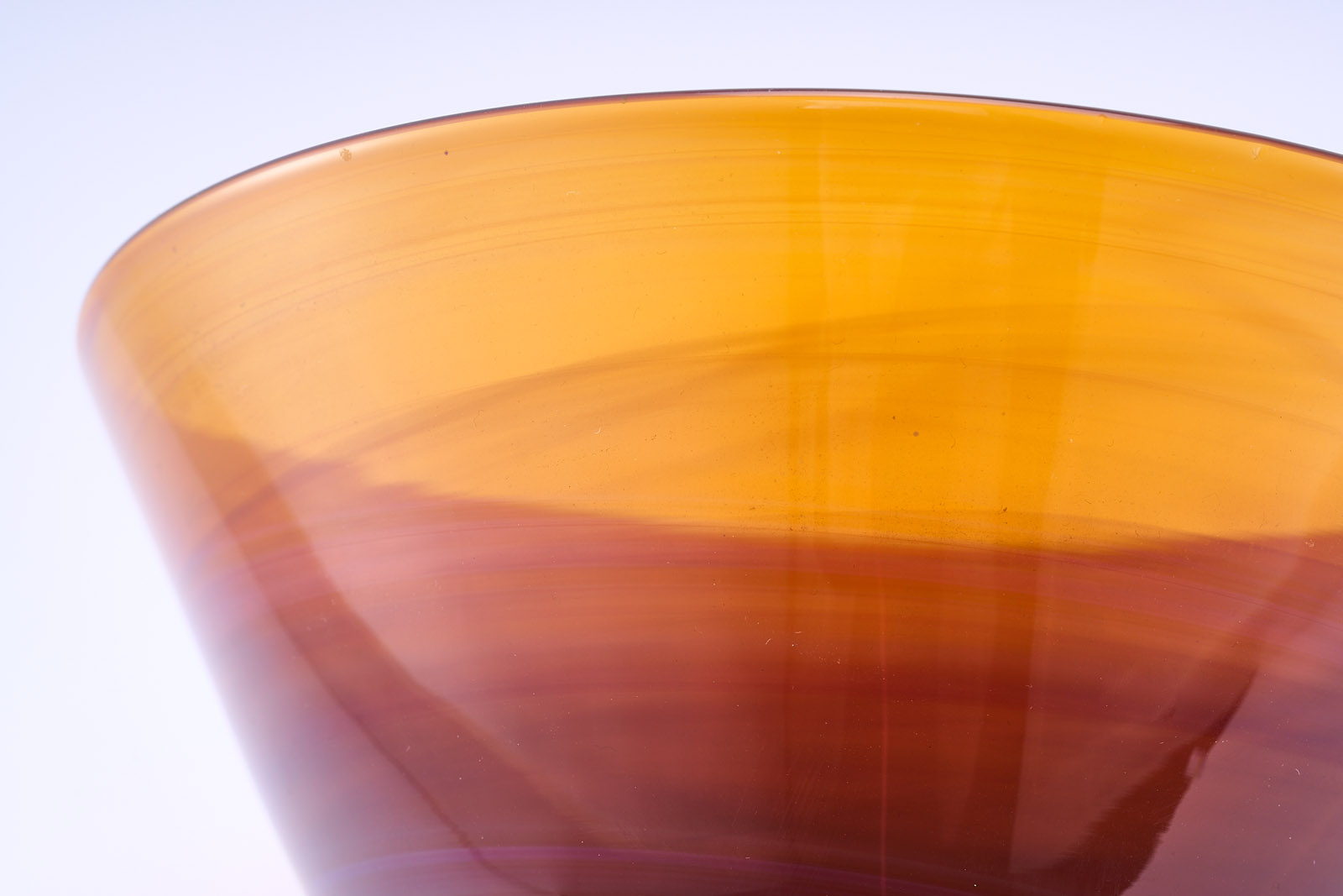 Bernsteinfarbenes Glas m. rotbrauner Schattierung. Stark kon. Form, zu kl. rd. Stand zuschwingend. Boden m. auspoliertem Abriß, darin geritzt sign. u. dat. „Baker 8-1986 Labino Studio“. D 20 cm. Prov.: Sammlung Ingeborg Schäffler-Wolf, Heilbronn.